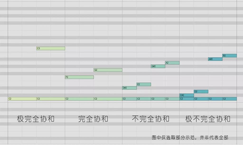协和音程与不协和音程根据协和的程度可分为完全协和音程(纯1、4、5、8度)和不完全协和音程(大、小3、6度)。除此之外都是不协和音程。