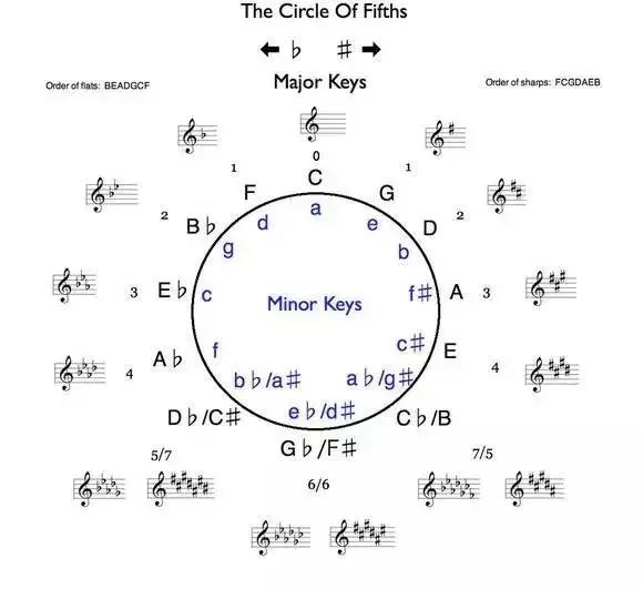 每一条小调都是大调的下方小三度,即向左数三个半音。比如C大调,向下数三个半音就是a小调。值得注意的是,大调和小调一定是三度关系。比如A大调向下数三个半音是#f小调,我们就不能说是bg小调。因为f和A是三度关系,而g和A只是二度关系。