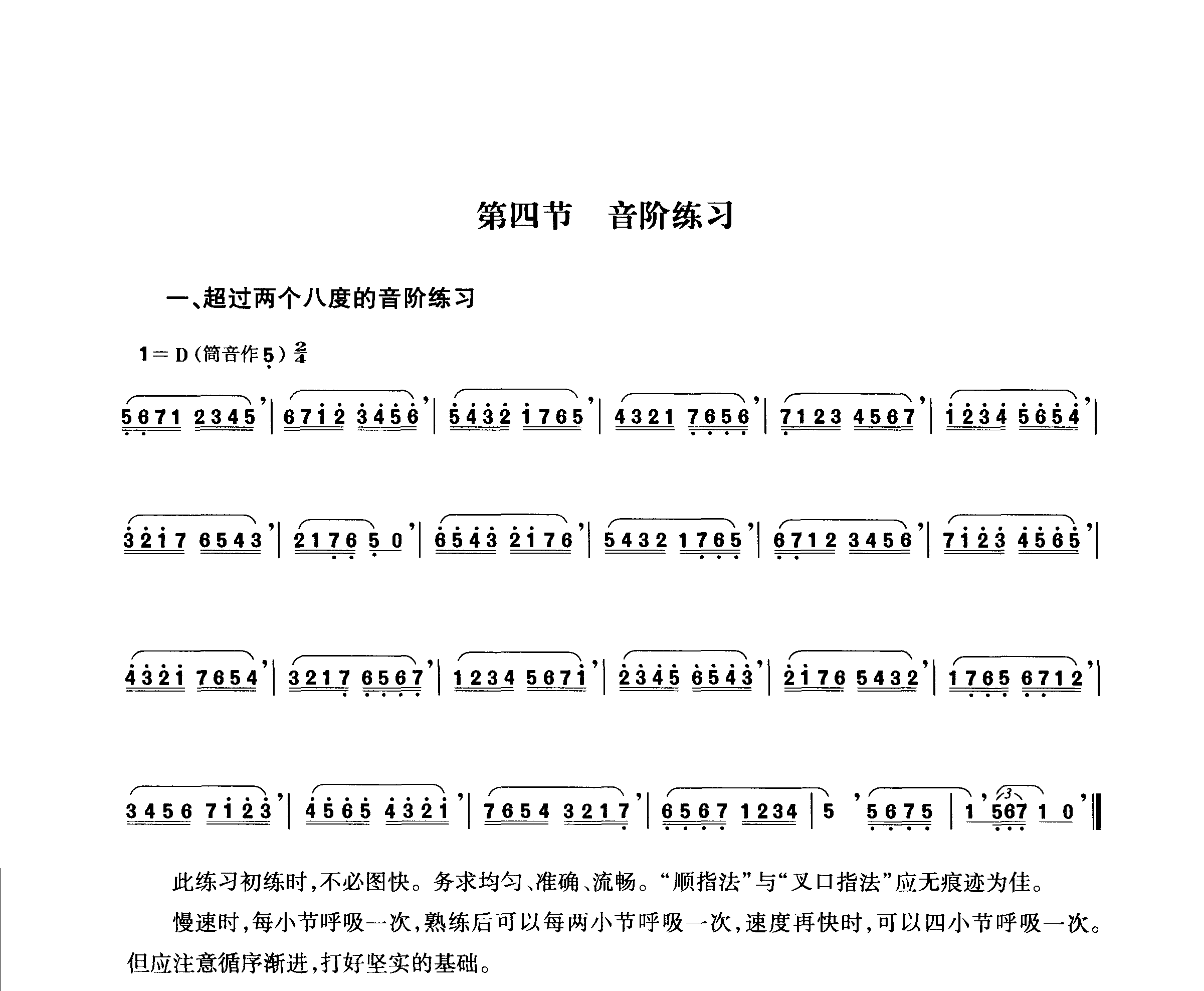 此练习初练时,不必图快。务求均匀,准确、流畅。“顺指法”与“叉口指法”应无痕迹为佳。