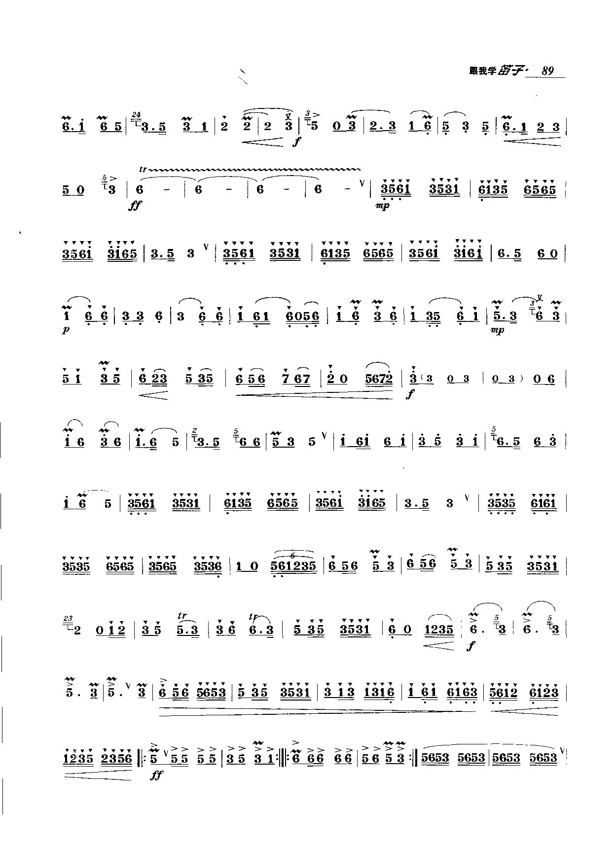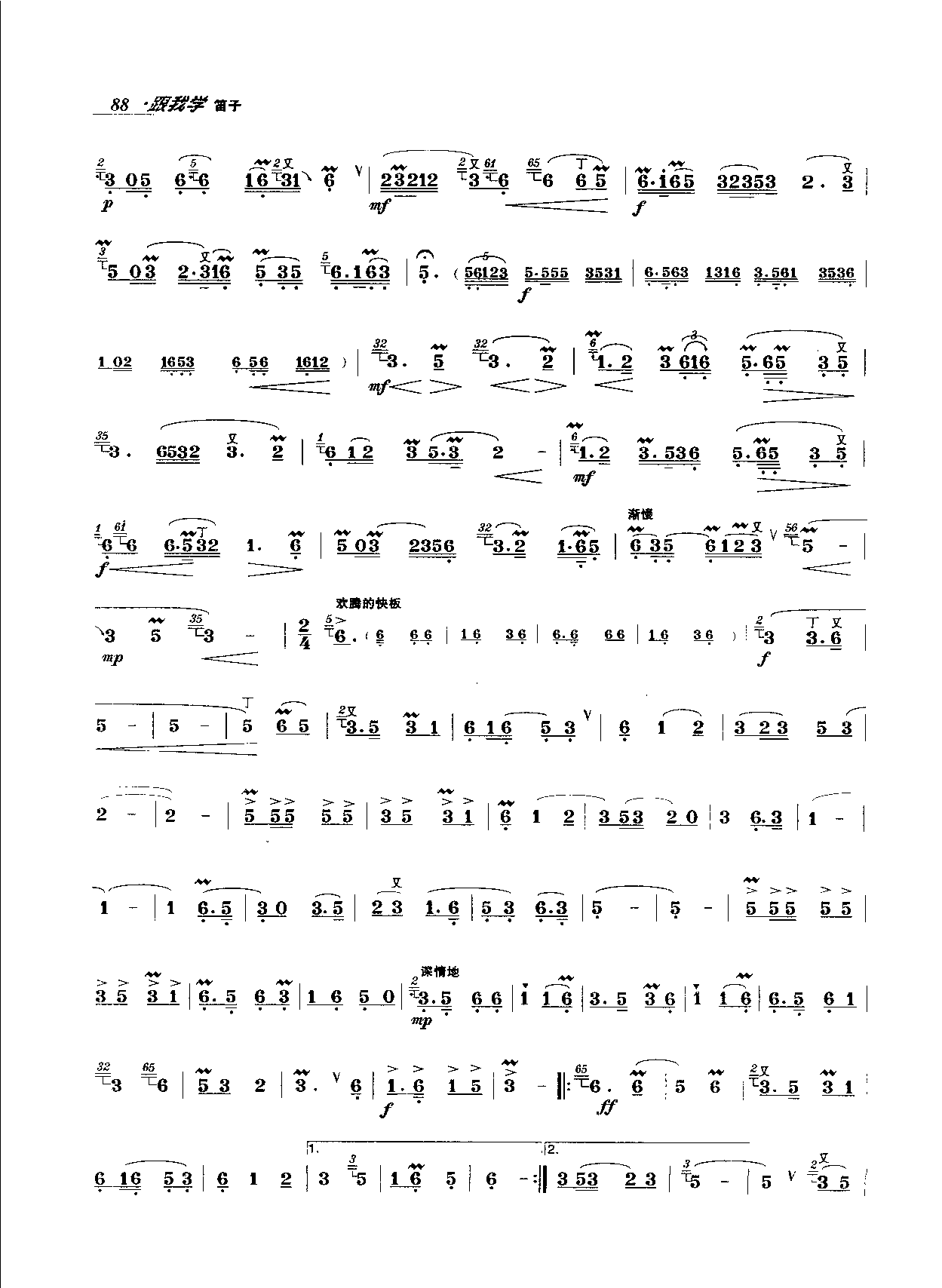 演奏宜使柔润与激情相互辉映,以把深切的情意富有神韵地呈现出来。吐音清秀通畅。干净利索,并注意安排好吸气点。各音区要变换自如,高音要富于共鸣感。高音Sol(5)奏法:按四、六孔,超吹。