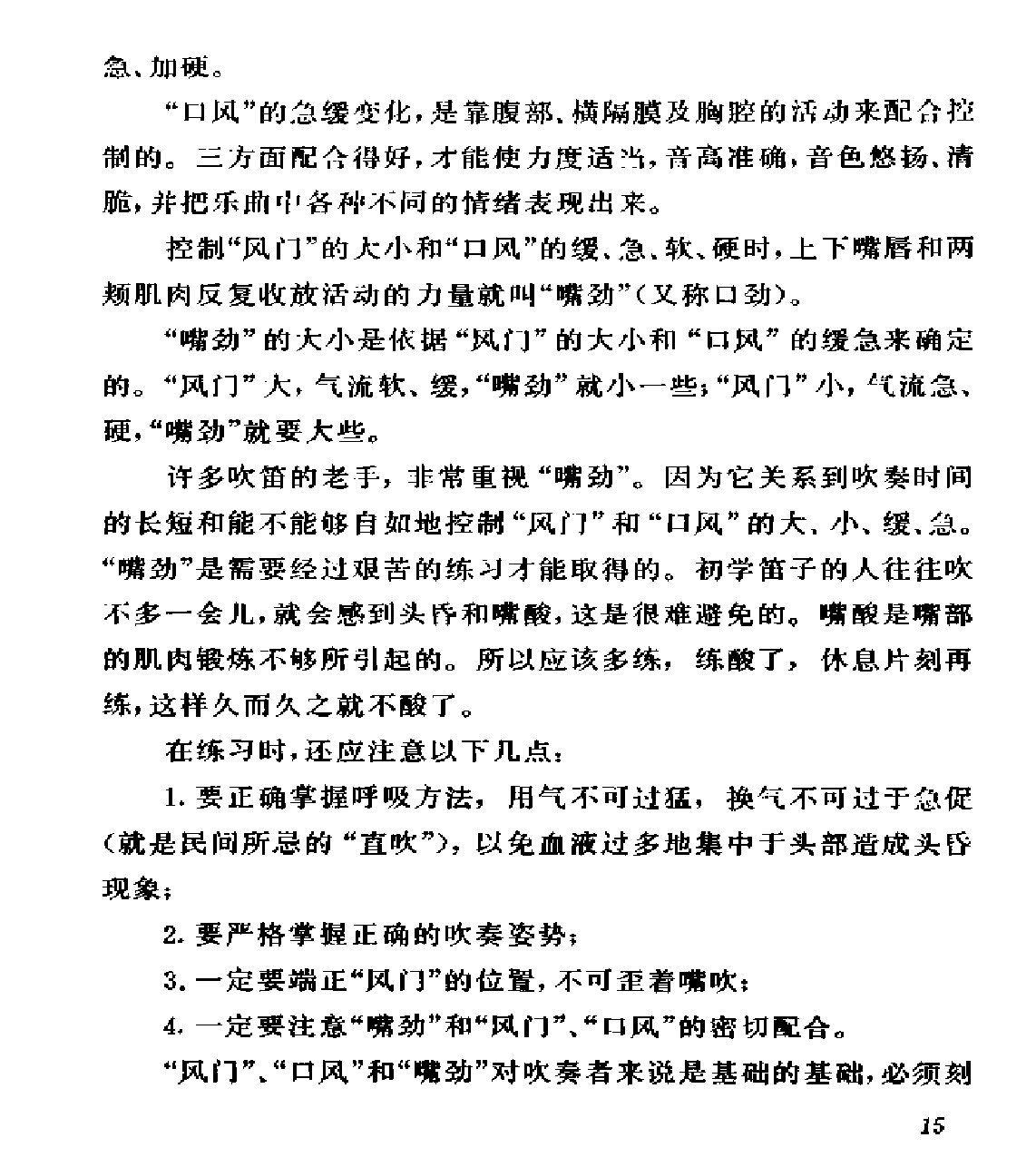 经过“风门”吹出来的气息叫做“口风”。“口风”有缓急之分,缓则软,氩则硬。在吹奏低音时,一般说来都要把“曰风”放缓一些,吹奏高音时,“口风”应随乐曲的音高和强弱的需要而适当加