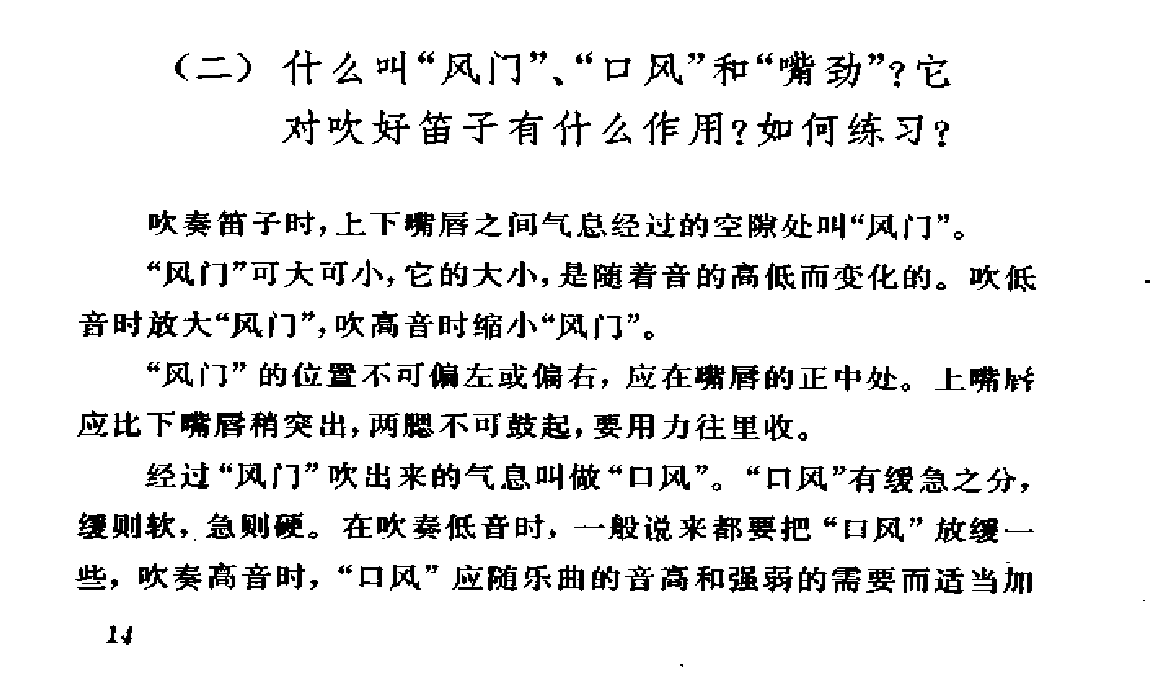 “风门”的位置不可偏左或偏右,应在啸唇的正中处。上嘴:应比下嘴唇稍突出,两腮不可鼓起,要用力往里收。
