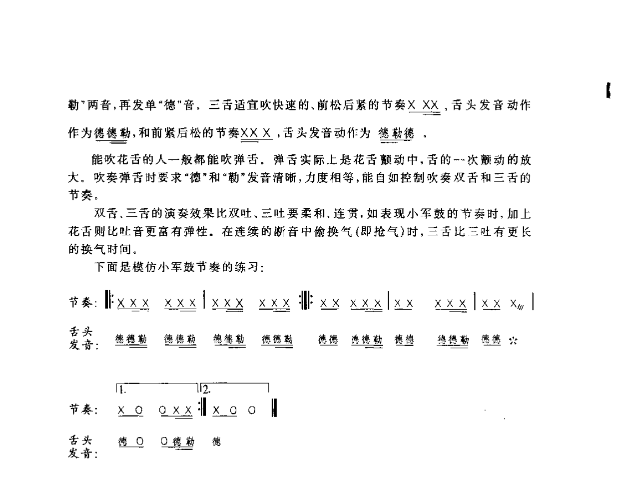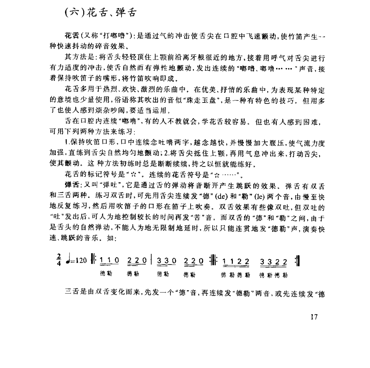 花舌(又称“打嘟噜"):是通过气的冲击使舌尖在口腔中飞速颤动,使竹笛产生--种快速抖动的碎音效果。