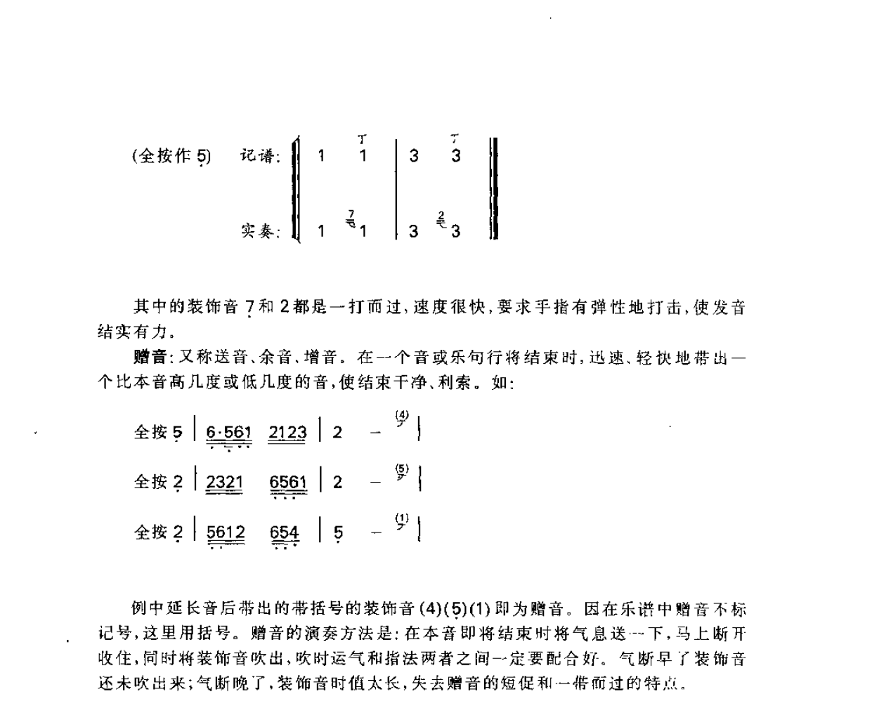 在民间艺人中有“死谱活吹"-·说,也就是说在吹粲乐曲时,内容和感情必须有一个再创造的过程,也就是在原乐曲中适当灵活地运用各种竹笛技巧和加花的手法。这里介绍的叠音.打音﹑赠啻就是在民间演奏中常用的加花手法,它与一般音乐术语中标明时值的倚音、涟音、回音等符号不同,在乐曲中--般不标出音高和时值,而是根据南北风格的特点,在乐曲中自由灵活地运用.为讲解方便还是用记号标明用处。