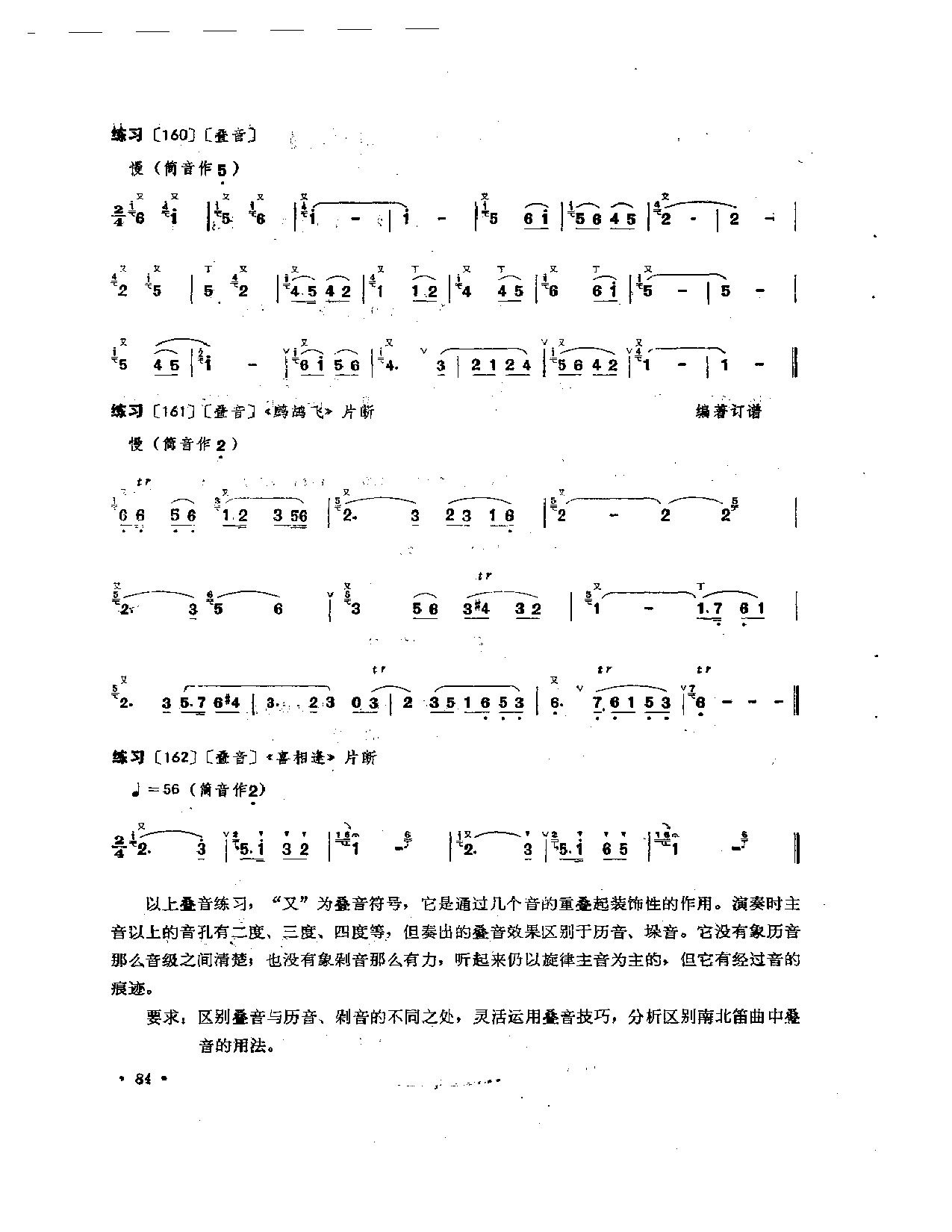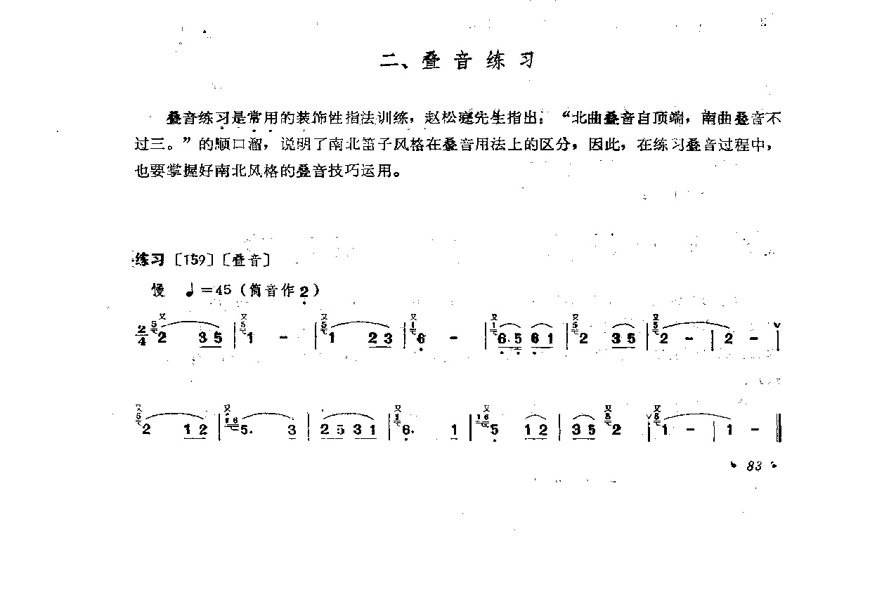 叠音练习是常用的装饰性指法训练,赵松瞎先生指出;“北曲叠啻自顶端,南曲叠音不过三。”的顺口溜,说明了南北笛子风格在叠誓用法上的区分,因此,在练习叠音过程中,也要掌握好南北风格的叠音技巧运用。