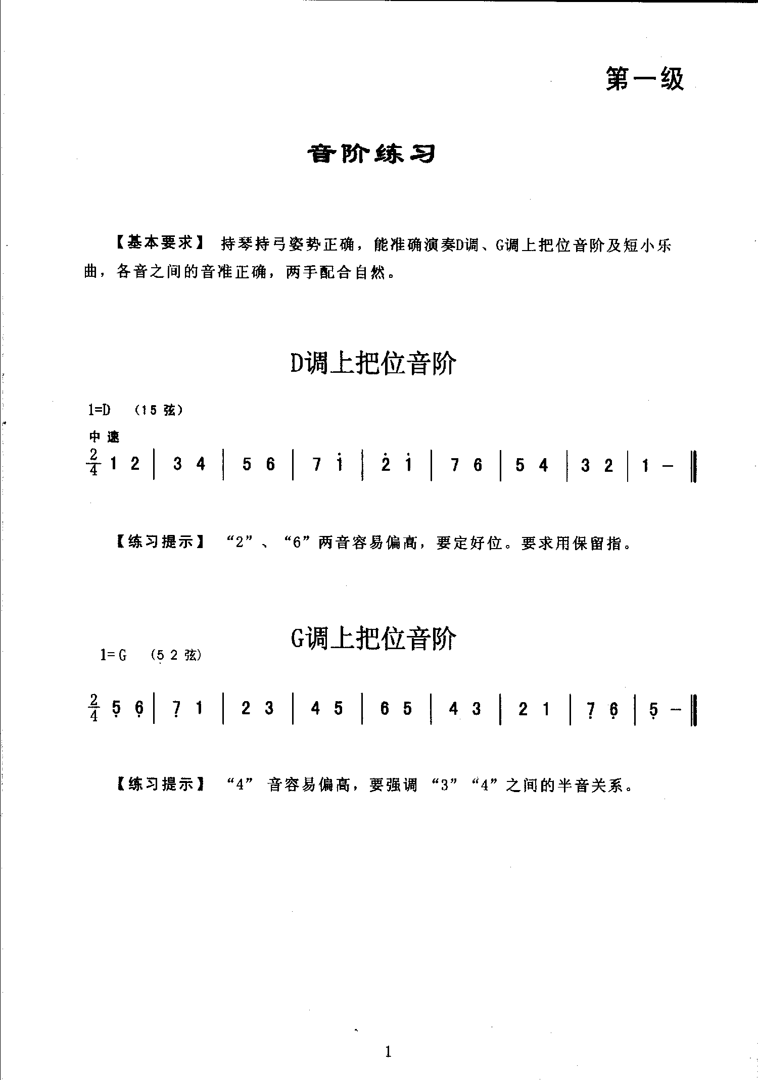 【基本要求】持琴持弓姿势正确,能准确演奏D调、G调上把位音阶及短小乐曲,各音之间的音准正确,两手配合自然。