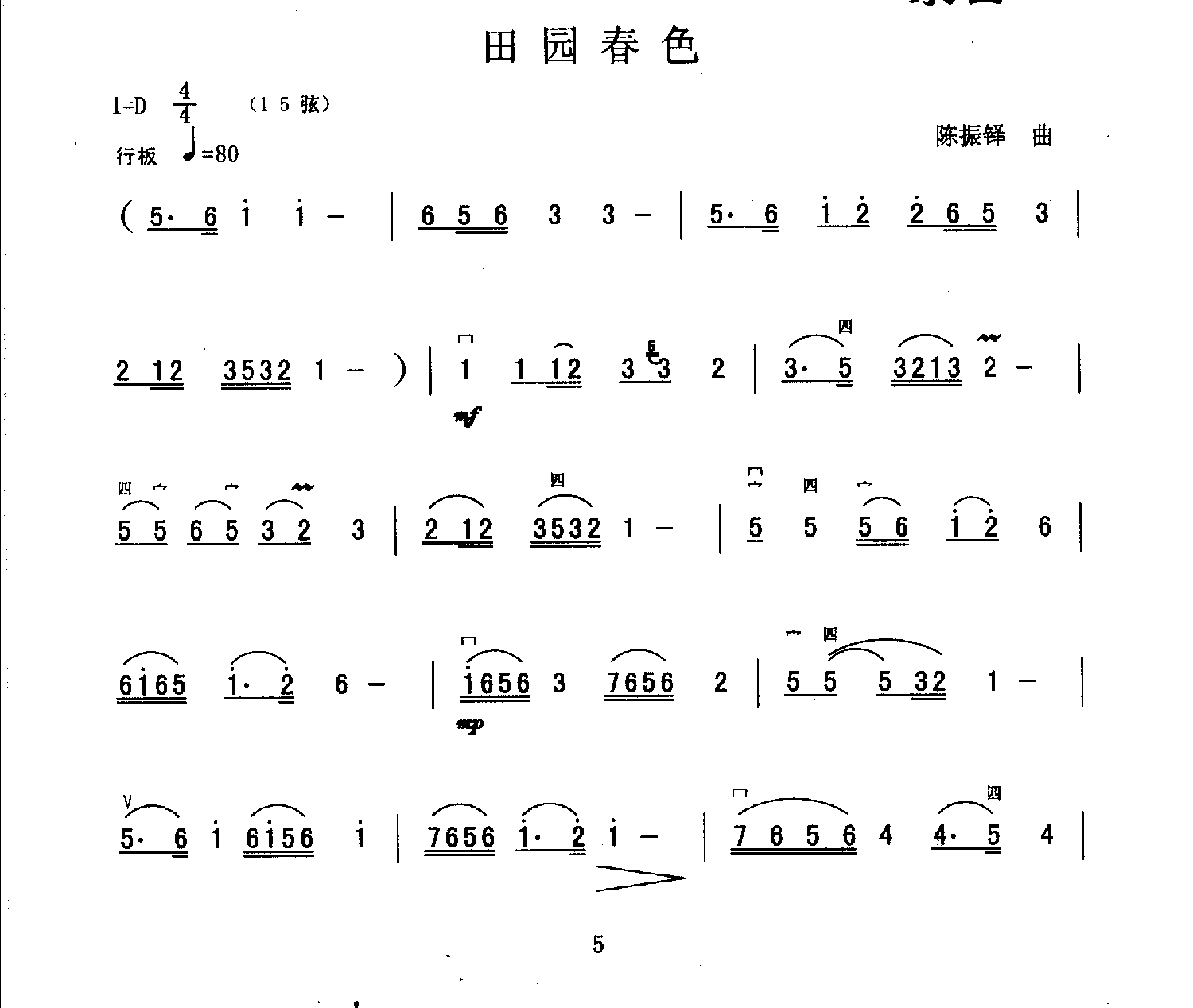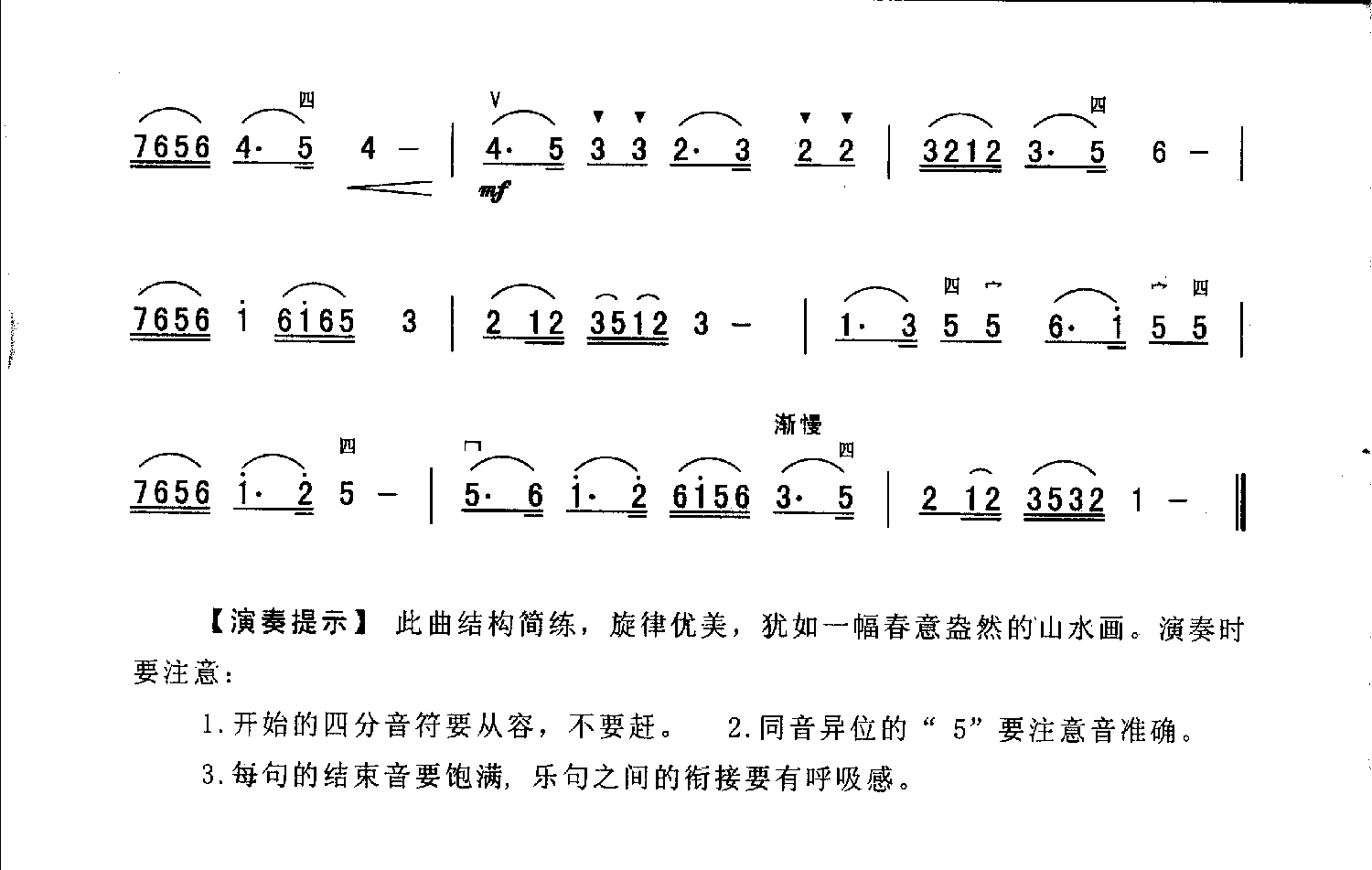 【演奏提示】此曲结构简练,旋律优美,犹如一幅春意盎然的山水画。演奏时要注意: