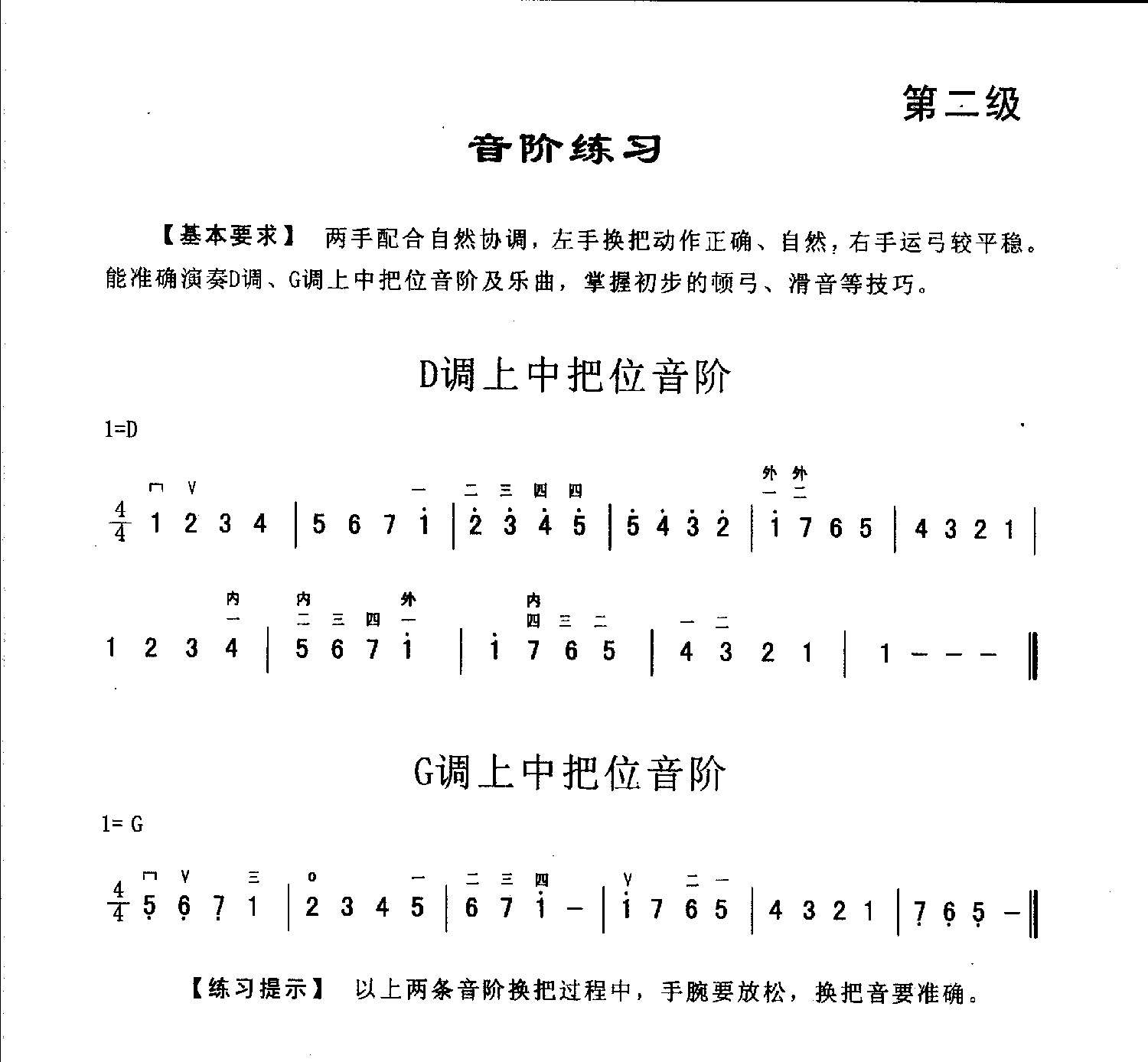 【基本要求】两手配合自然协调,左手换把动作正确、自然,右手运弓较平稳。能准确演奏D调、G调上中把位音阶及乐曲,掌握初步的顿弓、滑音等技巧。