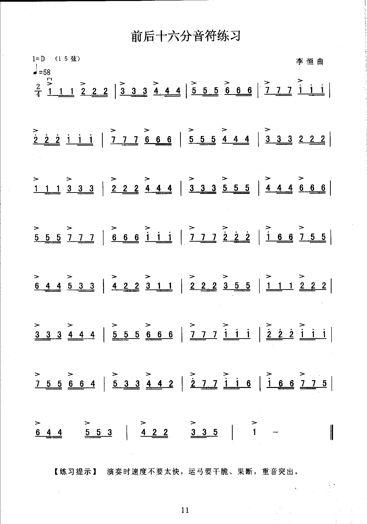 二胡练习曲《前后十六分音符练习&李恒曲》第二级,【练习提示】演奏时速度不要太快,运弓要干脆、果断,重音突出。