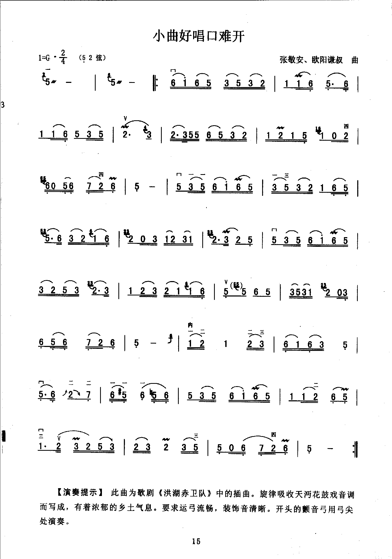 【演奏提示】此曲为歌剧《洪湖赤卫队》中的插曲。旋律吸收天沔花鼓戏音调而写成,有着浓郁的乡土气息。要求运弓流畅,装饰音清晰。开头的颤音弓用弓尖处演奏。