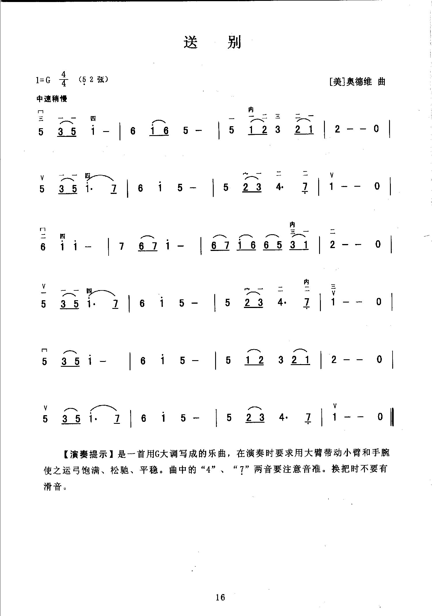 【演奏提示】是一首用G大调写成的乐曲,在演奏时要求用大臂带动小臂和手腕使之运弓饱满、松驰、平稳。曲中的“4”、“?”两音要注意音准。换把时不要有滑音。二胡考级乐曲《送别&[美]奥德维曲》第二级高清电子版乐谱歌词图片是器乐学习网于2023年06月13日 12:29:44更新分享的二胡曲谱;资源收录于二胡曲谱栏目中;器乐学习网免费分享二胡考级乐曲《送别&[美]奥德维曲》第二级简谱与五线谱歌谱图片,欢迎在线免费下载;器乐学习网无需注册会员,直接免费下载各类乐器学习资源及乐谱。