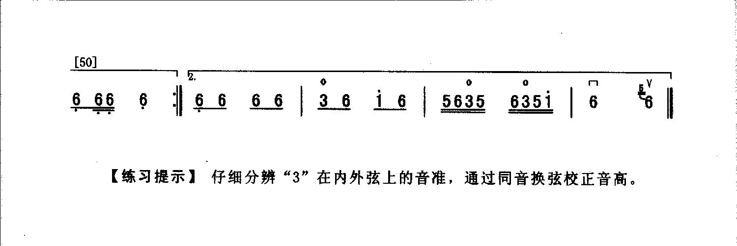 二胡练习曲《F调音准练习&薛首中曲》第三级,【练习提示】仔细分辨“3”在内外弦上的音准,通过同音换弦校正音高。