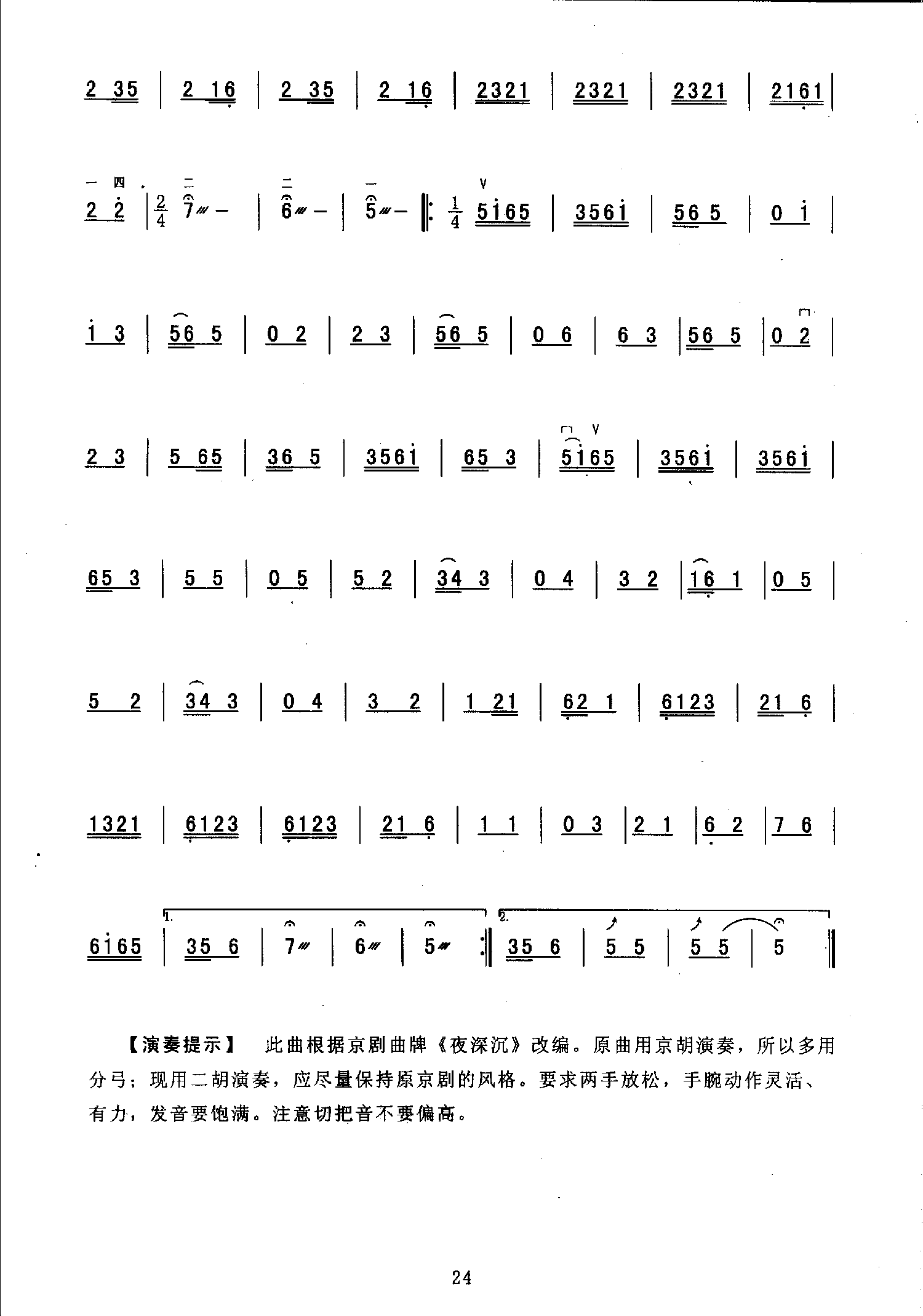 二胡考级乐曲《剑舞&古典舞曲》第三级,【演奏提示】此曲根据京剧曲牌《夜深沉》改编。原曲用京胡演奏,所以多用分弓;现用二胡演奏,应尽量保持原京剧的风格。要求两手放松,手腕动作灵活、有力,发音要饱满。注意切把音不要偏高。