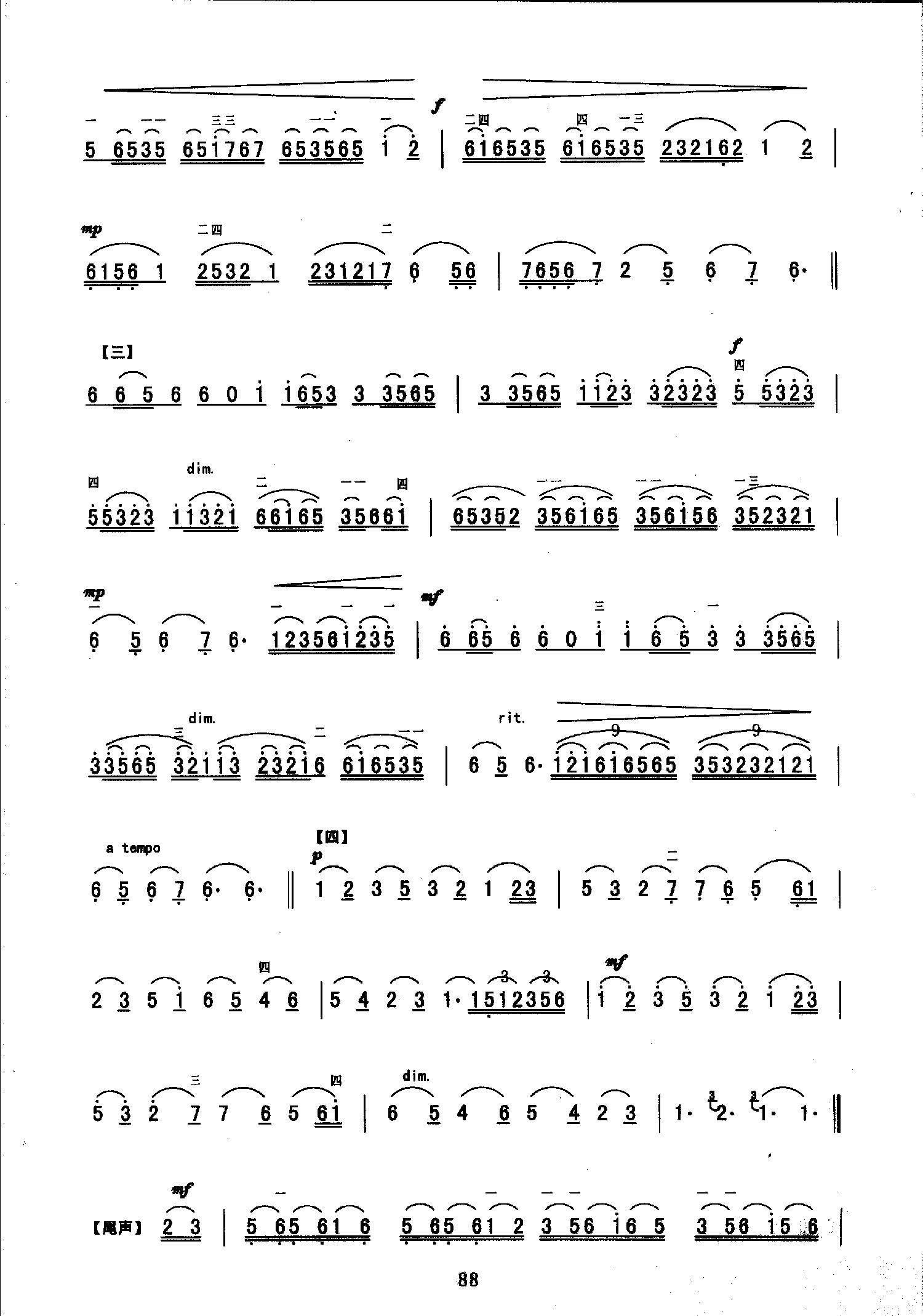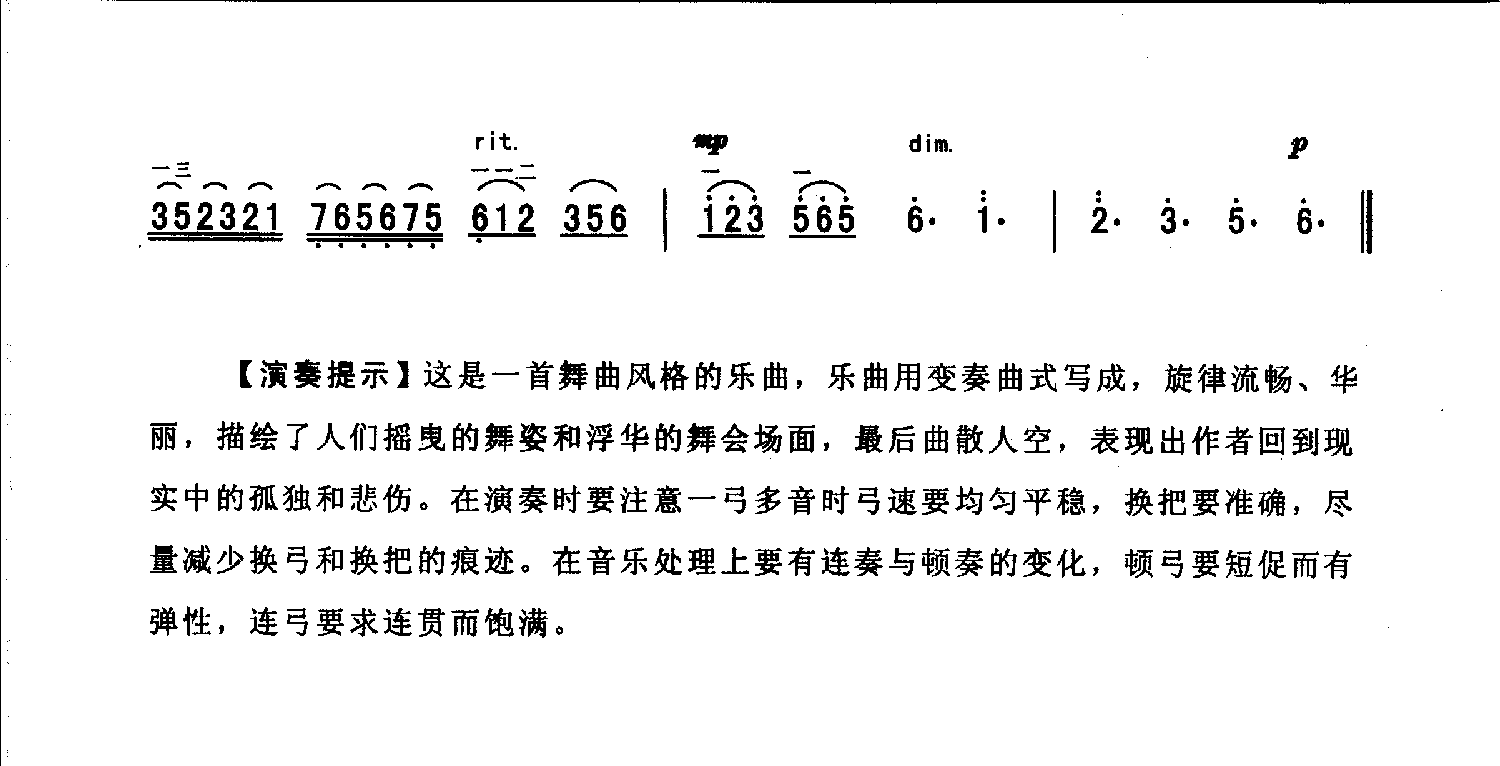【演窦提示】这是一首舞曲风格的乐曲,乐曲用变奏曲式写成,旋律流畅、华丽,描绘了人们摇曳的舞姿和浮华的舞会场面,最后曲散人空,表现出作者回到现实中的孤独和悲伤。在演奏时要注意一弓多音时弓速要均匀平稳,换把要准确,尽量减少换弓和换把的痕迹。在音乐处理上要有连奏与顿奏的变化,顿弓要短促而有弹性,连弓要求连贯而饱满。
