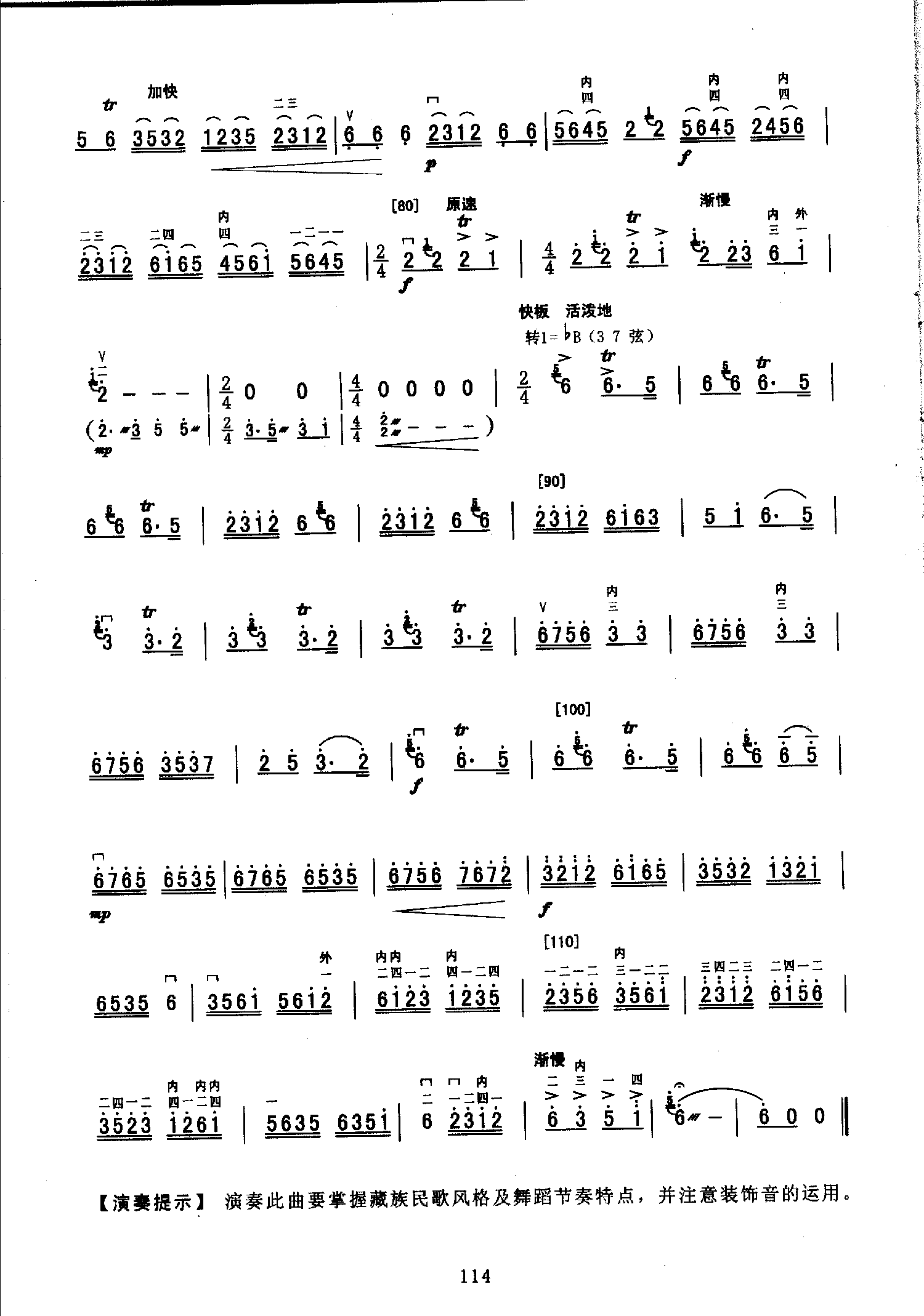 二胡考级乐曲《赞歌&王竹林曲》第七级,【演妻捉示】演奏此曲要掌握藏族民歌风格及舞蹈节奏特点,并注意装饰音的运用。