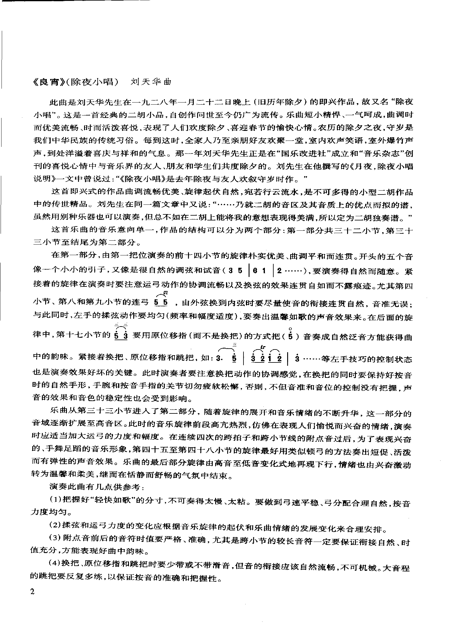 此曲是刘天华先生在一九二八年一月二十二日晚上(旧历年除夕)的即兴作品,故又名“除夜小唱”。这是一首经典的二胡小品,自创作问世至今仍广为流传。乐曲短小精悍、一气呵成,曲调时而优美流畅,时而活泼喜悦,表现了人们欢度除夕﹑喜迎春节的愉快心情。农历的除夕之夜,守岁是我们中华民族的传统习俗。每到这时,全家人乃至亲朋好友欢聚一堂,室内欢声笑语,室外爆竹声声,到处洋溢着喜庆与祥和的气息。那一年刘天华先生正是在“国乐改进社"成立和“音乐杂志"创刊的喜悦心情中与音乐界的友人,朋友和学生们共度除夕的。刘先生在他撰写的《月夜,除夜小唱说明》一文中曾说过:“《除夜小唱》是去年除夜与友人欢叙守岁时作。”