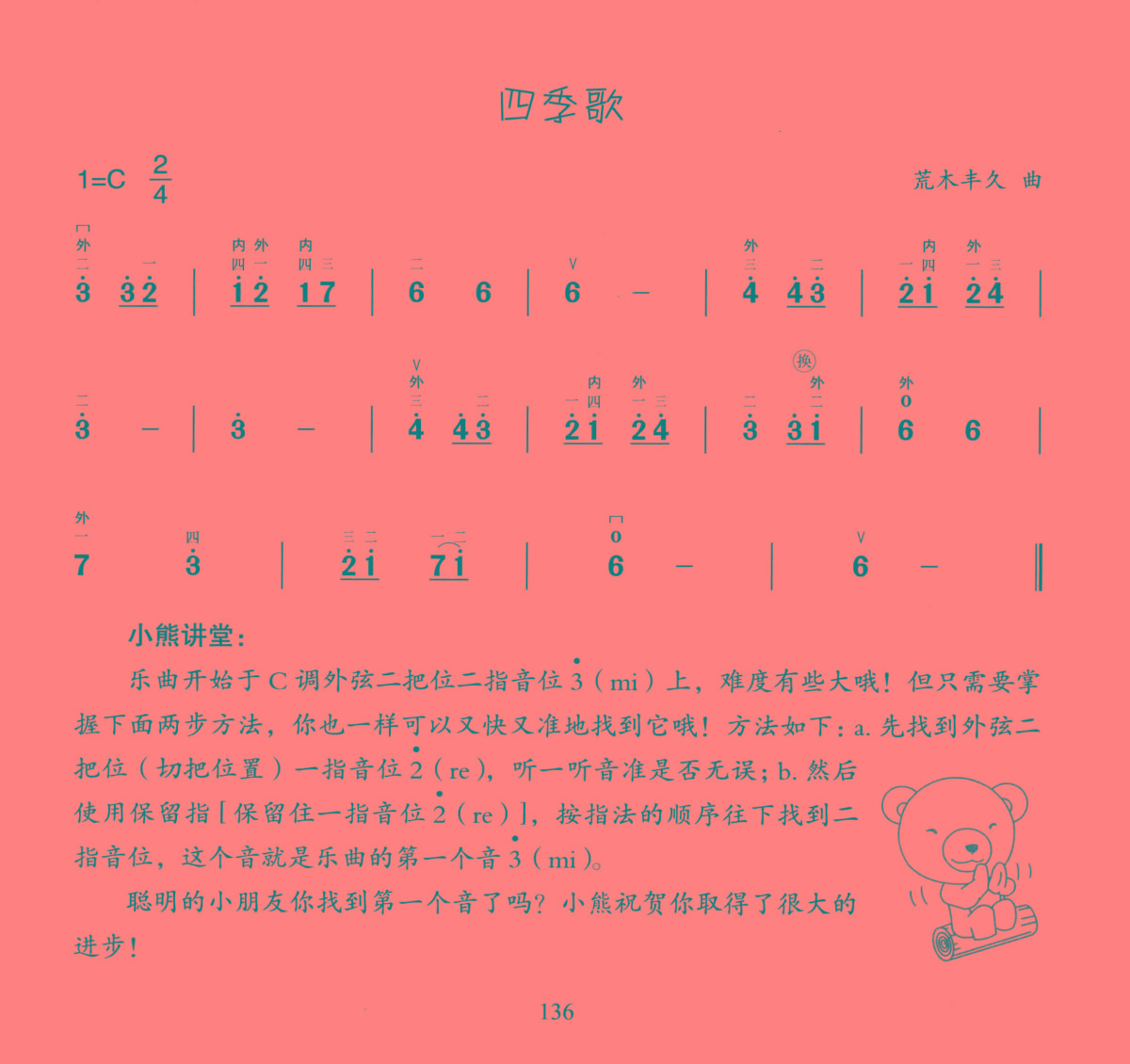 少儿二胡乐谱《四季歌》C调左手换把到第二把位高清电子版乐谱歌词图片是器乐学习网于2023年08月06日 22:41:39更新分享的二胡曲谱;资源收录于二胡曲谱栏目中;器乐学习网免费分享少儿二胡乐谱《四季歌》C调左手换把到第二把位简谱与五线谱歌谱图片,欢迎在线免费下载;器乐学习网无需注册会员,直接免费下载各类乐器学习资源及乐谱。