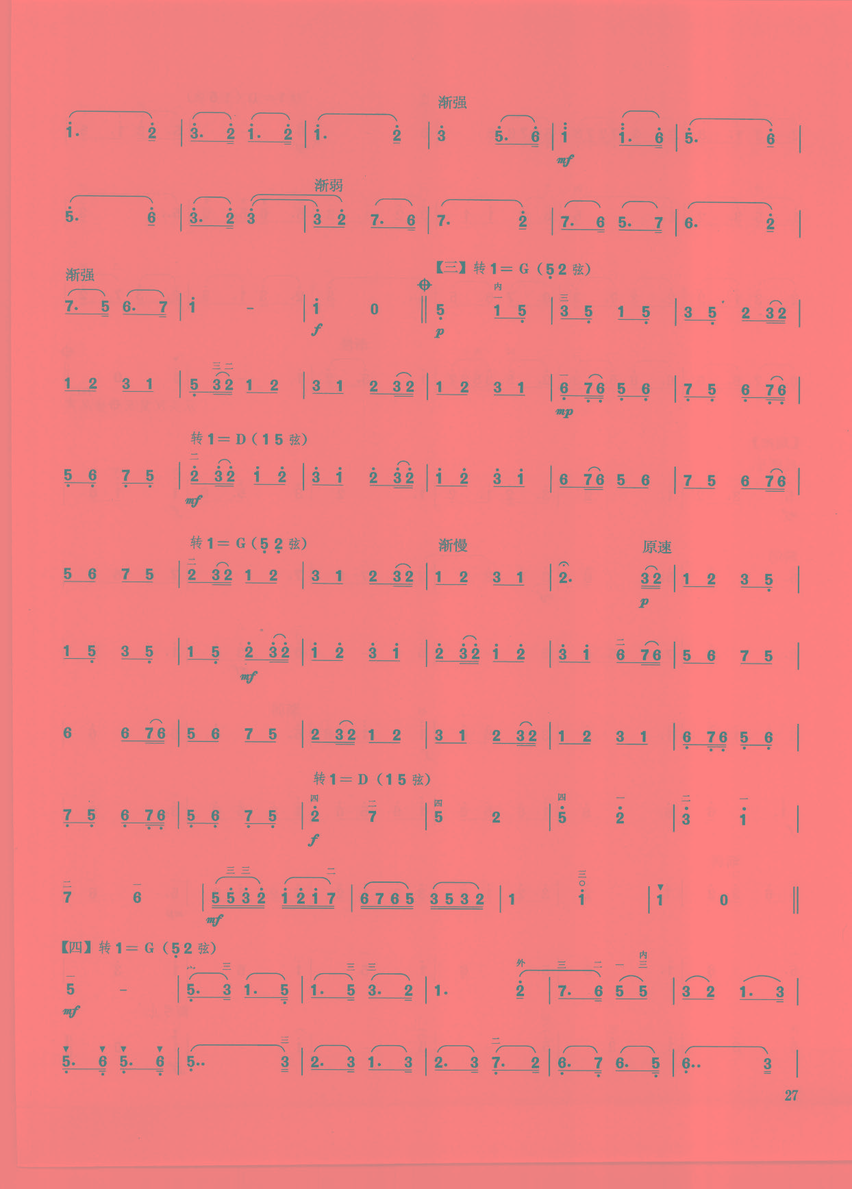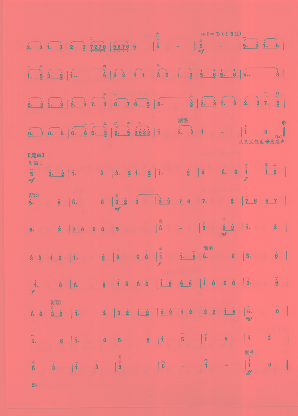 三即C ,由C与C1两部分组成。此段带有展开性结构特征,不但采用频繁的转调移位手法、连续运用了四五度模进,而且音型化的短小乐汇也构成了器乐化的鲜明特征。整个第三段几乎全部都是建立在动机的四五度模进上面,以至形成了调性与调式的不断转换。这种旋律模进式发展,既表现了人们轻松愉快的精神面貌,又与其他各段形成鲜明的对比。此段中的连续转调,作者运用的是民间的转调方法,即用二胡不同的弦法来达到转调的目的。应用换弦方法来达到转调的目的的,给人感觉有上下四五度的变化。C部分整个乐段较细碎,只由一个小节不停地转调、变奏 、重复而构成。前面20小节,句句衔接紧密,转调频繁,节奏型清晰,层次感非常鲜明。C1是从渐慢后转原速开始,共24小节。此段最后转入D调的相当于大总结的一句,也可以看作是转入下一段的过渡句。整个C段的音乐与彼得·伊里奇·柴可夫斯基的《B小调第六交响曲》第三乐章的情绪颇为相似,用二胡一件乐器演奏出了此起彼伏、八方云集的宏大气势。