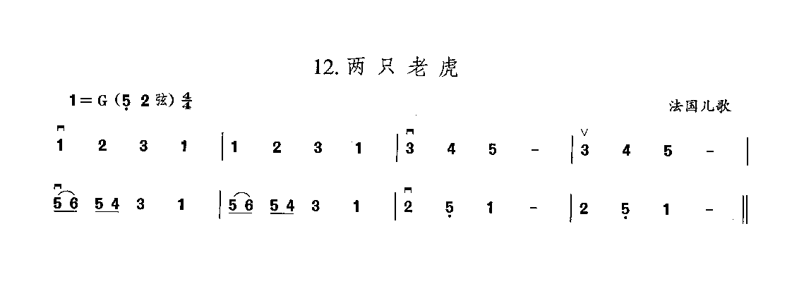 二胡简单入门曲谱《两只老虎&法国儿歌》高清电子版乐谱歌词图片是器乐学习网于2023年09月07日 09:41:41更新分享的二胡曲谱;资源收录于二胡曲谱栏目中;器乐学习网免费分享二胡简单入门曲谱《两只老虎&法国儿歌》简谱与五线谱歌谱图片,欢迎在线免费下载;器乐学习网无需注册会员,直接免费下载各类乐器学习资源及乐谱。