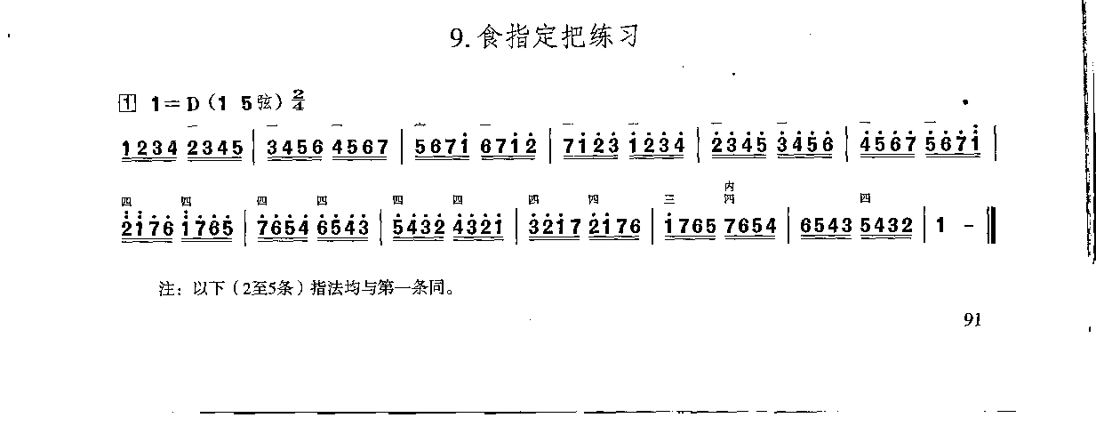 随着二胡演奏手法的不断提高,二胡曲的创作手法也不断提高,而随着创作手法的创新提高,又为二胡突破原来演奏乎法创造了条件。食指定把就是新型手法,食指每移动一个音,即和其他三个手指构成一个把位。因此在食指换把时要注意全音、半音的关系,每向下移动一音,是全音还是半音都要十分精确,动作、力量均要恰当,否则很难达到音准。对于其他手指来说,也是同样道理,半音全音指距的变换要多于传统把位,要特别注意掌握。
