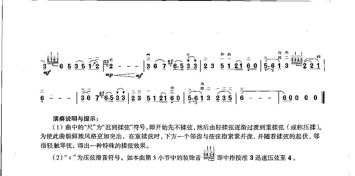(1)曲中的“尺”为“迟到揉弦"符号。即开始先不揉弦,然后由轻揉弦逐渐过渡到重揉弦(或称压揉)。为使此曲朝鲜族风格更加突出,在重揉弦时,下方一个邻指与按弦指紧紧并拢,并随着揉弦的起伏,邻指轻触琴弦、得出-种特殊的揉弦效果。