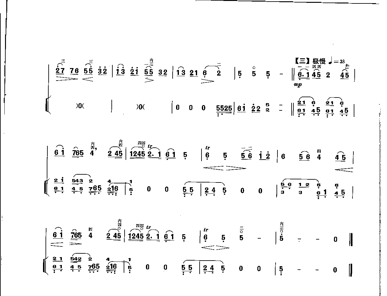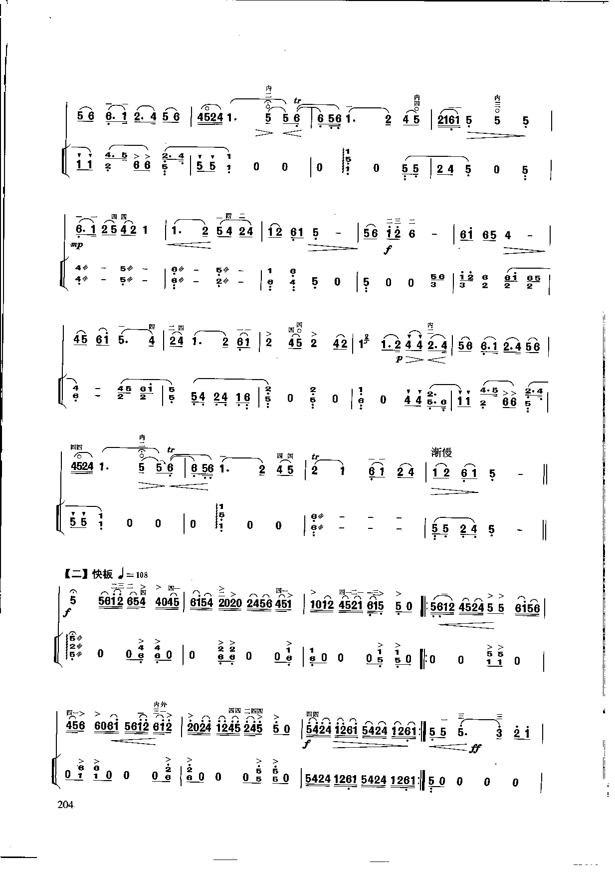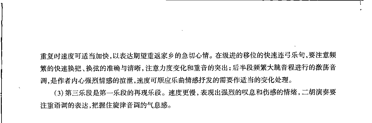 引子具有“散起”的性质,旋律环绕以商音“2”为轴心的长音平稳展开,描绘出辗转徘徊的孤寂感。主题从第13小节开始,运用“顶真格"的连接方式,具有柔嫔缠绵的陈述风格。从q式上看,开始乐句具有明显的C宫D微调式特征,而主题陈述部分则用“清角为宫”的手法,转向了下属调(C宫)方向,从亦使“思乡”内容表现得更深沉,也使主题更显幽雅古朴。切分节奏的连续运用(见第20小节) ,产生极不稳定的律动感,而使音乐极富动为感。