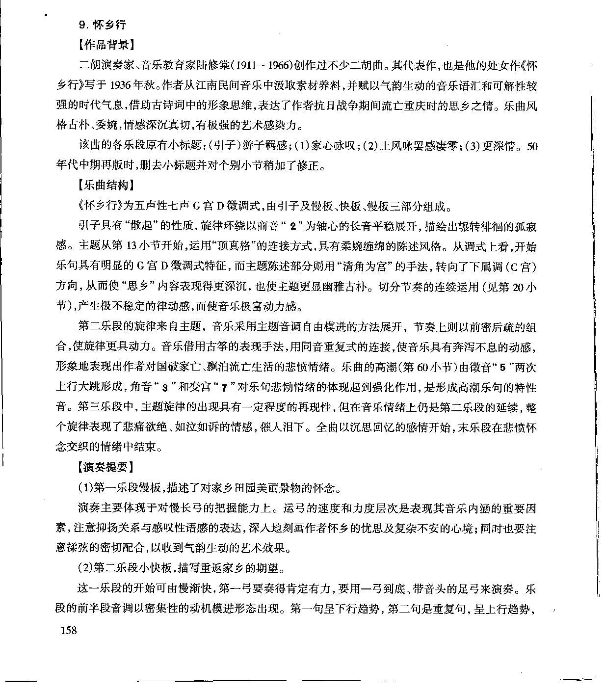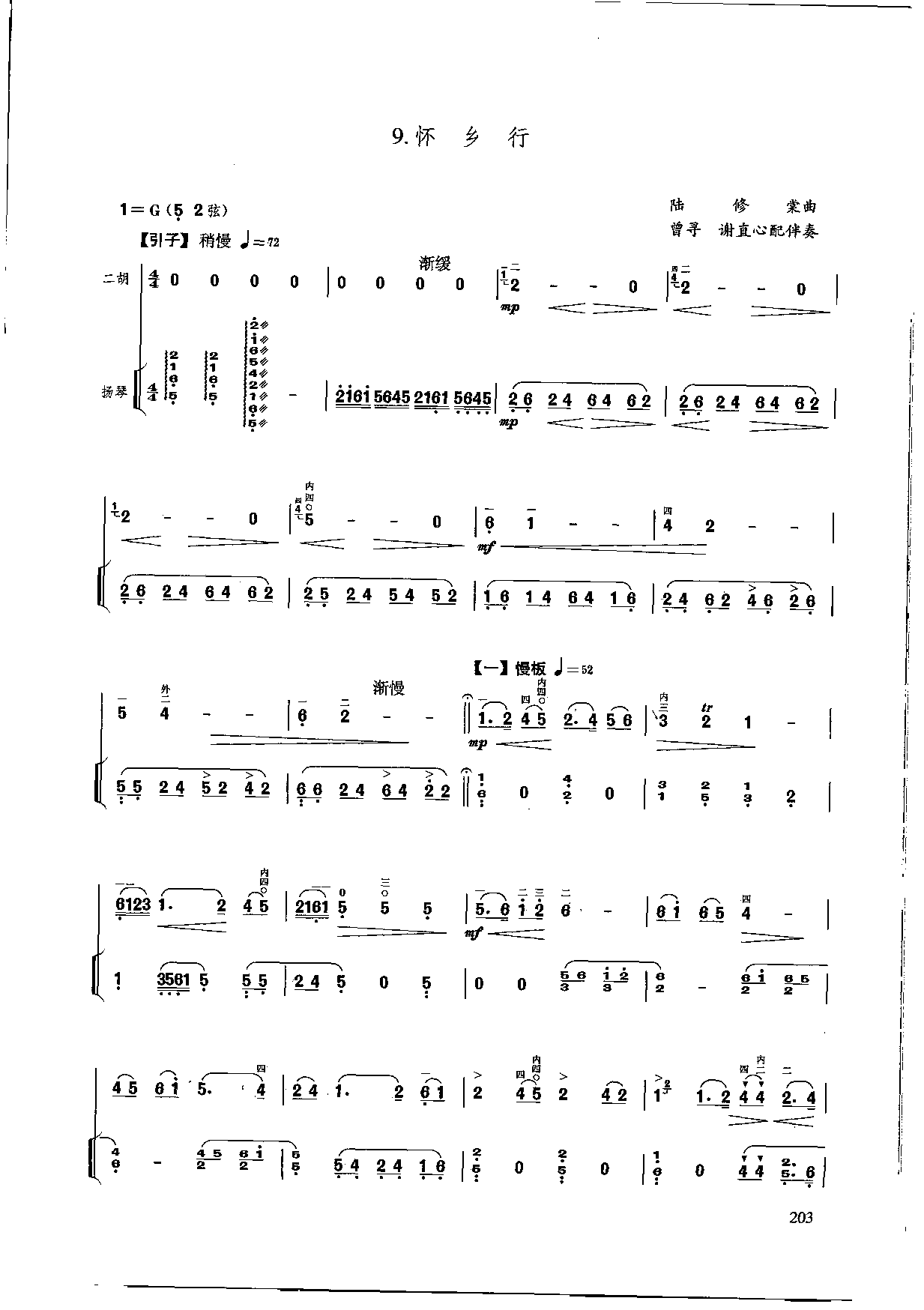 《怀乡行》为五声性七声G宫D微调式,由引子及慢板.快板.慢板三部分组或。