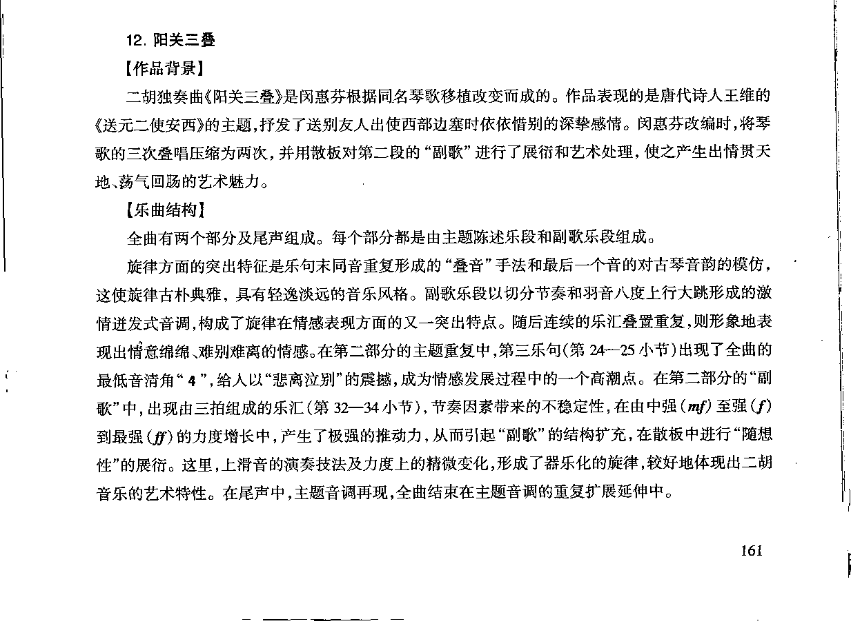 二胡独奏曲《阳关三叠》是闵惠芬根据同名琴歌移植改变而成的。作品表现的是唐代诗人王维的《送元二使安西》的主题,抒发了送别友人出使西部边塞时依依惜别的深挚感情。闵惠芬改编时,将琴歌的三次叠唱压缩为两次,并用散板对第二段的“副歌”进行了展衍和艺术处理,使之产生出情贯天地、荡气回肠的艺术魅力。