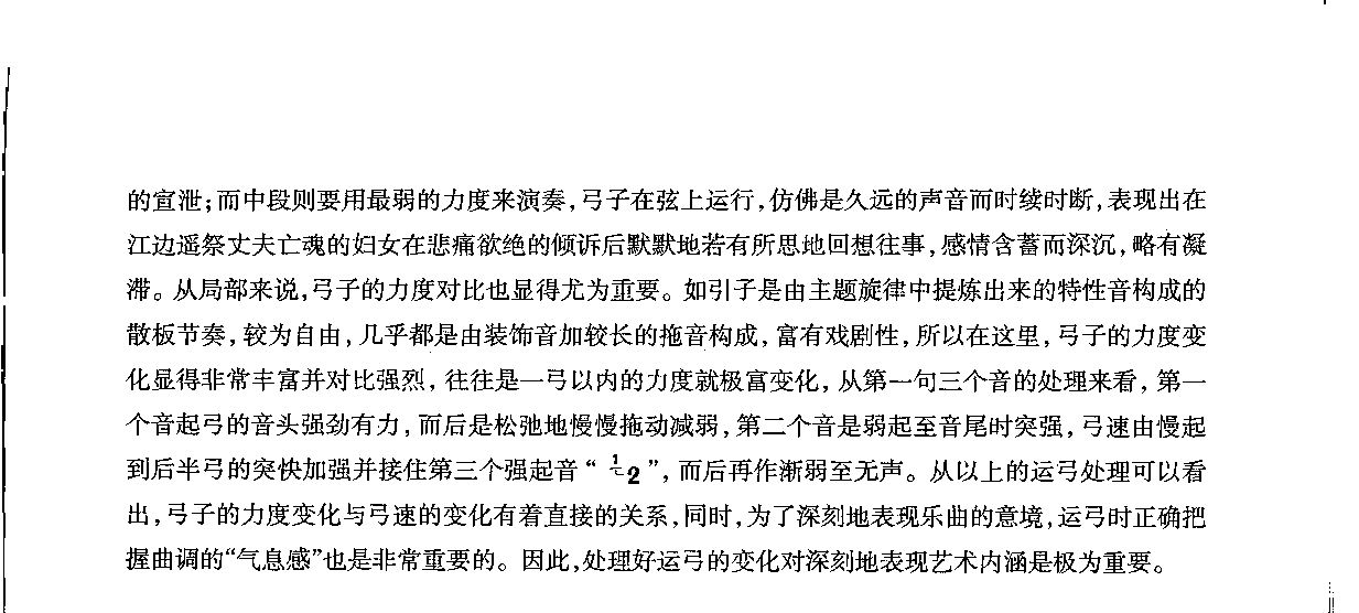 主题旋律呈环绕式波浪起伏进行。在前疏后密的节奏律动变化下,八度、十度音程的大跳进行形象地表达出情感的强烈起伏波动。乐思的展开鲜明而有层次,音乐情感得以强烈和夸张地渲染,增强了乐曲的艺术感染力。合尾音调“53- "在结构中具有重要作用。与倾诉性主题旋律不同的是,第二乐段“思忆性”旋律表现为密集环绕性的直线进行,节奏则呈现出前密后疏的律动特征,形成了与第一乐段旋律陈述方式的对比。等音二度转调,是形成两个主题对比的重要因素,成功地将人们引向了对曾有过的一段温存日子的苦涩回忆。当主题再现时,苦涩回忆与残酷的现实之间产生了极为强烈的反差和对比,从而使主题再现时自然地形成了全曲高潮,产生了强烈的艺术感染力。