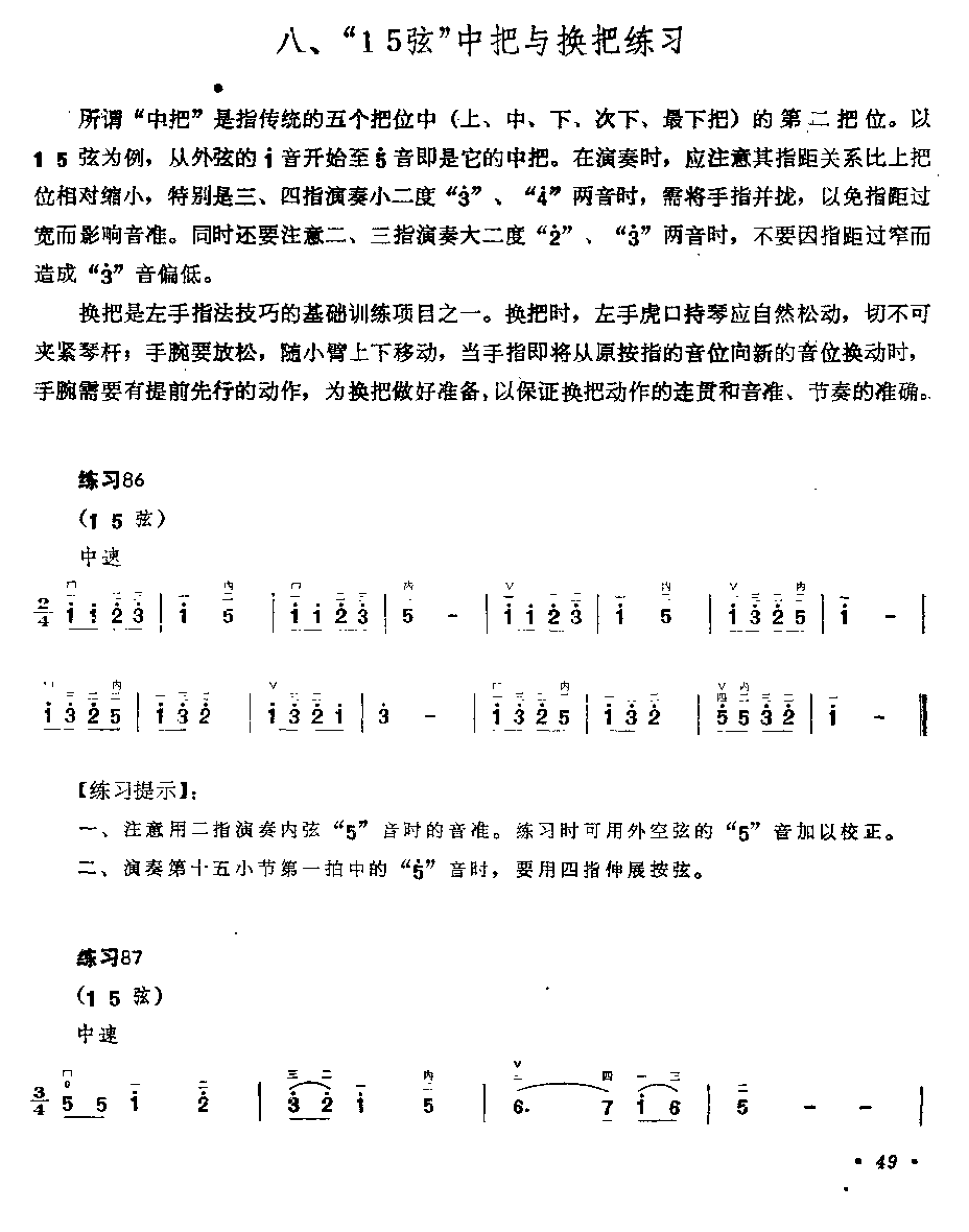 换把是左手指法技巧的基础训练项国之一。换把时,左手虎口持琴应自然松动,切不可夹紧琴杆﹔手腕要放松,随小臂上下移动,当手指即将从原按指的啻位向新的音位换动时,手腕需要有提前先行的动作,为换把做好准备,以保证换把动作的连贯和音准、节奏的准确。