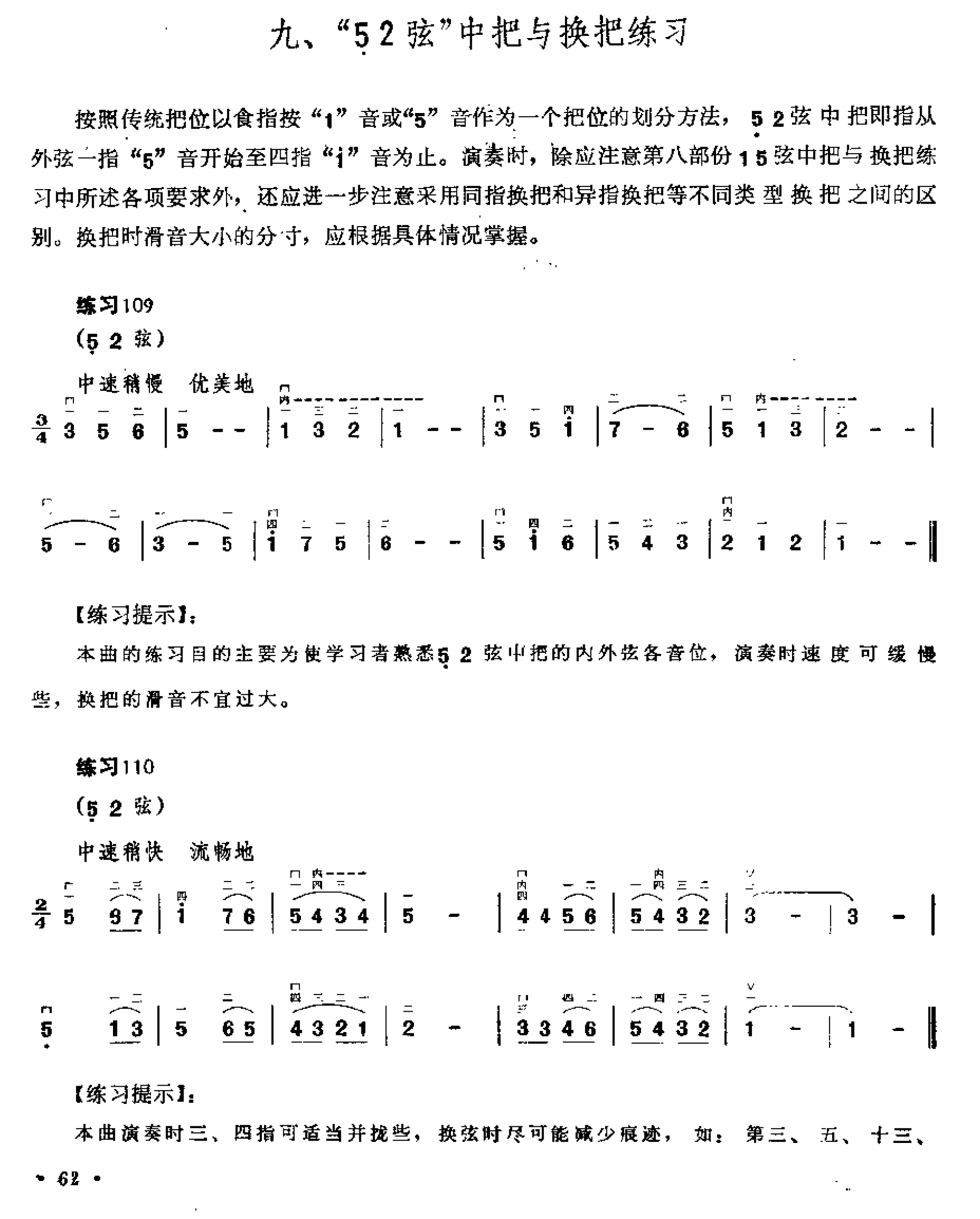 按照传统把位以食指按“1”音或“5”音作为一个把位的划分方法,52弦中把即指从外弦一指“5”音开始至四指“i”音为止。演奏时,除应注意第八部份5弦中把与换把练习中所述各项要求外,还应选一步注意采用同指换把和异指换把等不同类型换把之间的区别。换把时滑音大小的分寸,应根据具体情况掌握。