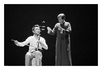 当弓杆自然挂在筒外侧边时,弓杆凭自身的重力对弦产生一定的附着力,右手在不加任何向上或向下的力拖动弓子便会拉出很自然的声音,我暂且称它为原发音,在原发音的基础上可以加向上或向下的力来改变弓的力度,以表现不同要求的乐音。