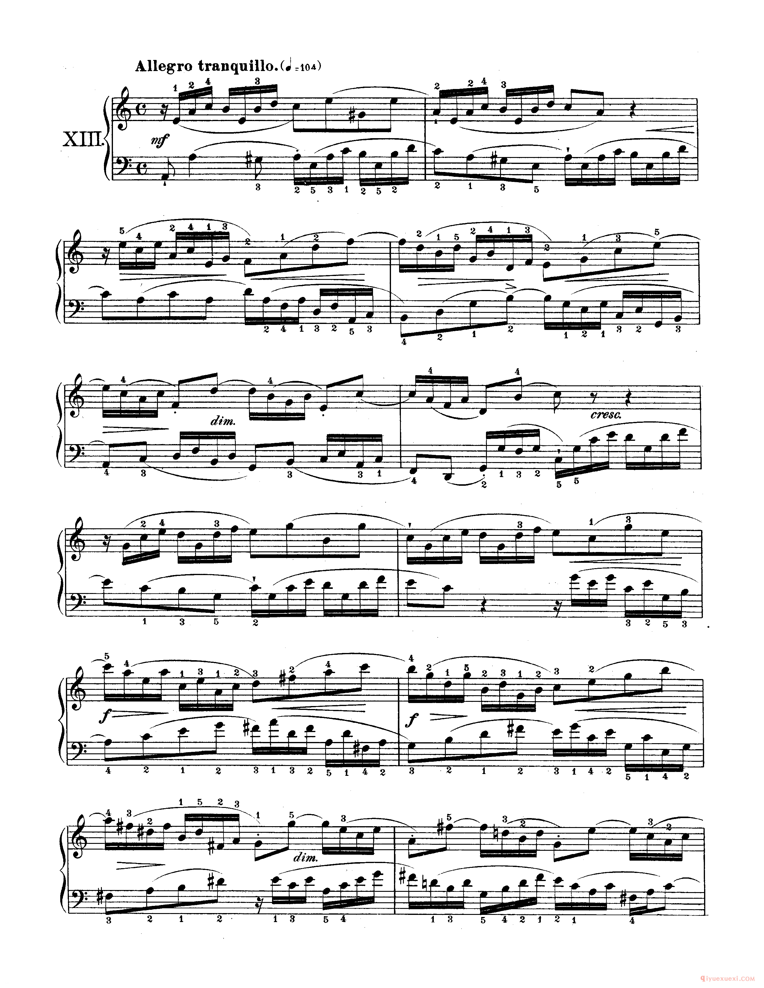 技巧: 1.这首作品和前面第八条的训练内容是一样的,都是音阶型的跑动练习,所不同的是这条练习曲以左手训练为主,左手需要注意的技巧要点和右手一样,仍然是换指动作的准确性。(具...