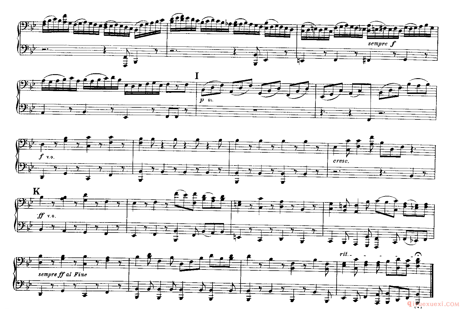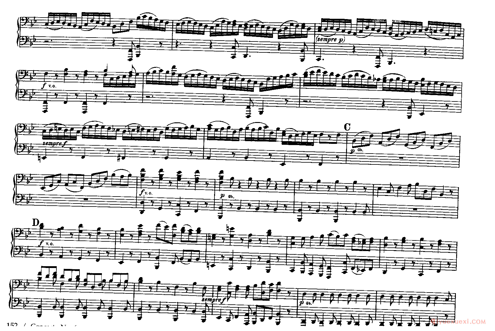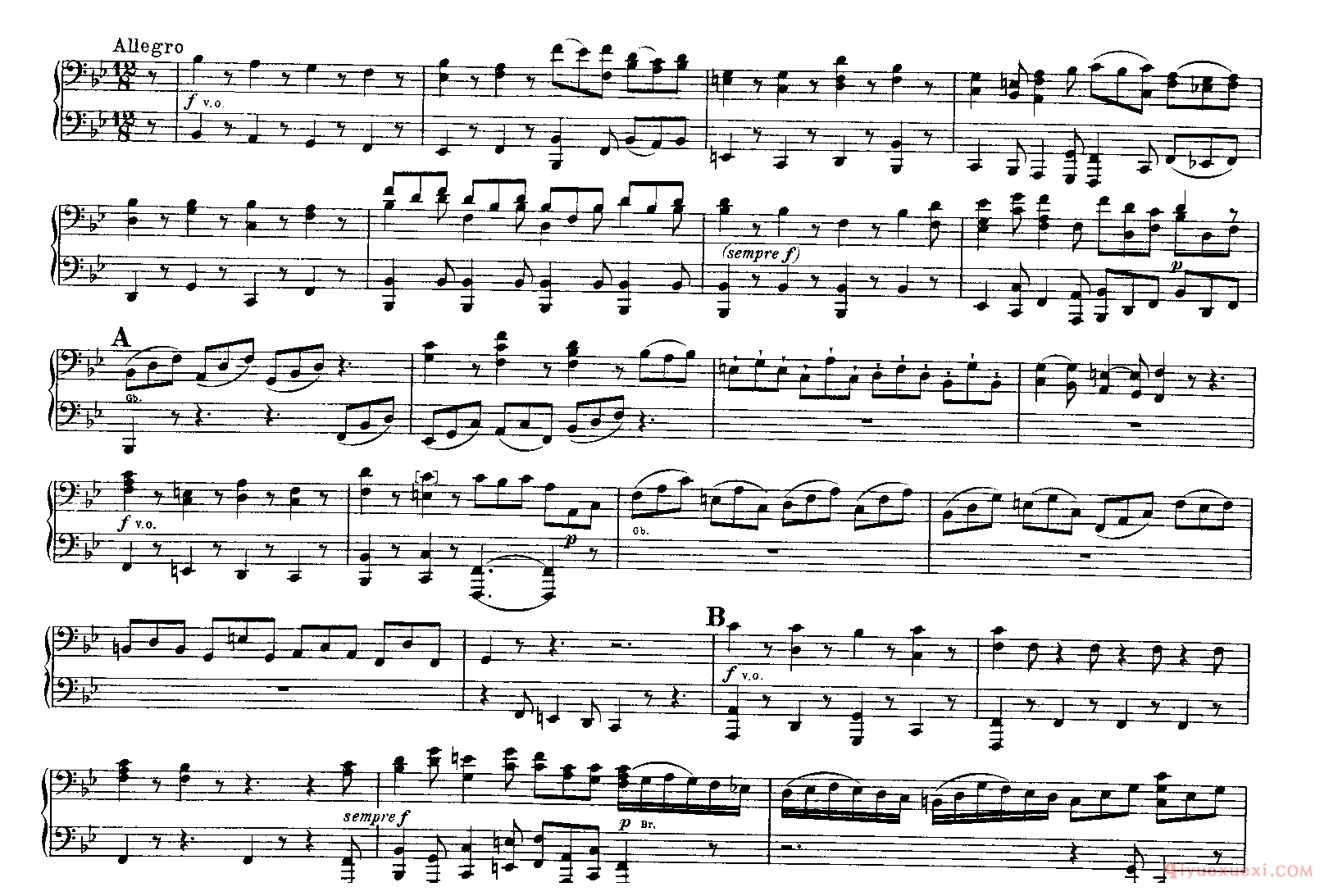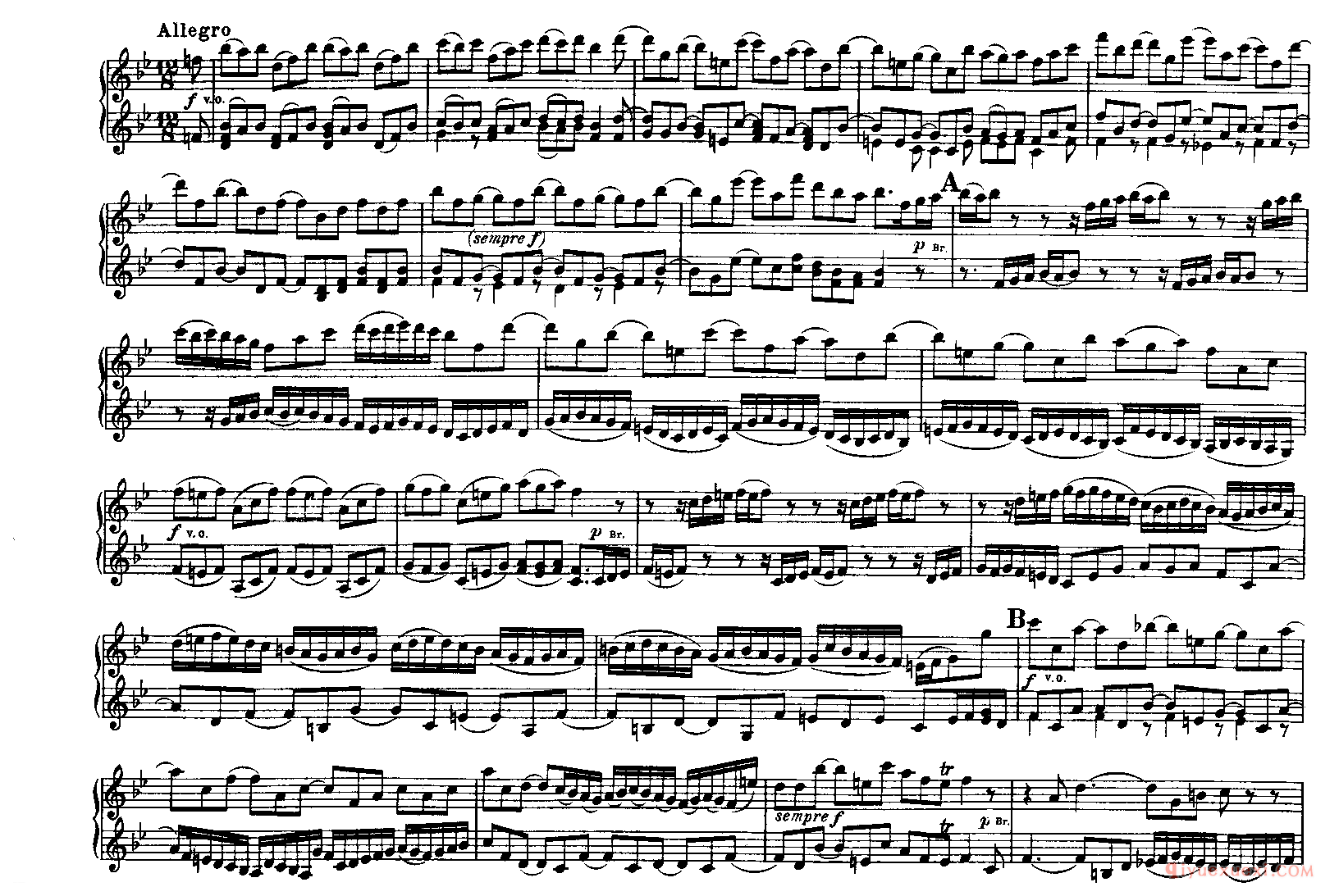 1、快板,三段体,在古大提琴与低音的八分音符上,古中提琴奏出卡农,其它主题也以卡农的方式呈现。
