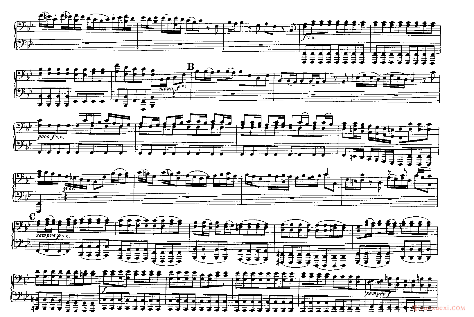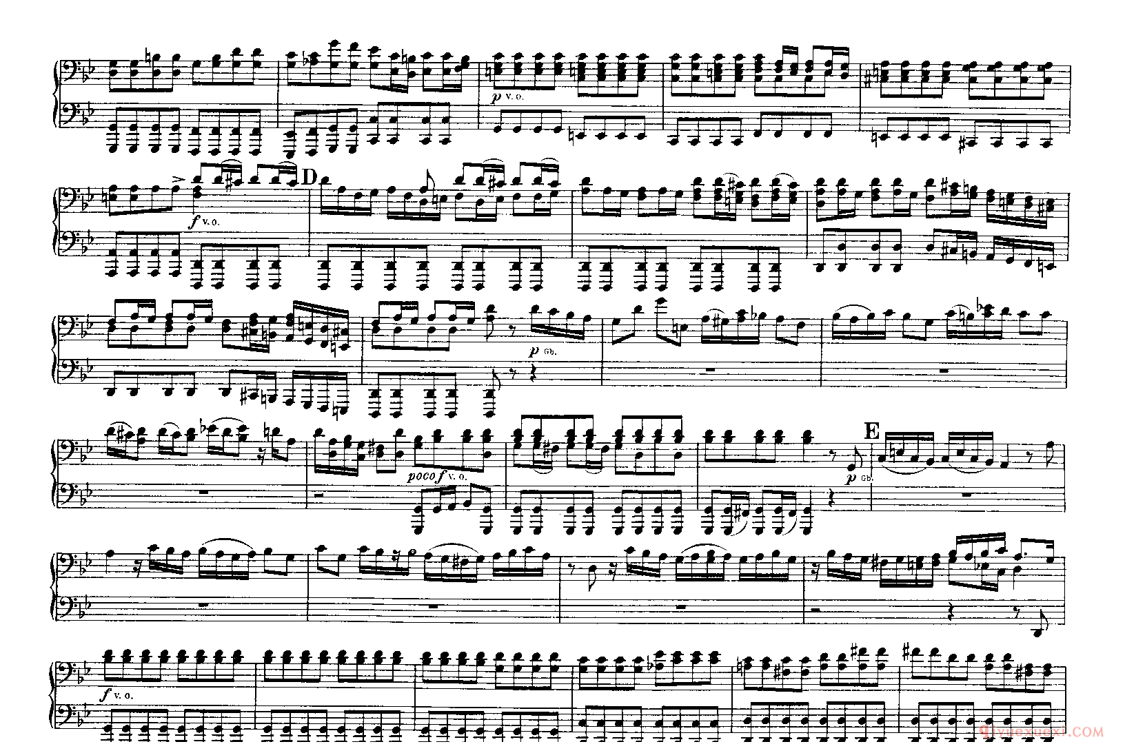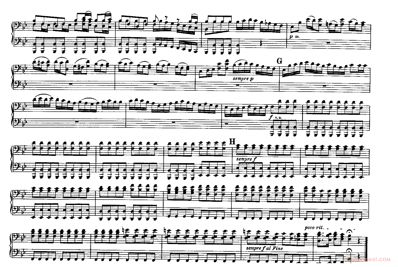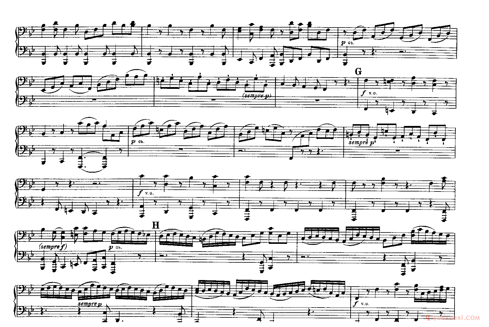 1、快板,三段体,在古大提琴与低音的八分音符上,古中提琴奏出卡农,其它主题也以卡农的方式呈现。