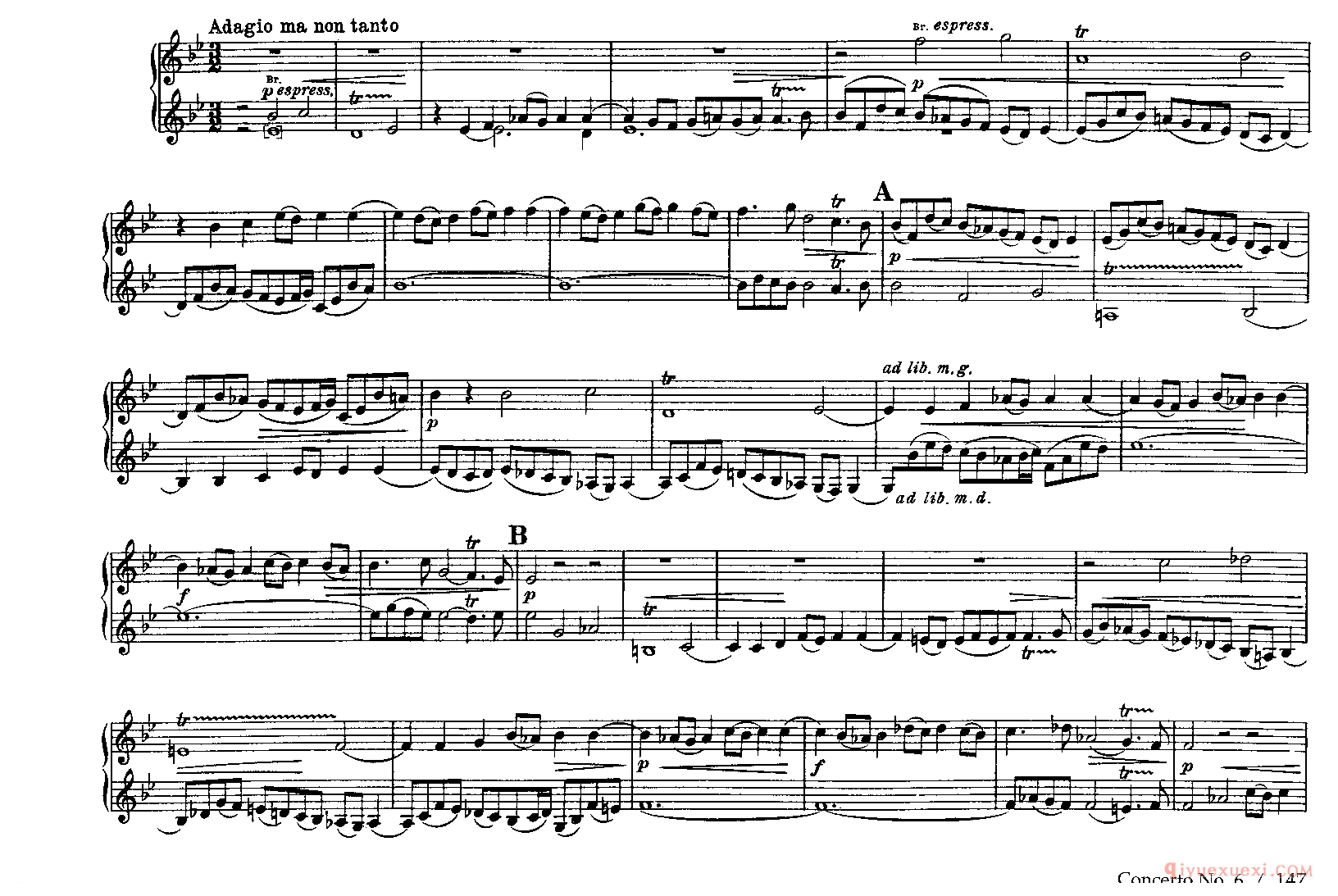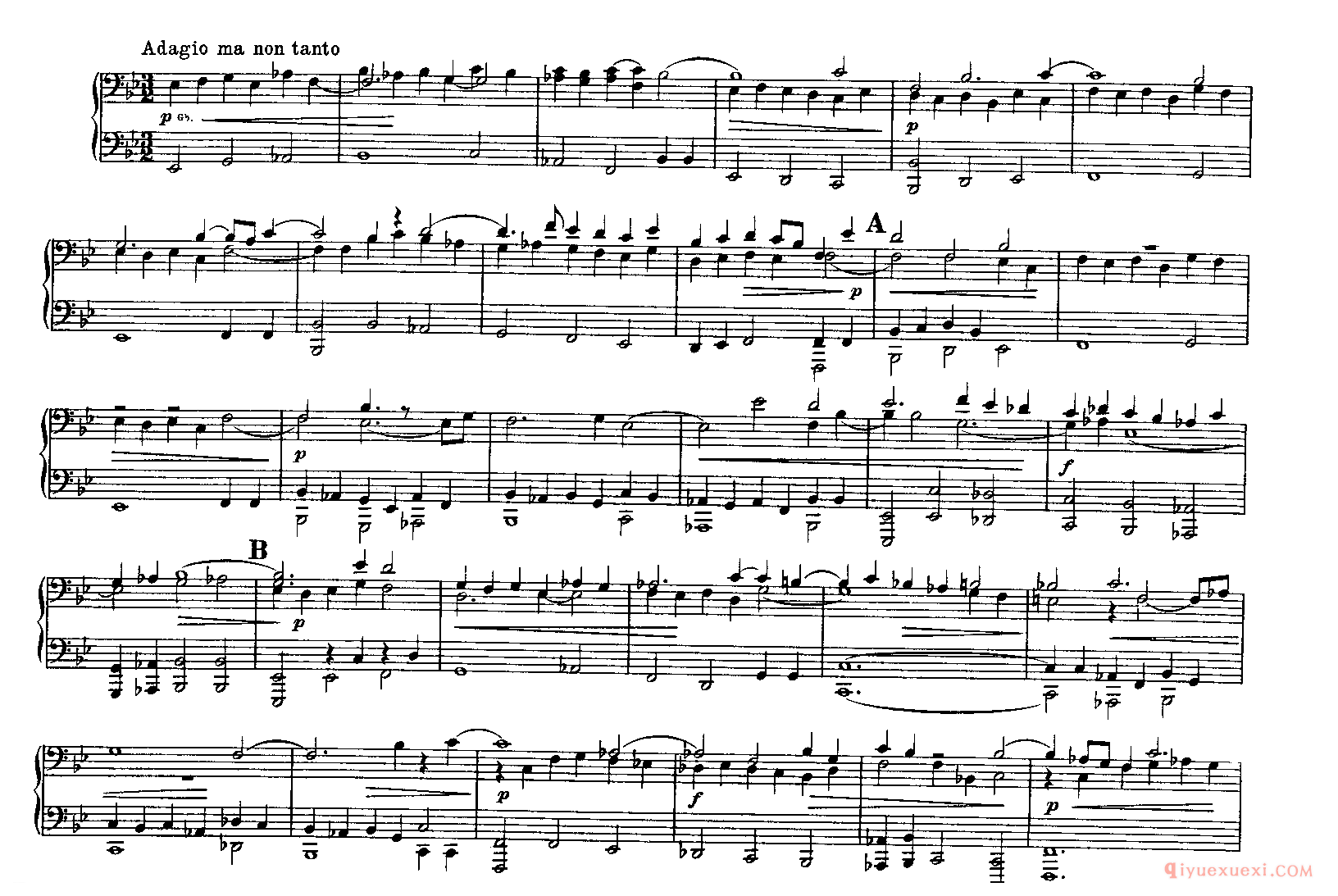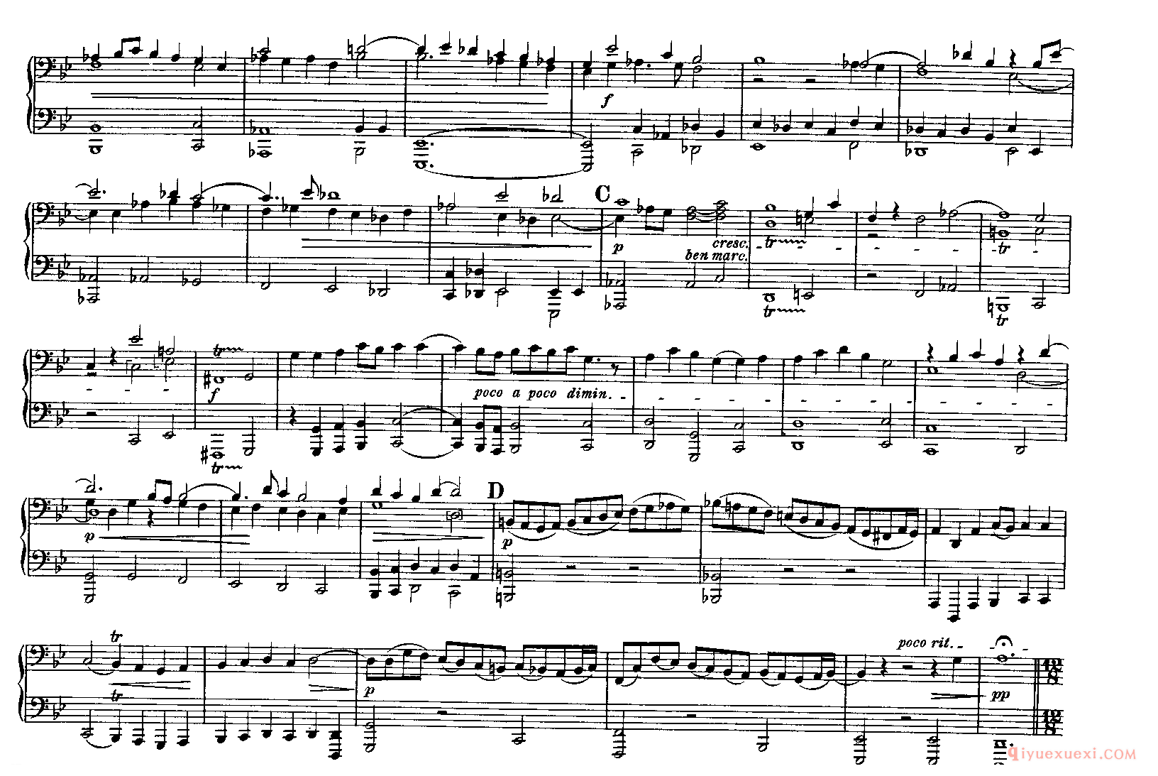2、从容的快板,这一乐章把悲哀与平静巧妙地结合在一起,突出两把古中提琴的二重奏,大提琴只作装饰。