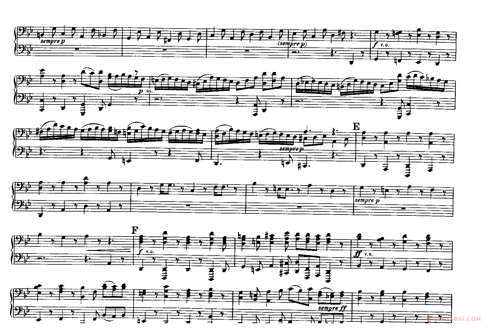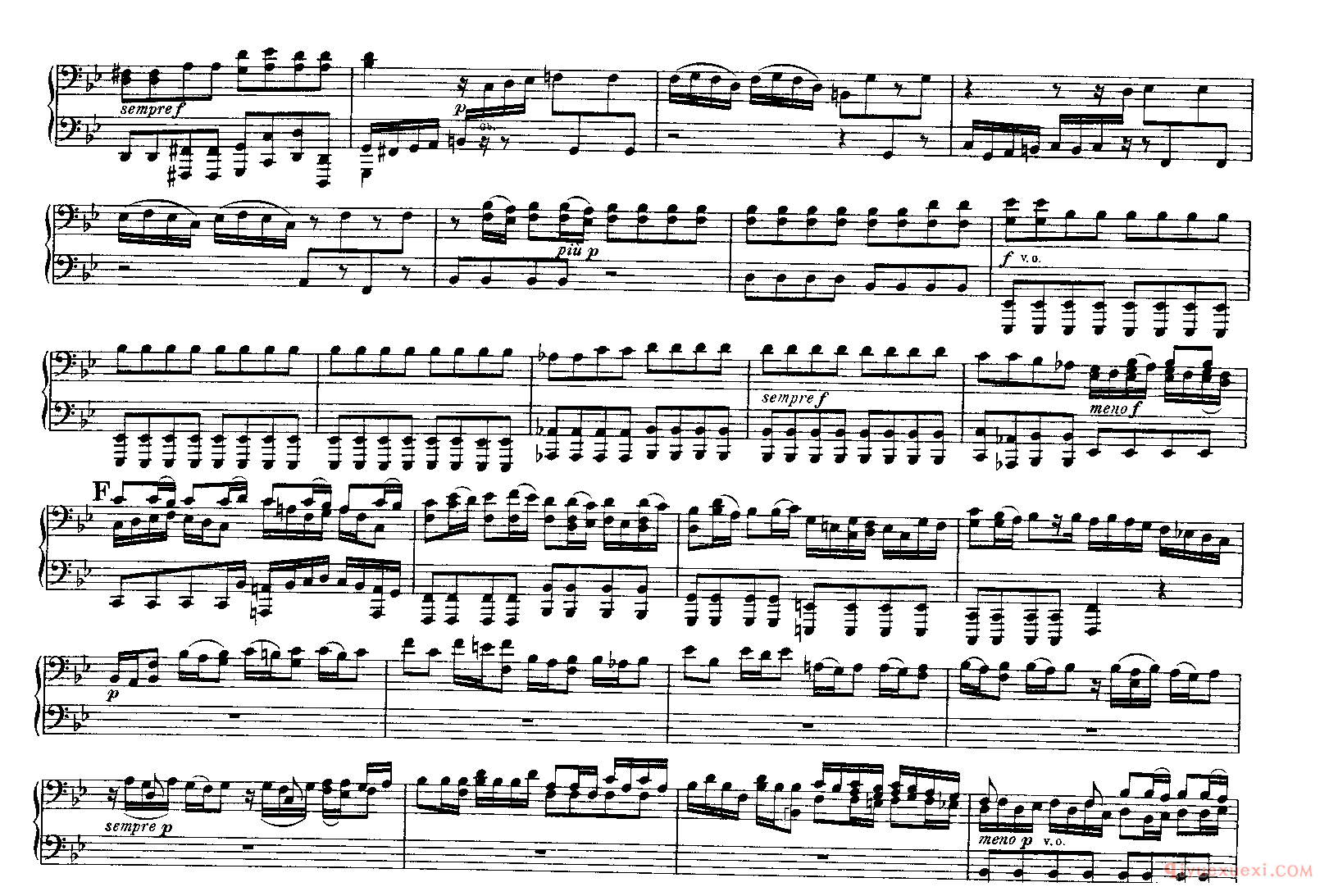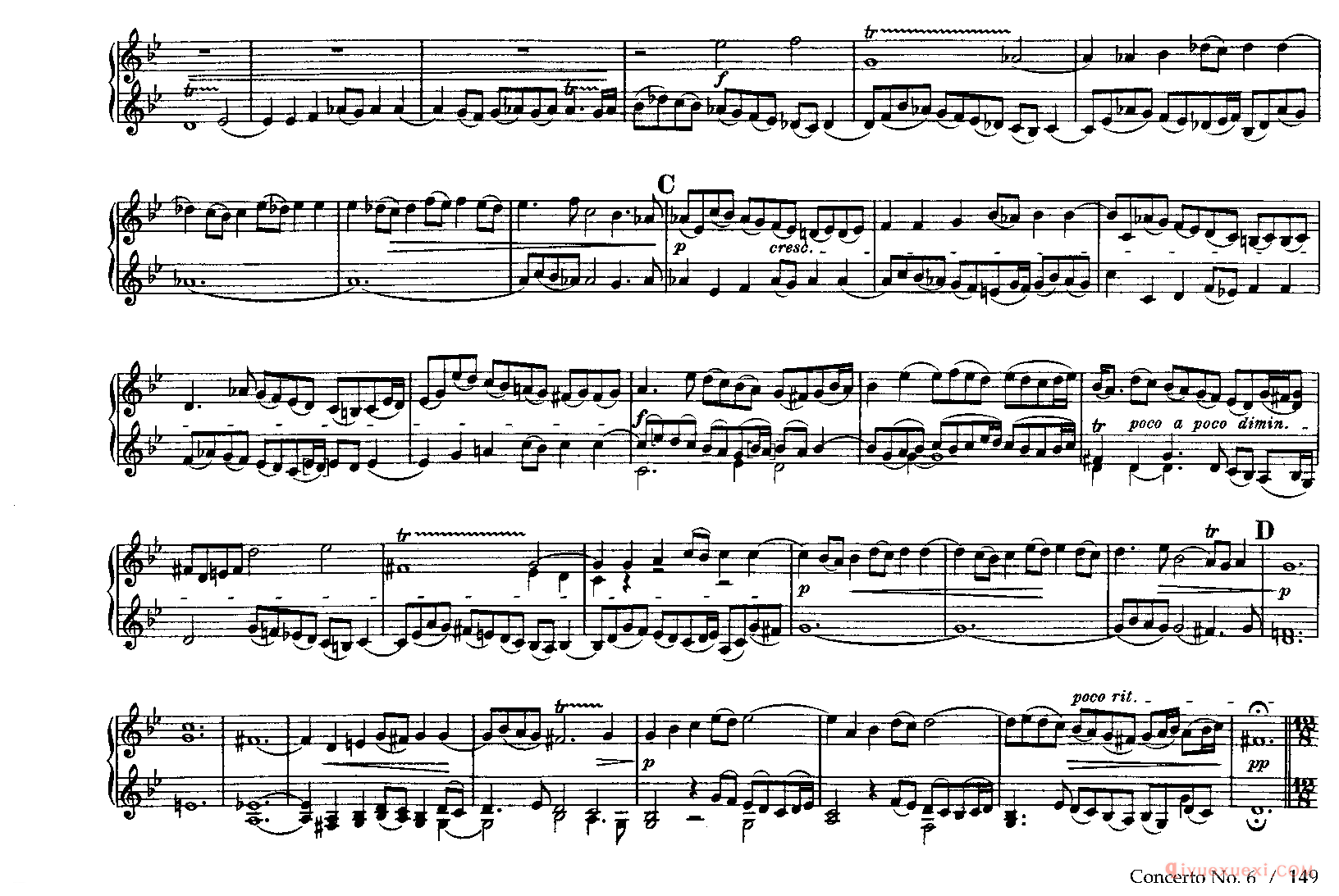 2、从容的快板,这一乐章把悲哀与平静巧妙地结合在一起,突出两把古中提琴的二重奏,大提琴只作装饰。