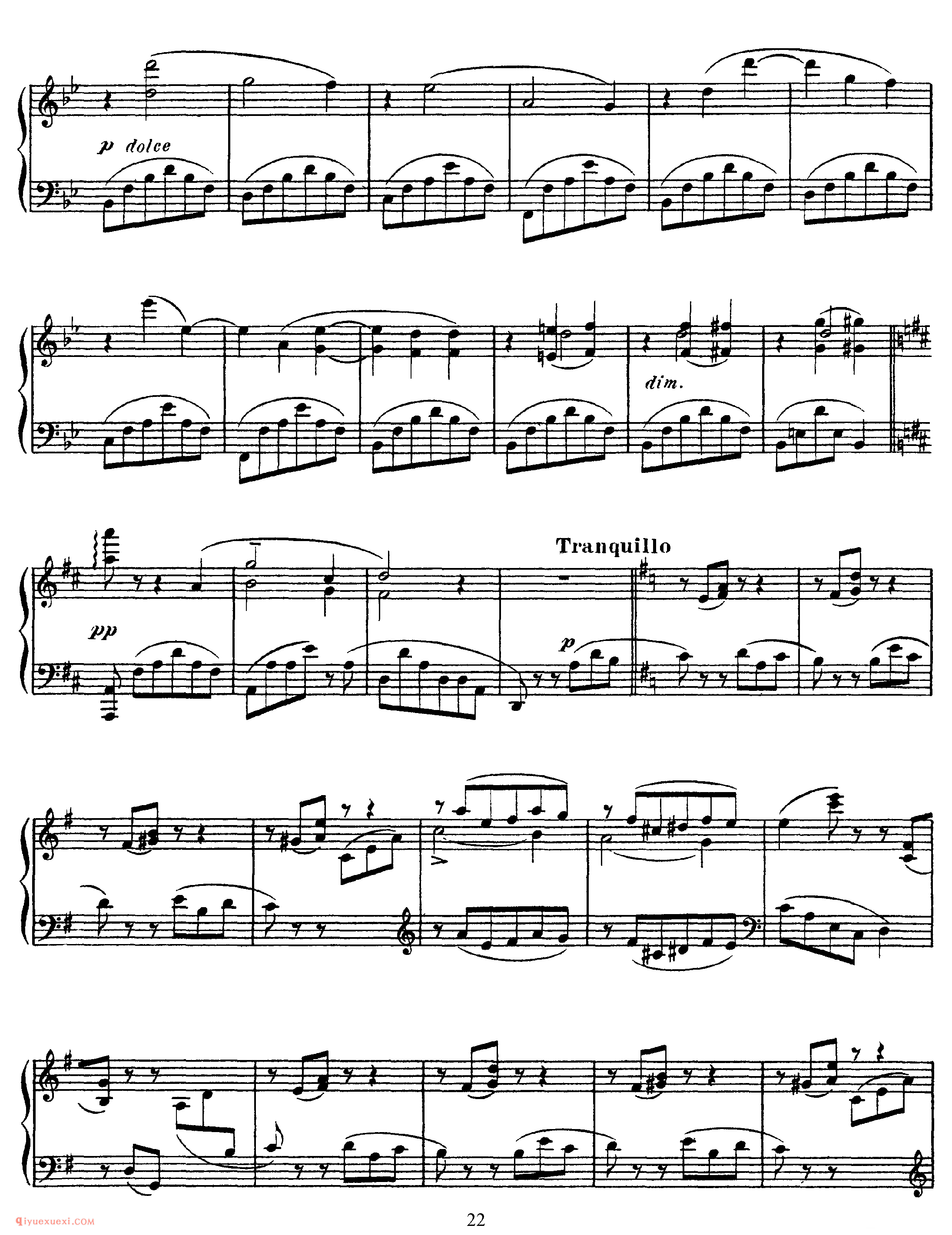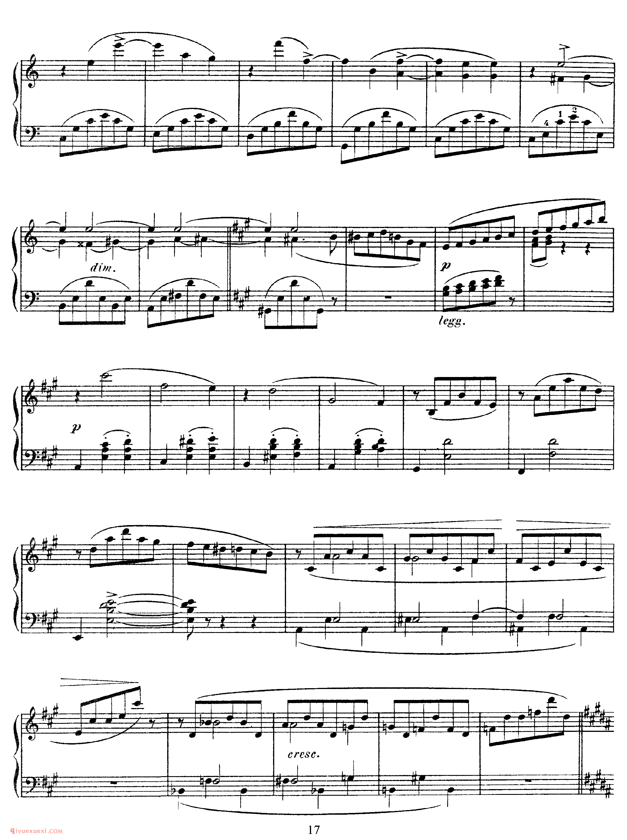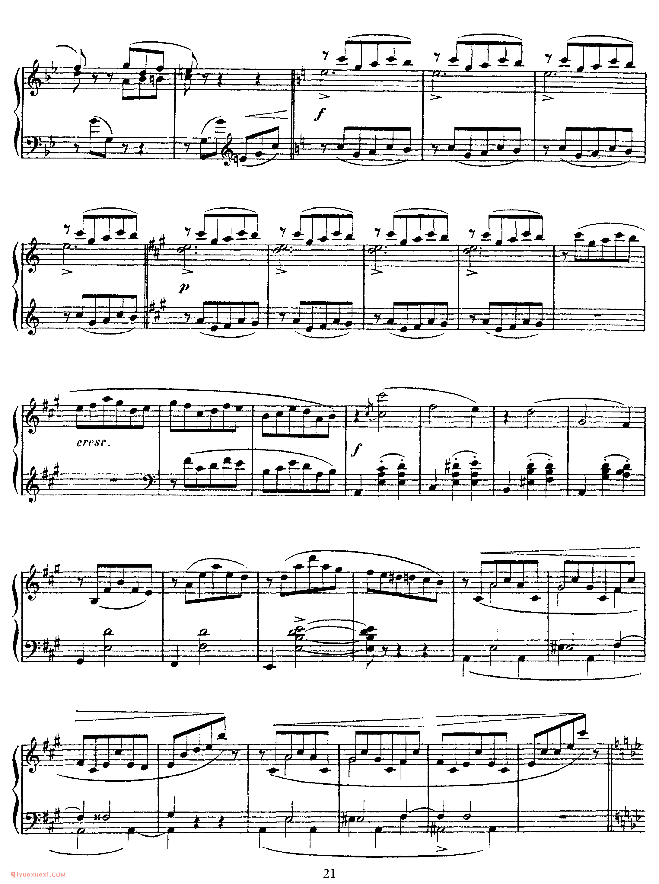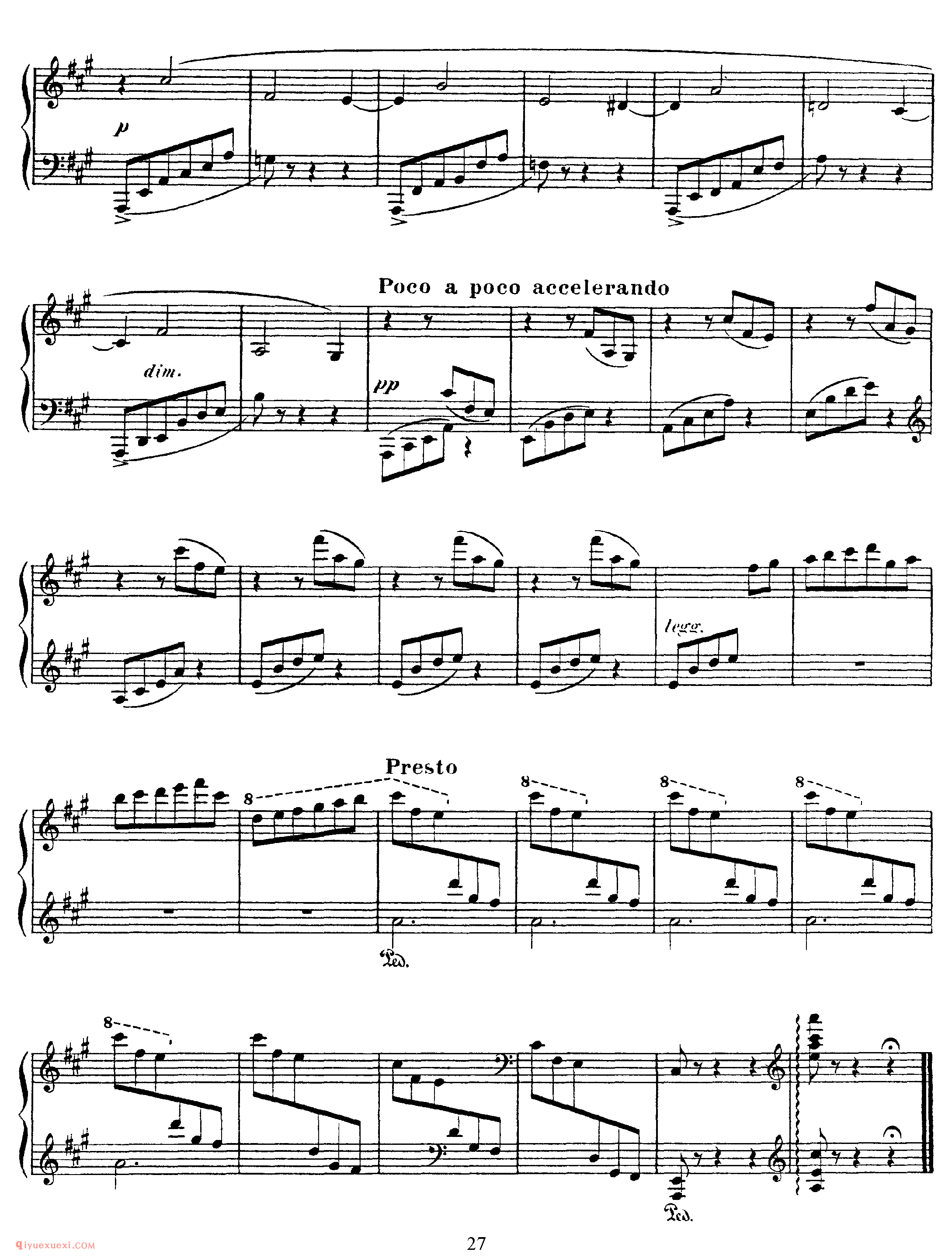 这首乐曲的左手弹奏时,小指既要站稳、保持,大指和三指又可略带轻微地带动手掌的翻动动作, 值得注意的是,19世纪的装饰音往往是在强拍之前弹奏的。因此第11小节的装饰音可从前一小节...