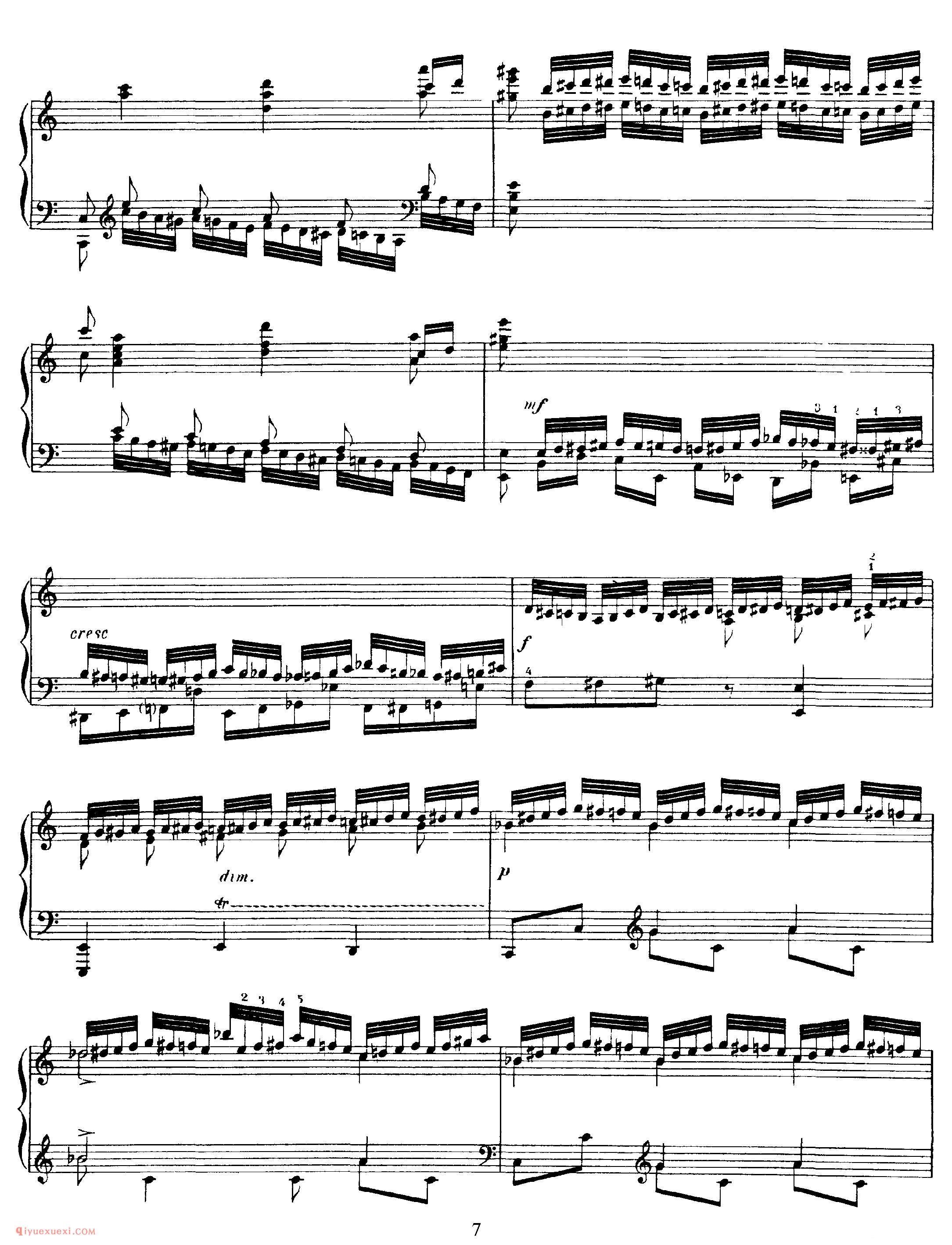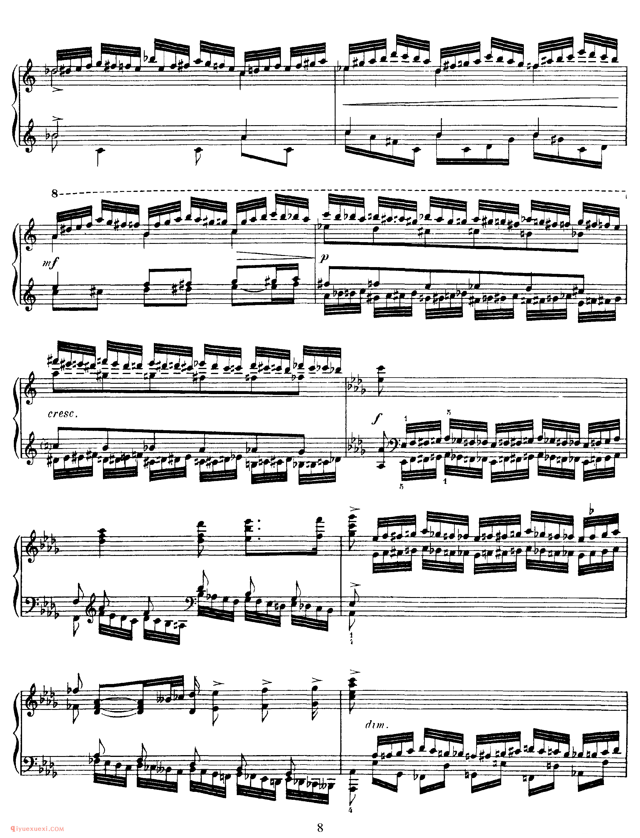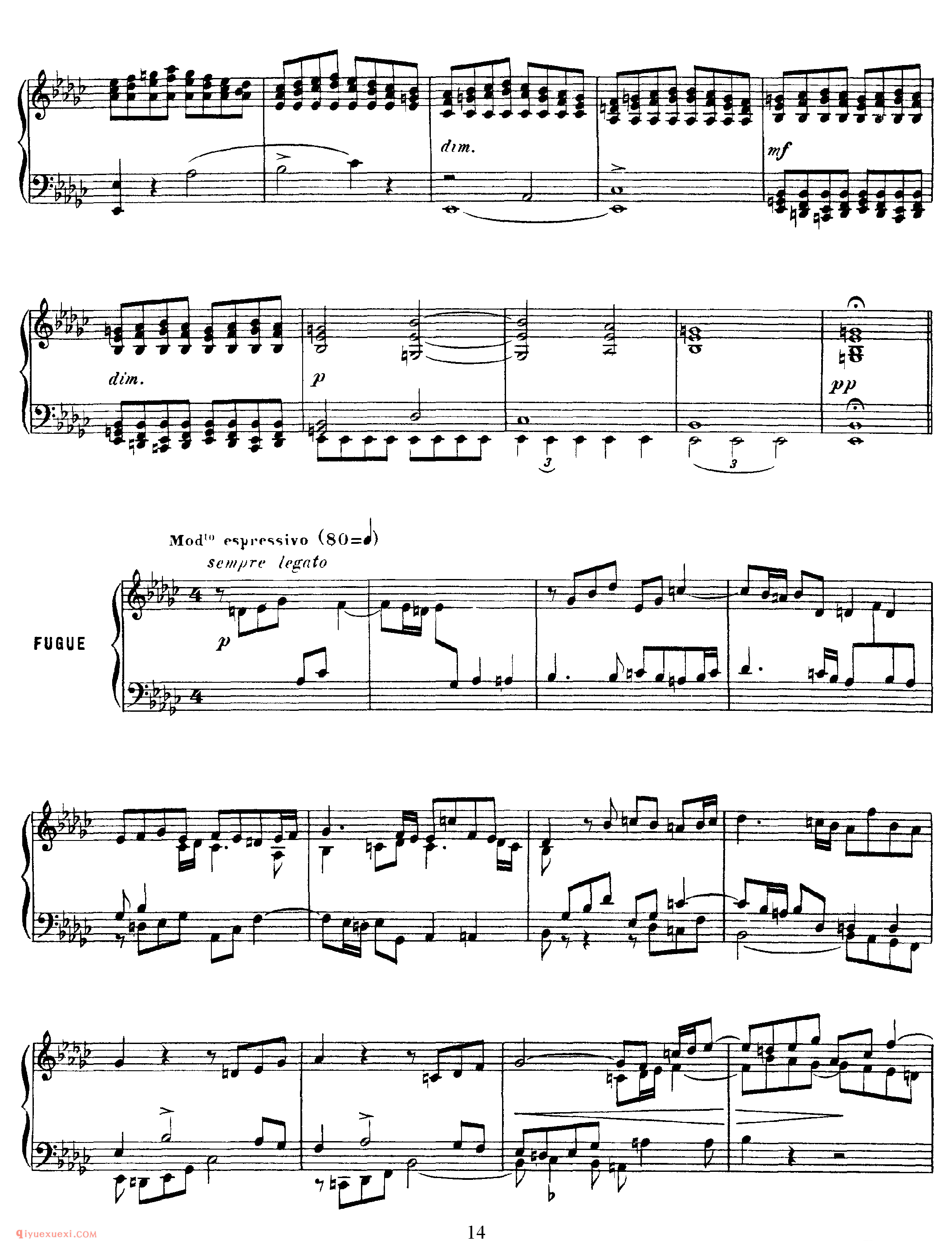 3. 前奏曲与赋格 Prelude et Fugue ,降e小调,前奏曲为2/2拍,激动的中板,是八度与和弦的练习曲;赋格为4/4拍,有表情的中板,声部练习曲。