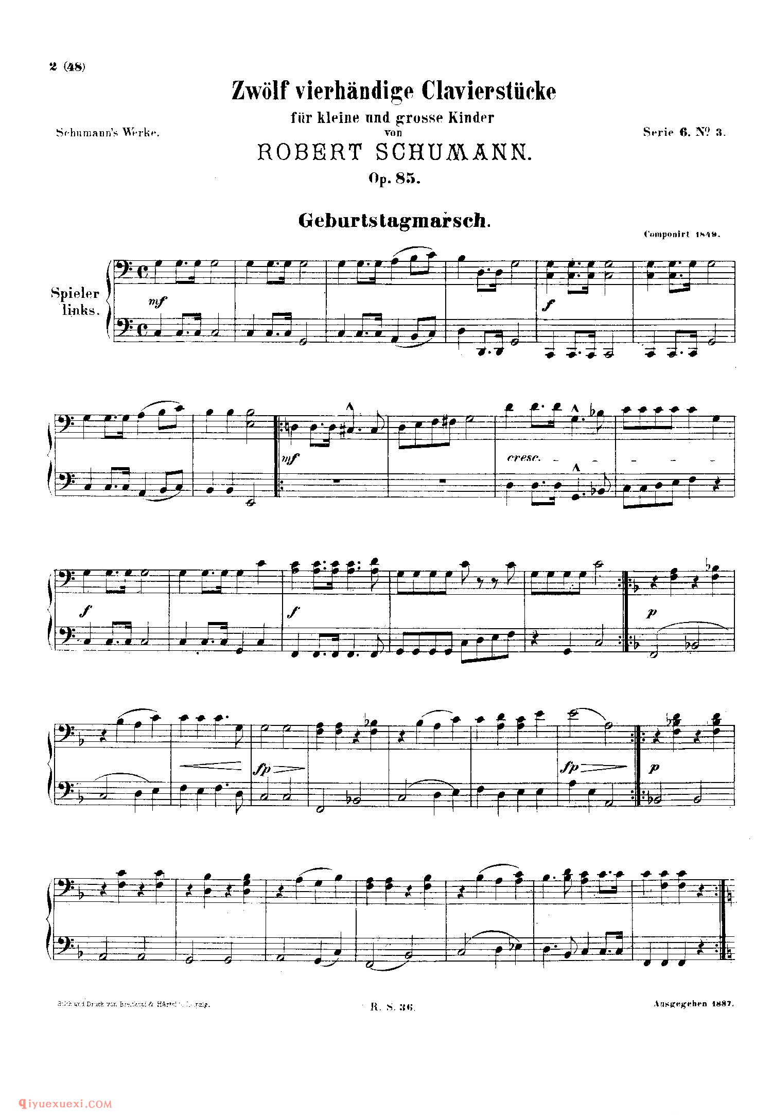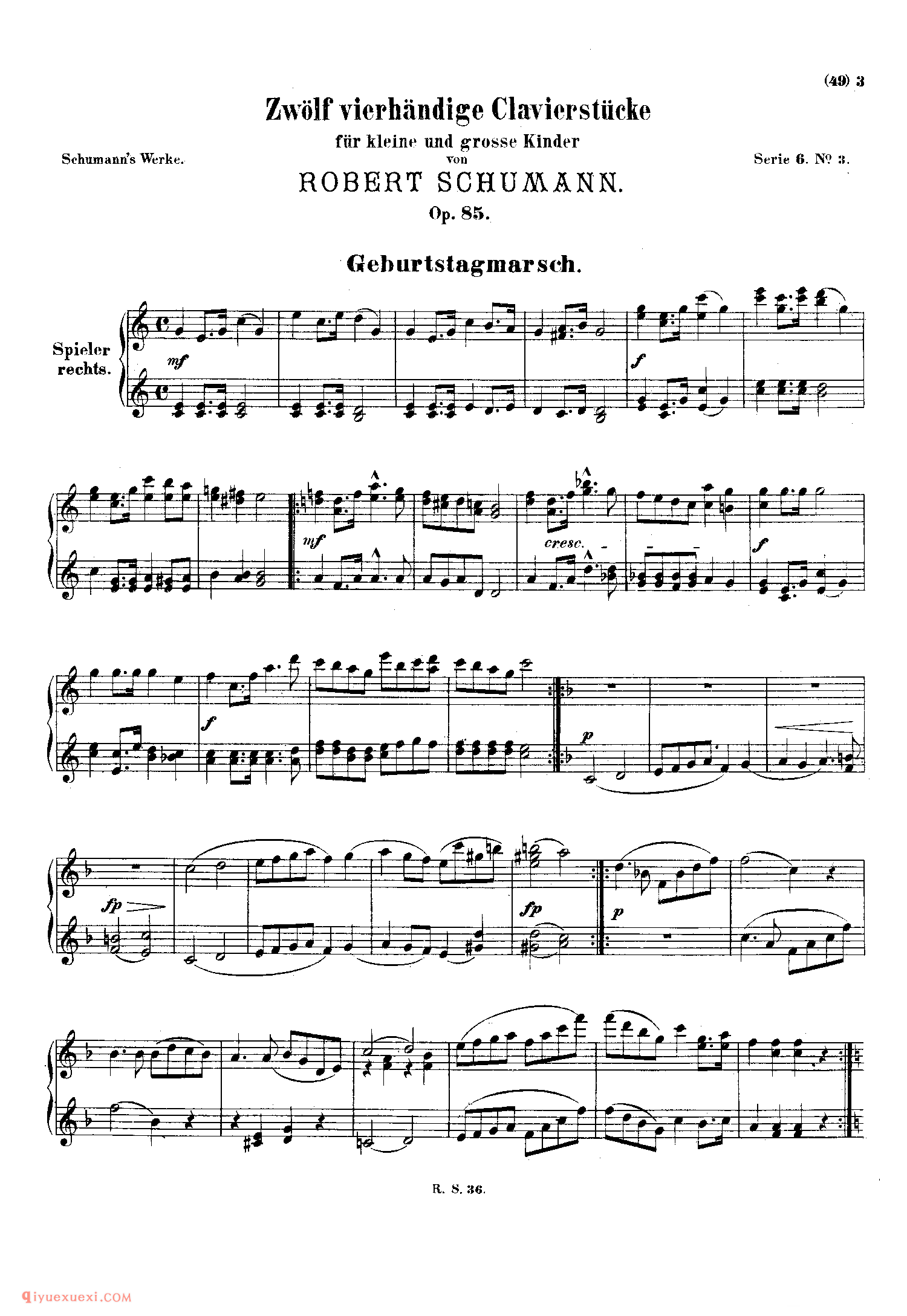 舒曼《十二首为孩子们而作的四手联弹曲》12 Pieces for Large and Small Children Op.85 ,作于1849年,是带有取悦孩子的那种清新韵味的钢琴四手联弹小品。因为孩子们而作,因此技巧相对简单。1. 生日进行曲 Geburtstagmarsch ,C大调,4/4拍,进行曲速度。这是舒曼及其女儿玛丽合奏送给克拉拉的生日礼物。