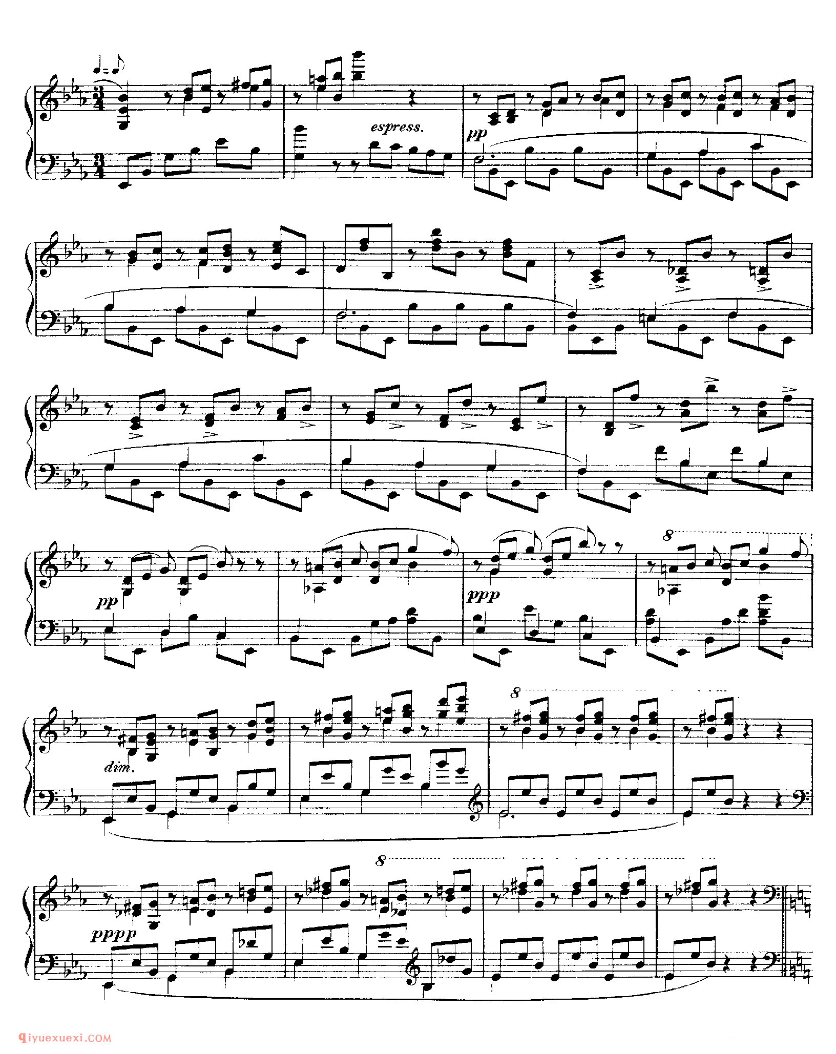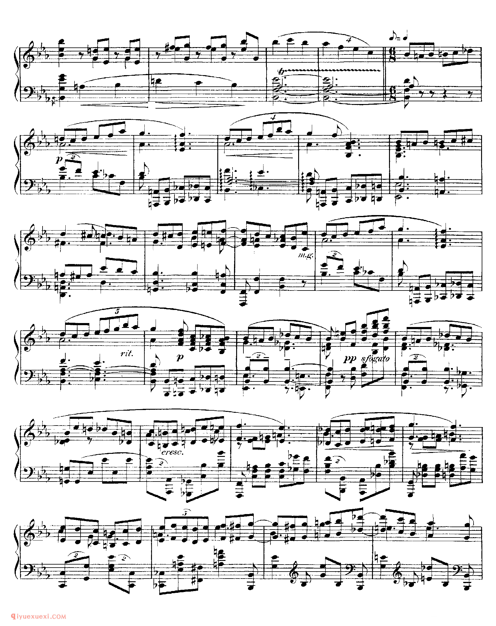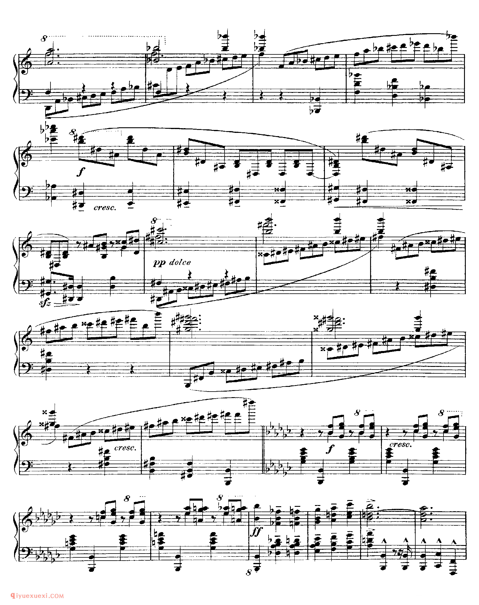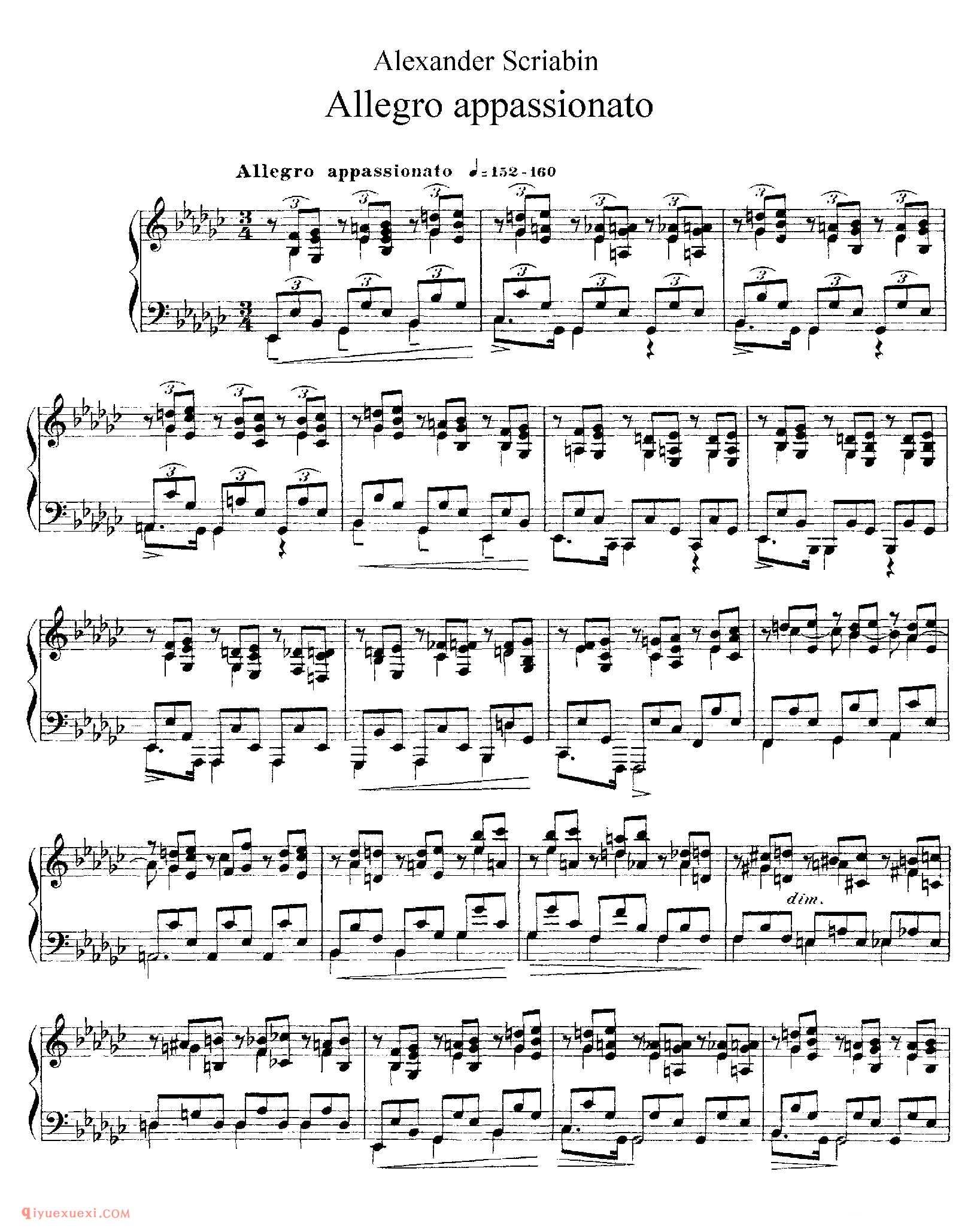 斯克里亚宾《热情的快板》Allegro Appassionato Op.4 ,作于1893年。降e小调,3/4拍。由一系列的八分音符三连音组成基本节奏,主旋律隐藏在中间声部,低音声部与之相呼应。这是斯克里亚宾的早期作品,散发着生机勃勃的青春活力。