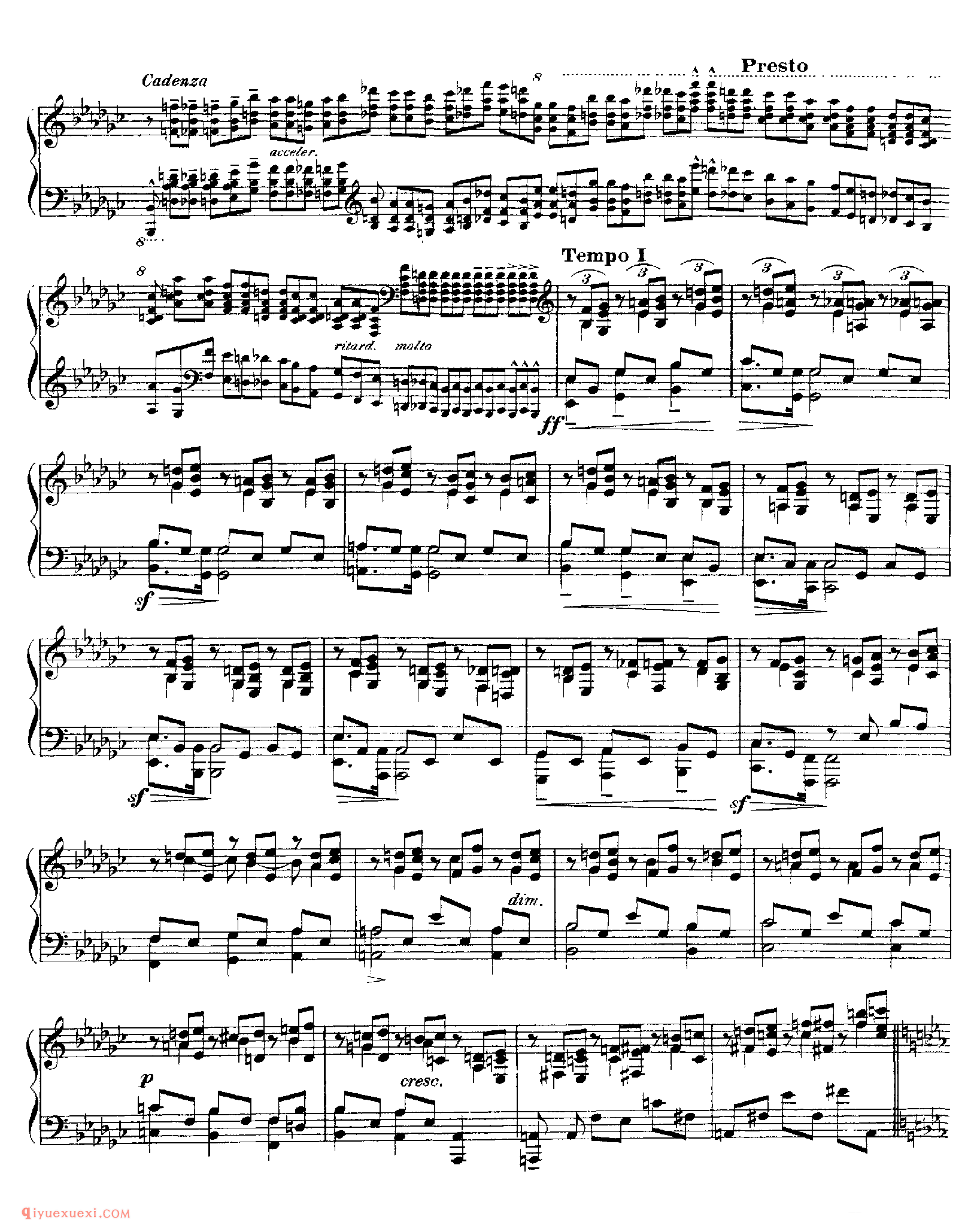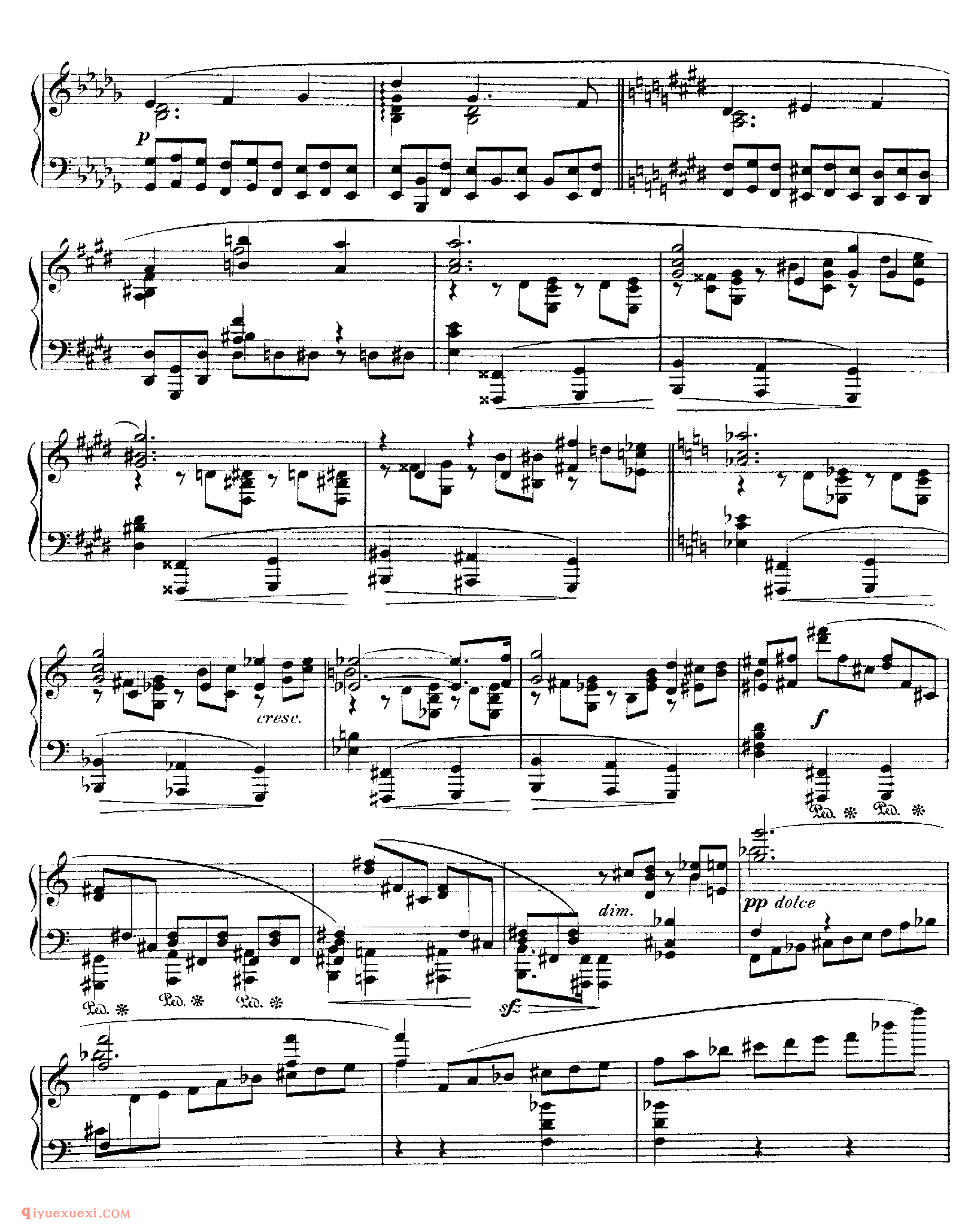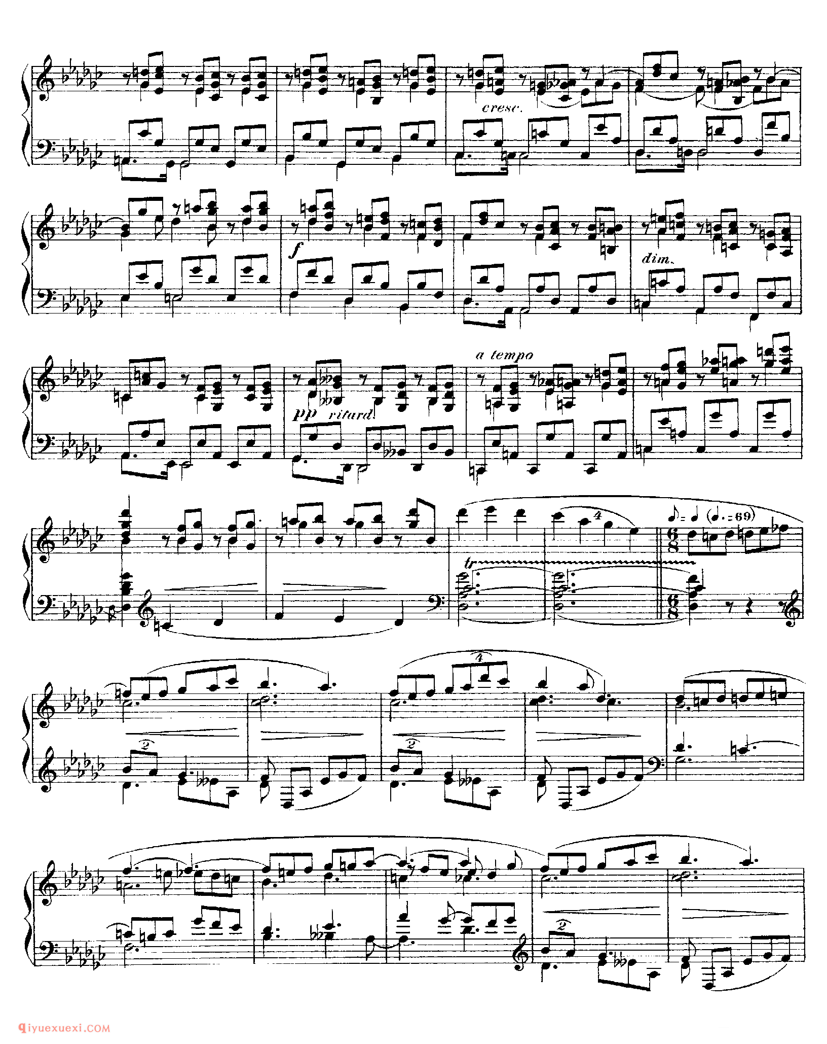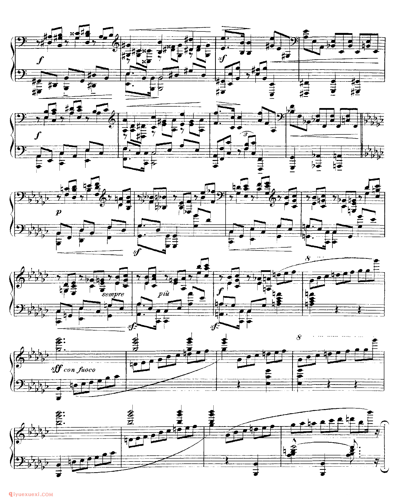 斯克里亚宾《热情的快板》Allegro Appassionato Op.4 ,作于1893年。降e小调,3/4拍。由一系列的八分音符三连音组成基本节奏,主旋律隐藏在中间声部,低音声部与之相呼应。这是斯克里亚宾的早期作品,散发着生机勃勃的青春活力。