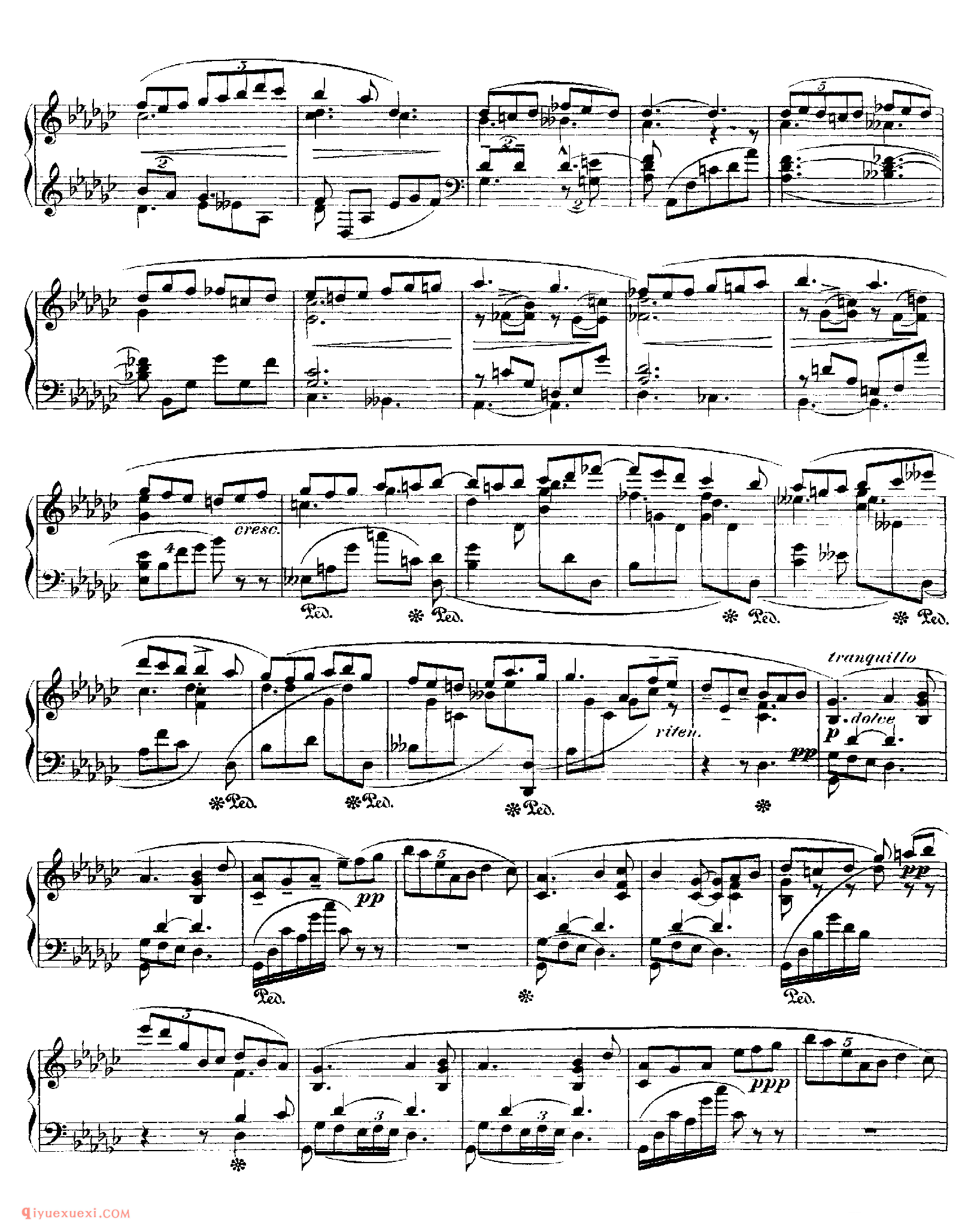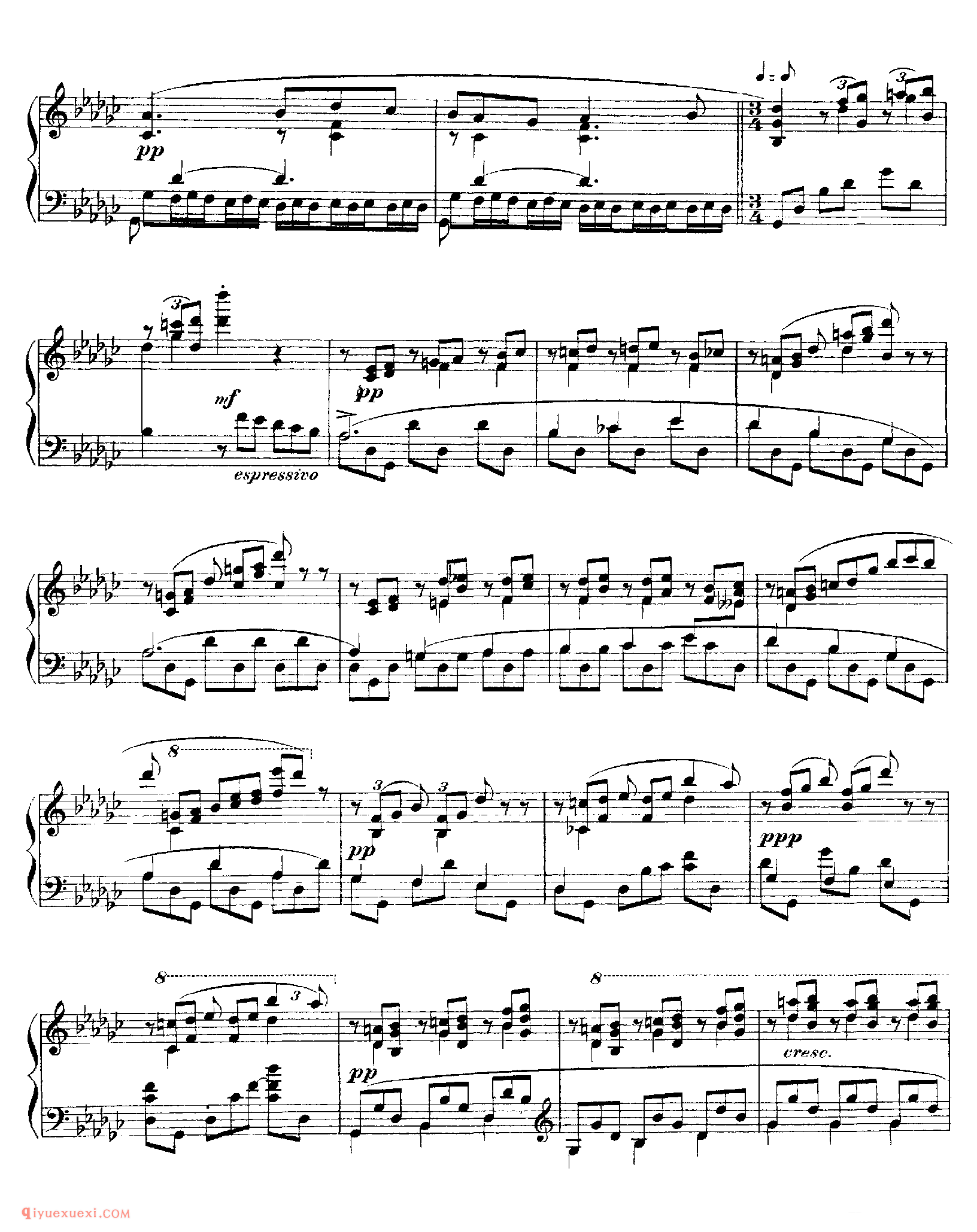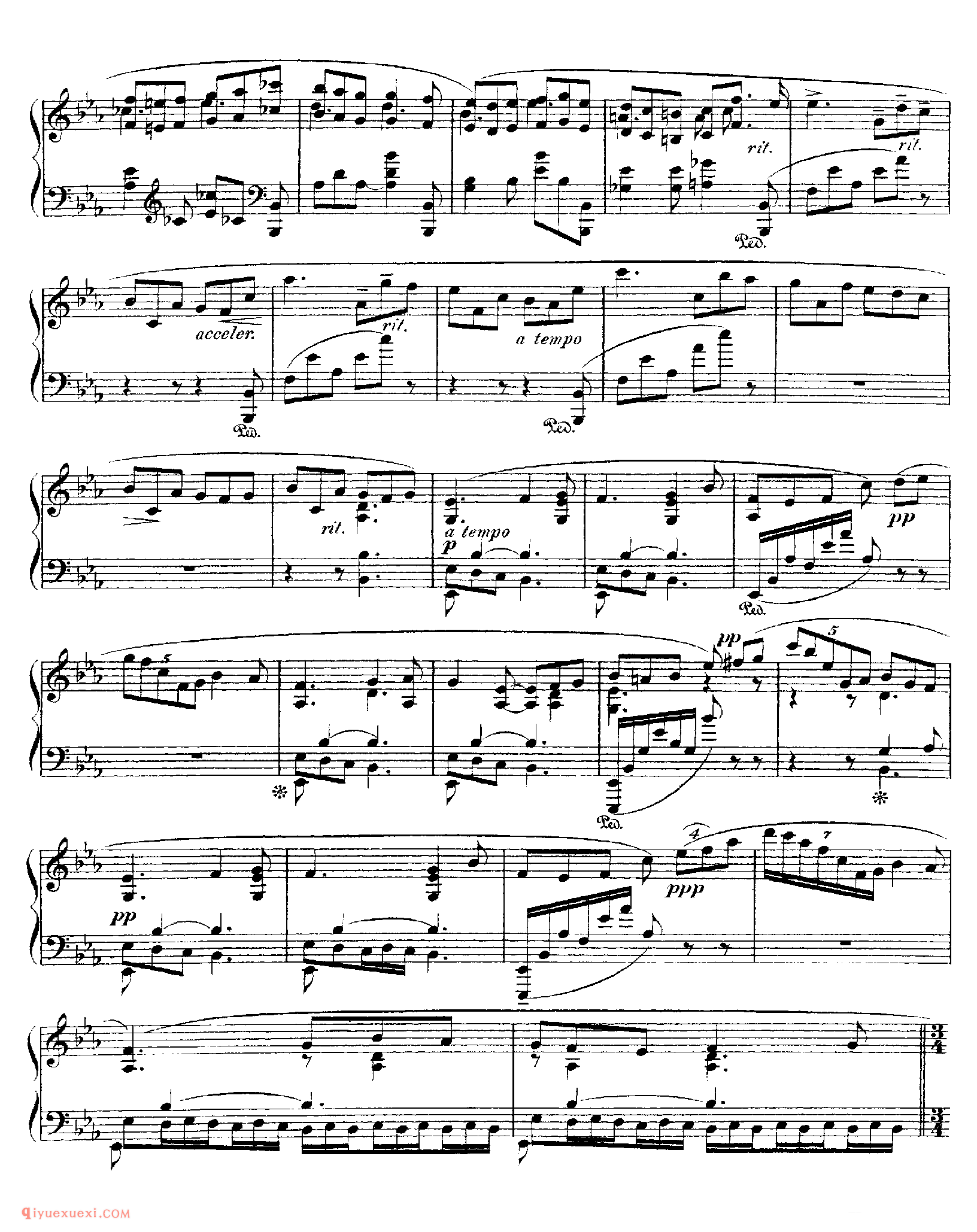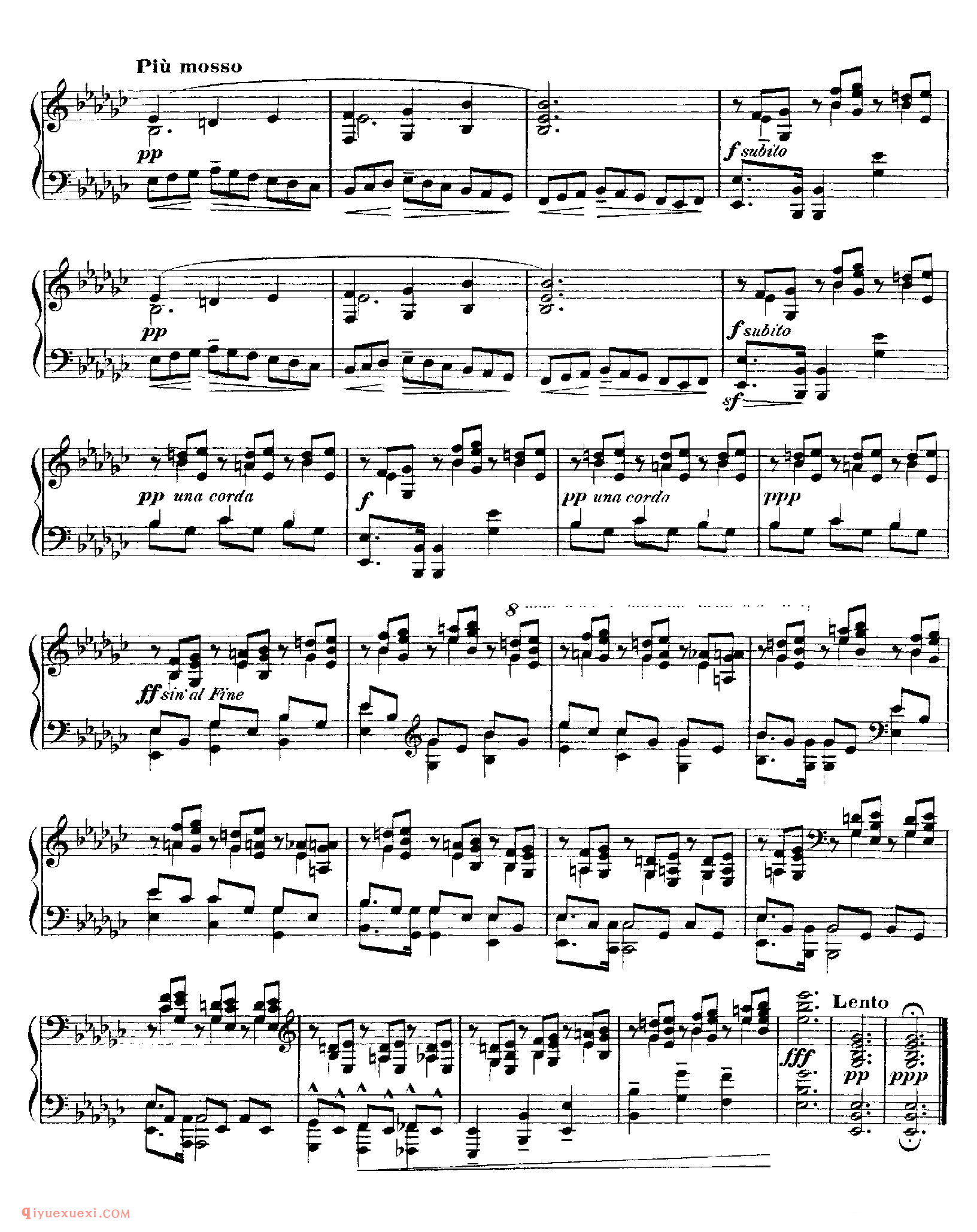 斯克里亚宾《热情的快板》Allegro Appassionato Op.4 ,作于1893年。降e小调,3/4拍。由一系列的八分音符三连音组成基本节奏,主旋律隐藏在中间声部,低音声部与之相呼应。这是斯克里亚宾的早期作品,散发着生机勃勃的青春活力。
