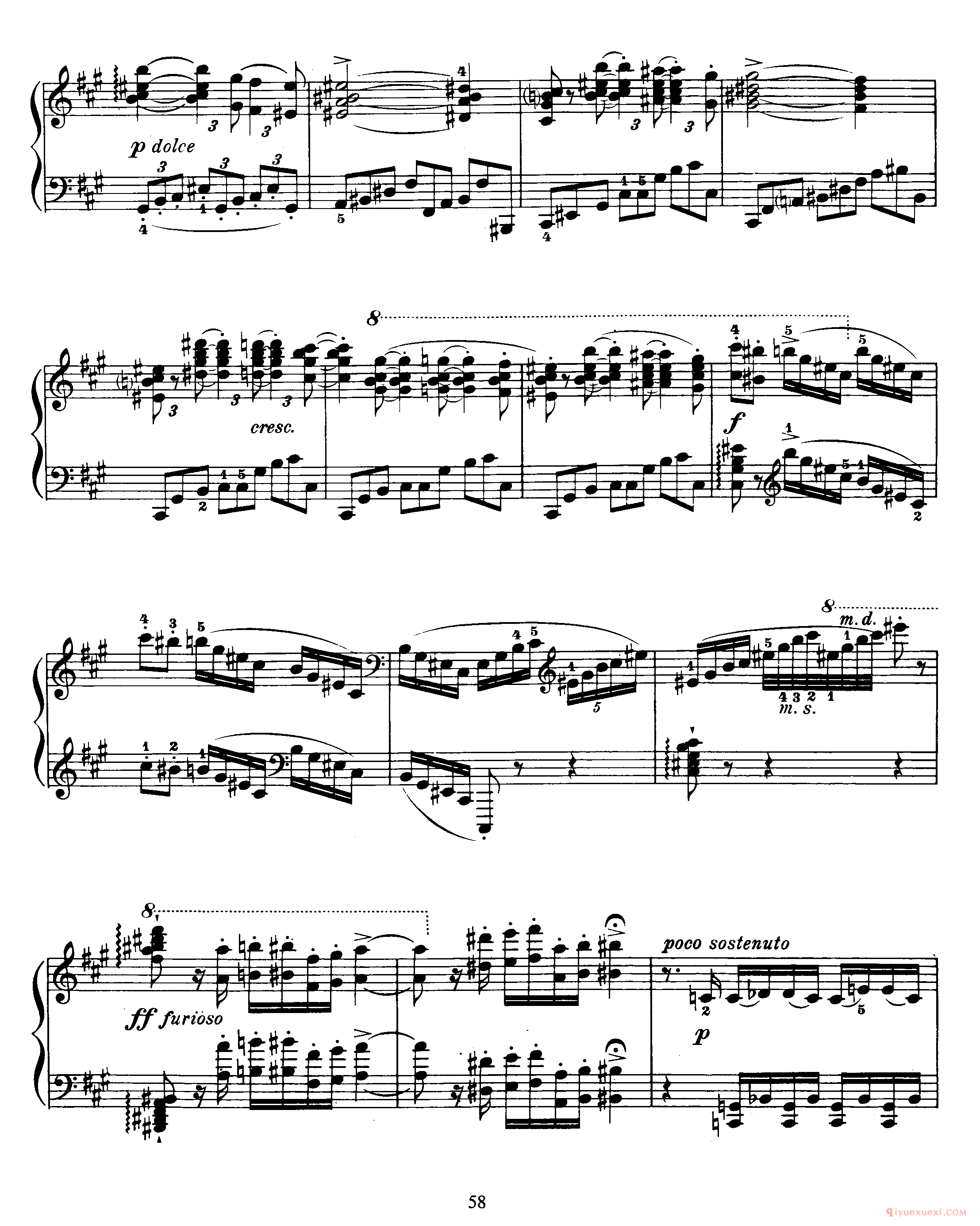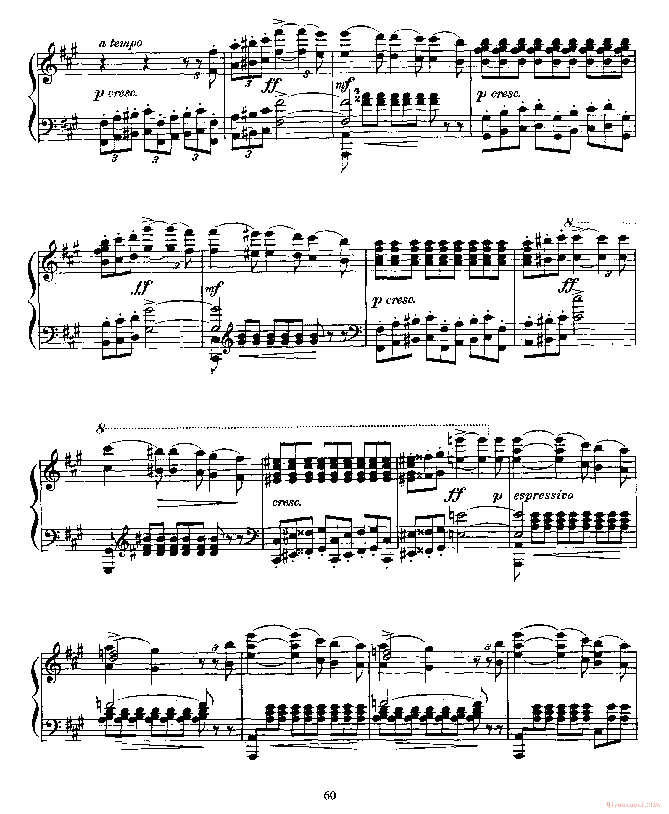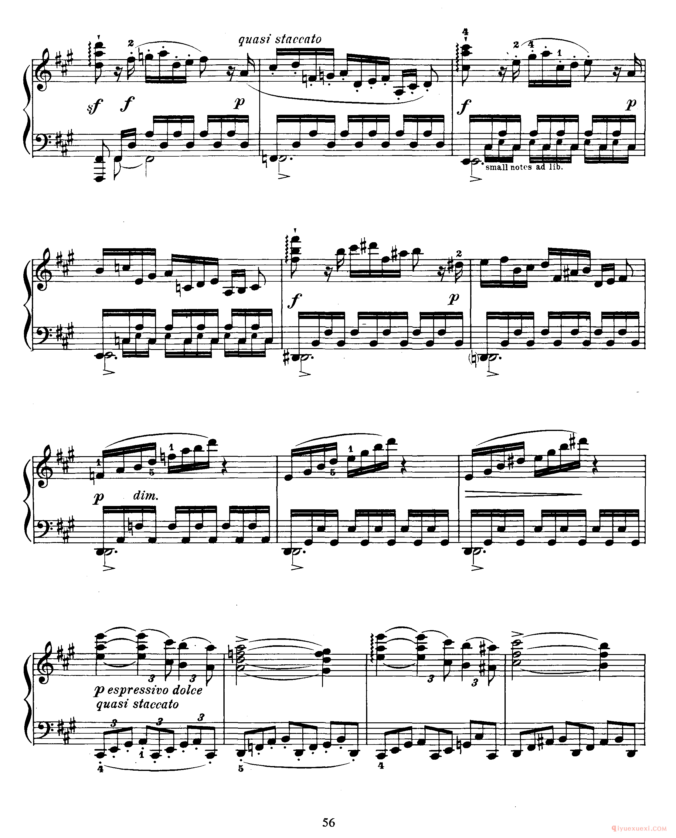 4.如歌的行板,升F小调的序奏到主部随意而从容的快板,奏鸣曲式。主部呈示部中,第一主题的赋格形成经过部。再现部强调了对位手法,最后以升F大调结尾。