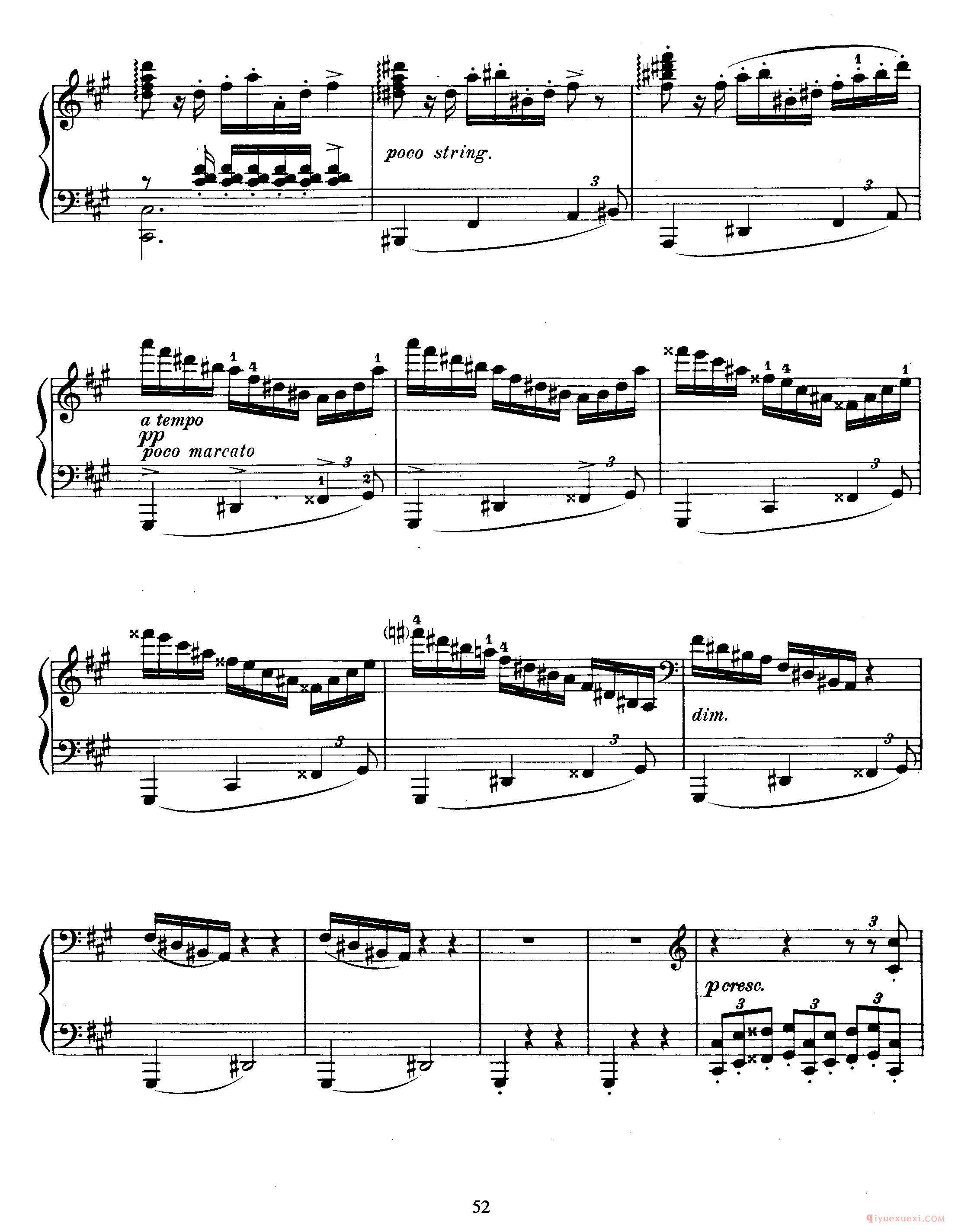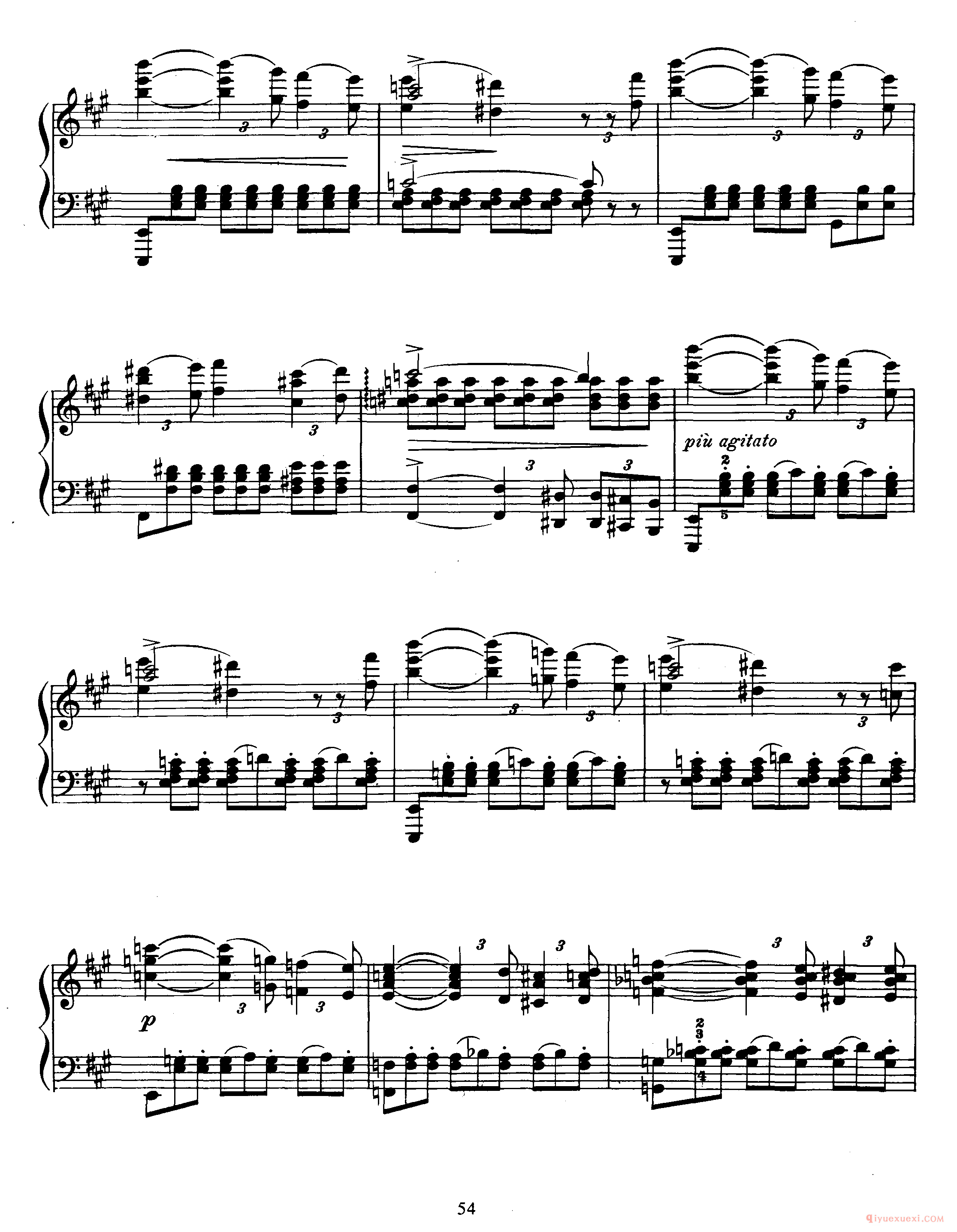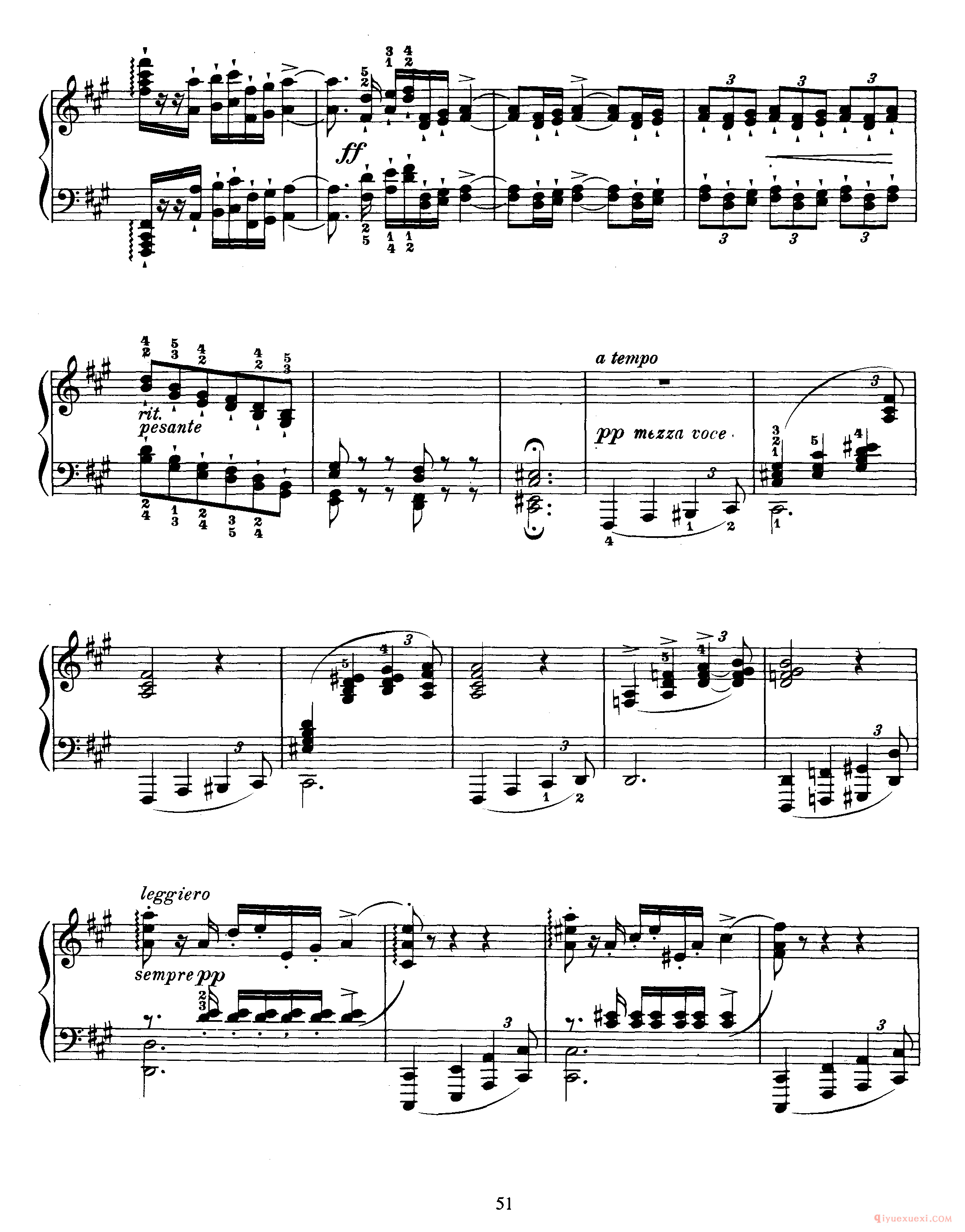 4.如歌的行板,升F小调的序奏到主部随意而从容的快板,奏鸣曲式。主部呈示部中,第一主题的赋格形成经过部。再现部强调了对位手法,最后以升F大调结尾。