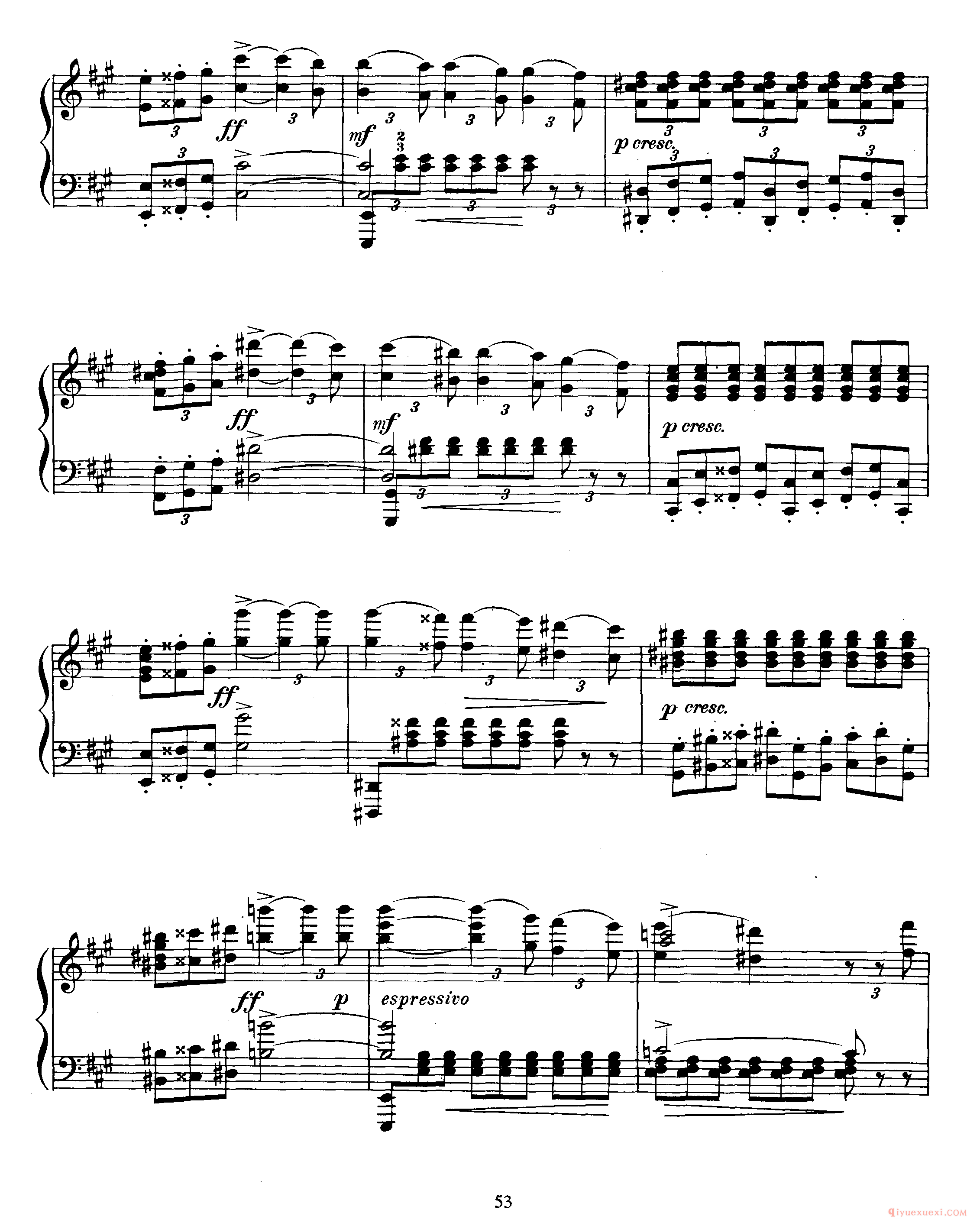 1.有力而从容的快板,升F小调,奏鸣曲式。以贝多芬风格紧张的第一主题开头,第二主题以升C小调的旋律作为对比。发展部先是两个主题分别的发展,然后再重合,以第一主题赋格发展。