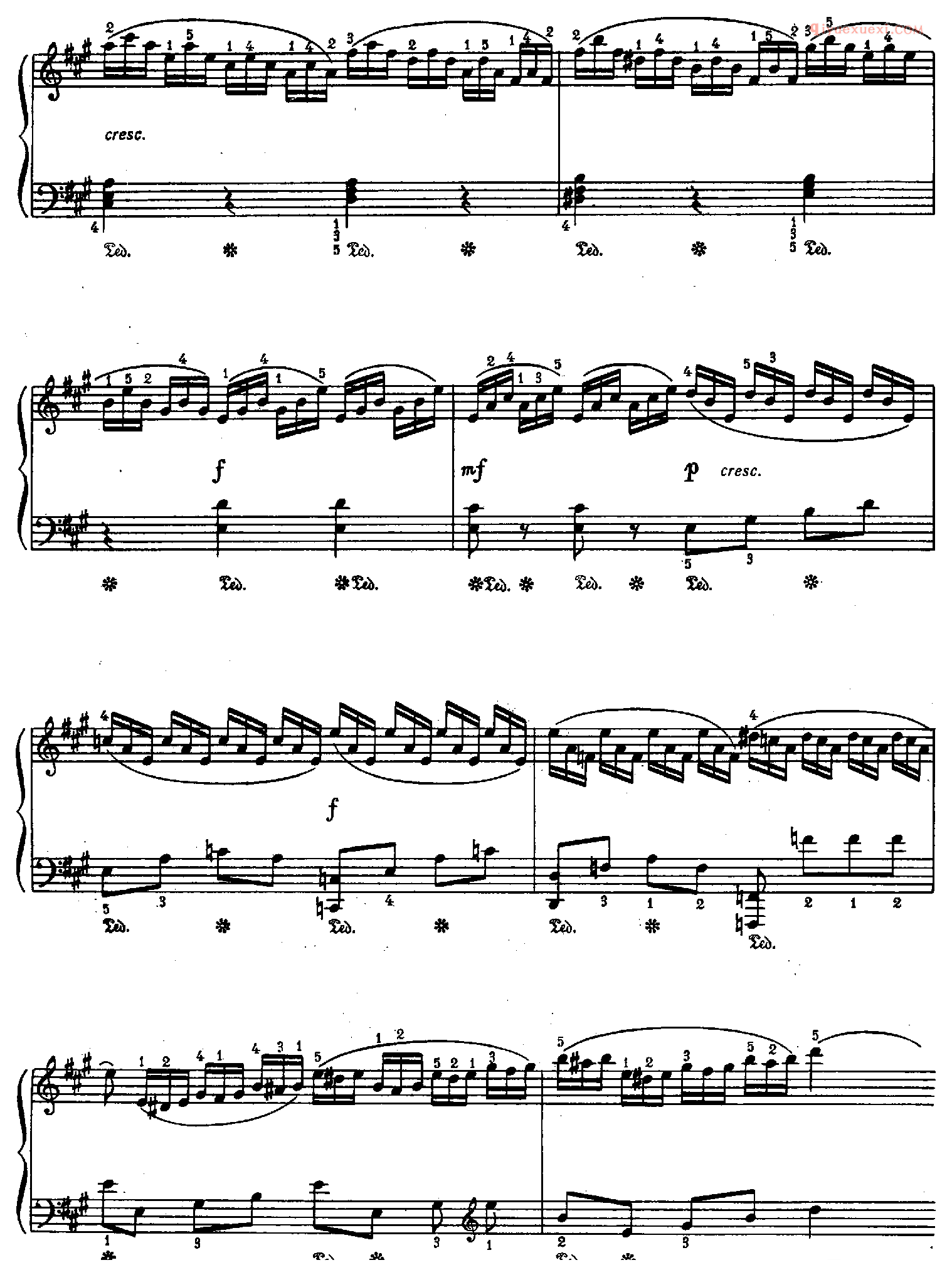 技巧: 1.这首作品和前面第八条的训练内容是一样的,都是音阶型的跑动练习,所不同的是这条练习曲以左手训练为主,左手需要注意的技巧要点和右手一样,仍然是换指动作的准确性。(具...