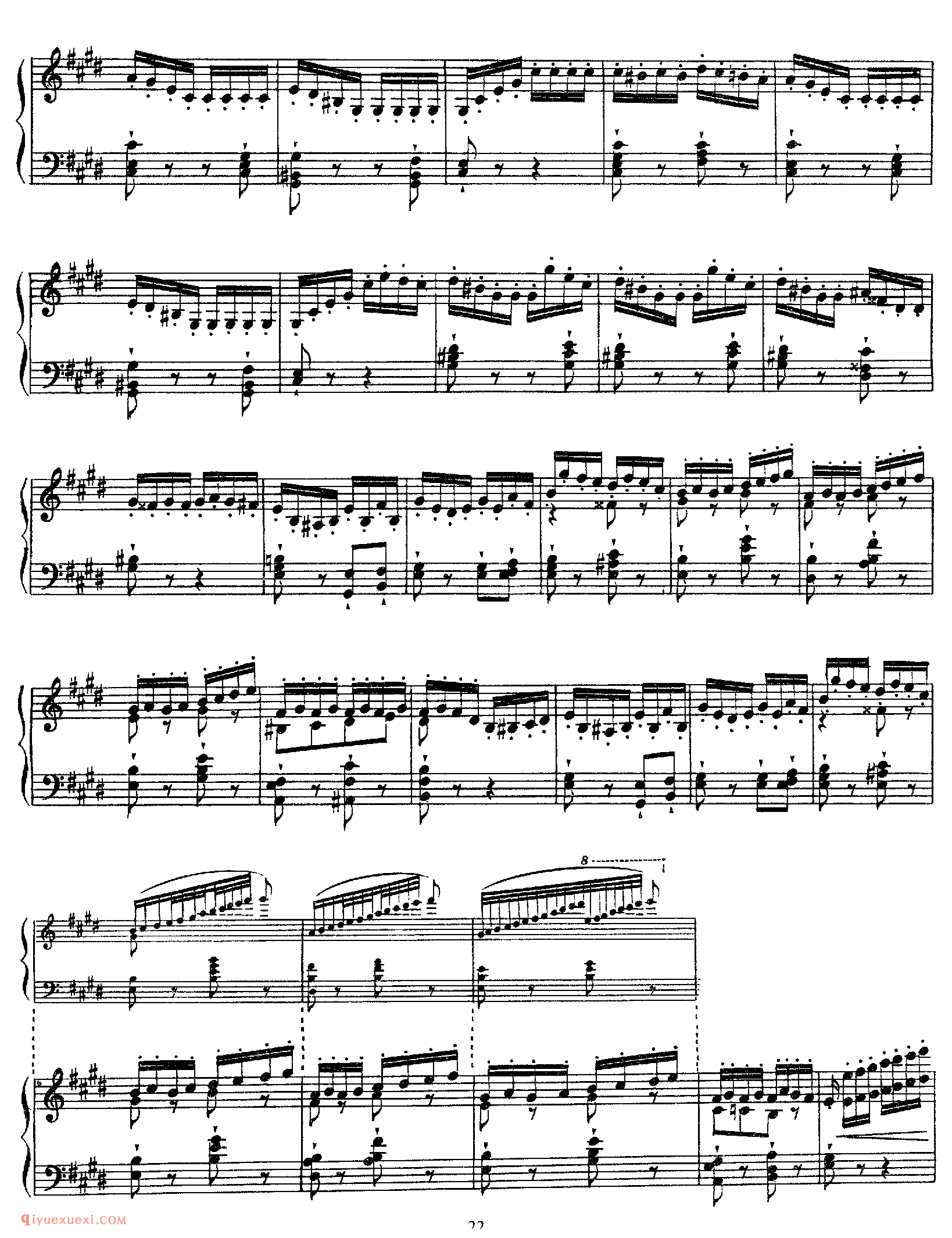 技巧: 1.这首作品和前面第八条的训练内容是一样的,都是音阶型的跑动练习,所不同的是这条练习曲以左手训练为主,左手需要注意的技巧要点和右手一样,仍然是换指动作的准确性。(具...