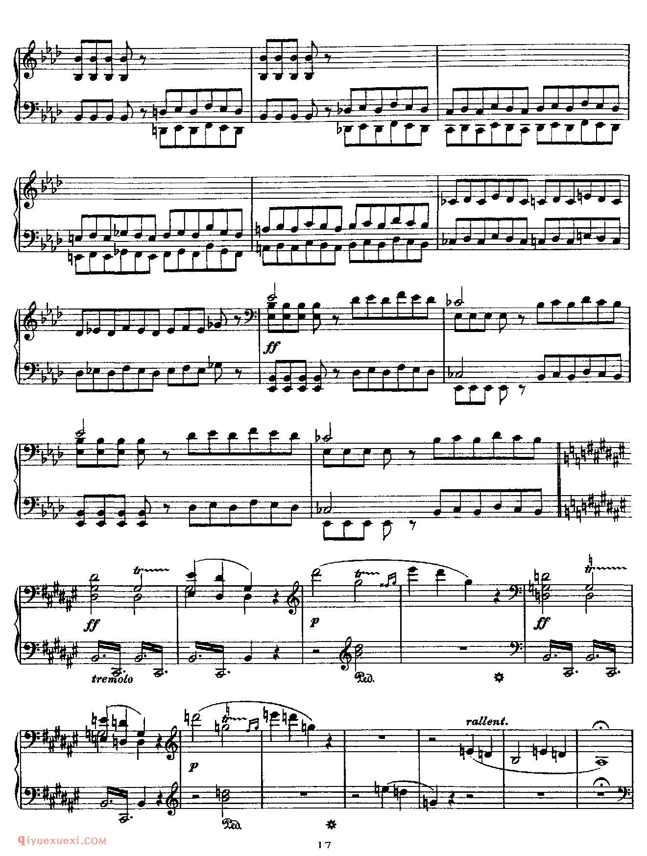 这首乐曲的左手弹奏时,小指既要站稳、保持,大指和三指又可略带轻微地带动手掌的翻动动作, 值得注意的是,19世纪的装饰音往往是在强拍之前弹奏的。因此第11小节的装饰音可从前一小节...
