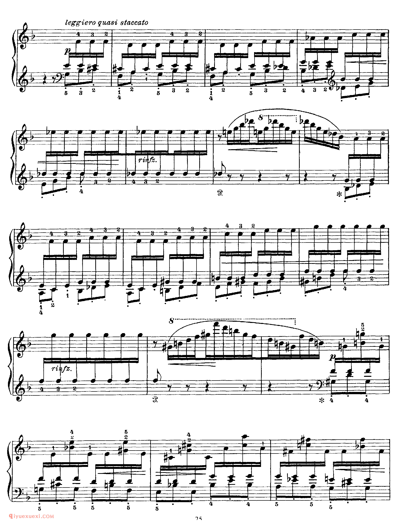 技巧: 1.这首作品和前面第八条的训练内容是一样的,都是音阶型的跑动练习,所不同的是这条练习曲以左手训练为主,左手需要注意的技巧要点和右手一样,仍然是换指动作的准确性。(具...
